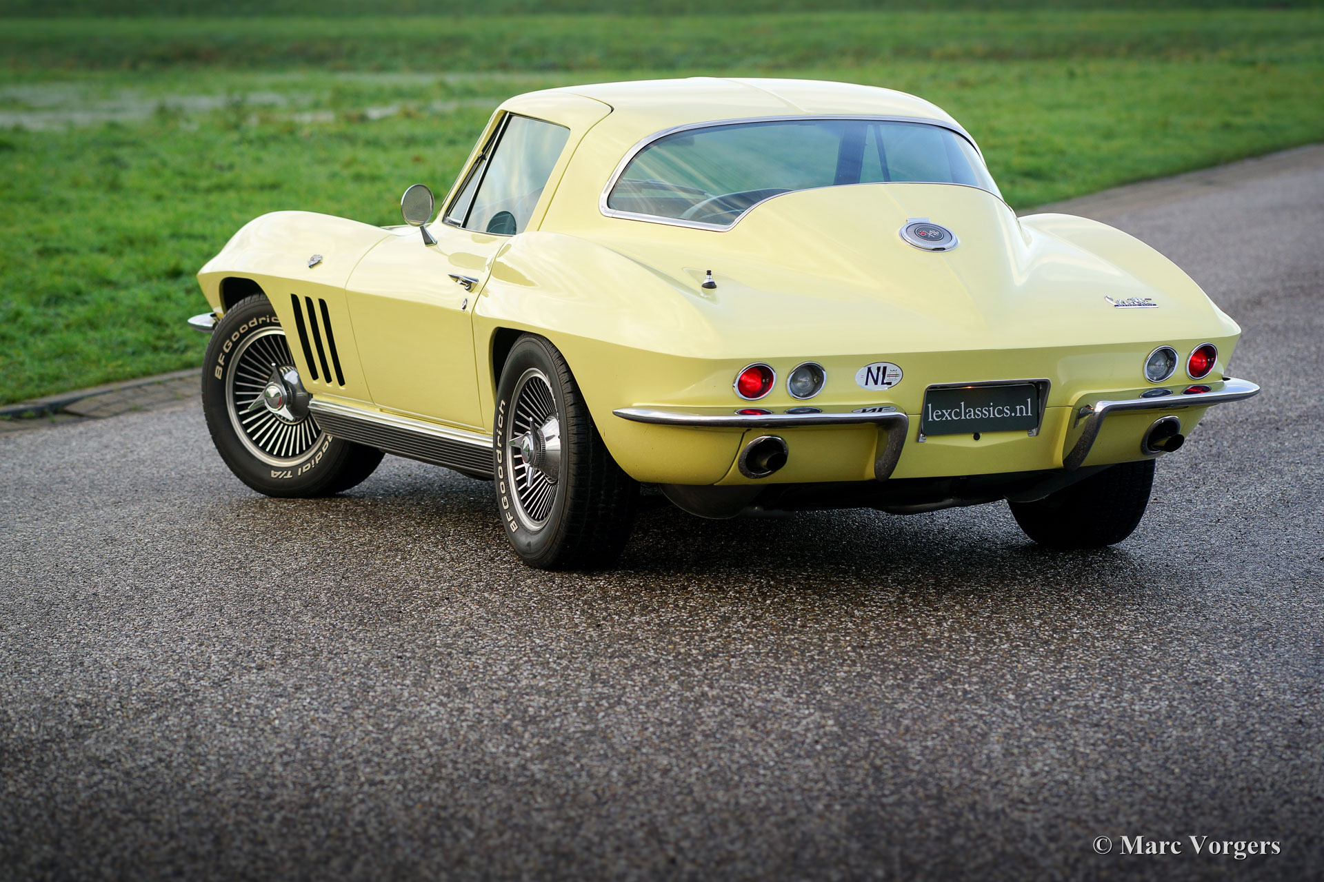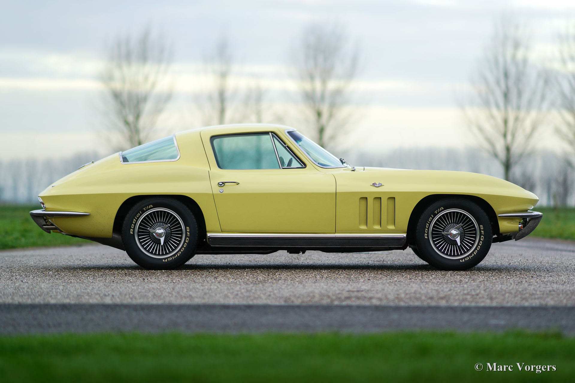 Chevrolet Corvette C2, jaar 1966. Kleur pastel geel met een zwart interieur. Deze prachtige Chevrolet Corvette verkeert in sublieme topstaat; concours! Er zijn in 1966 9.958 exemplaren van dit type gebouwd. De auto is voorzien van een 5.4 liter V8 motor van 350 pk en een handgeschakelde vierversnellingsbak.