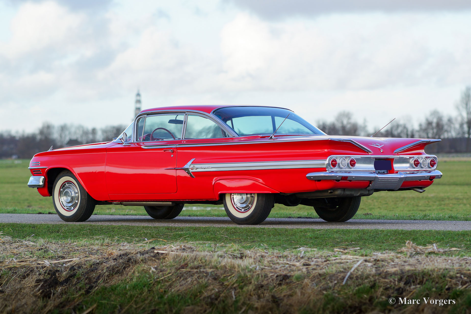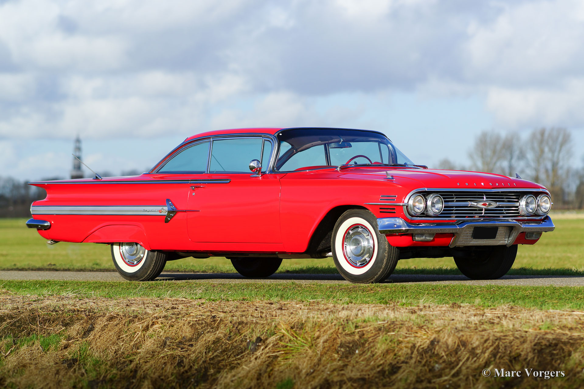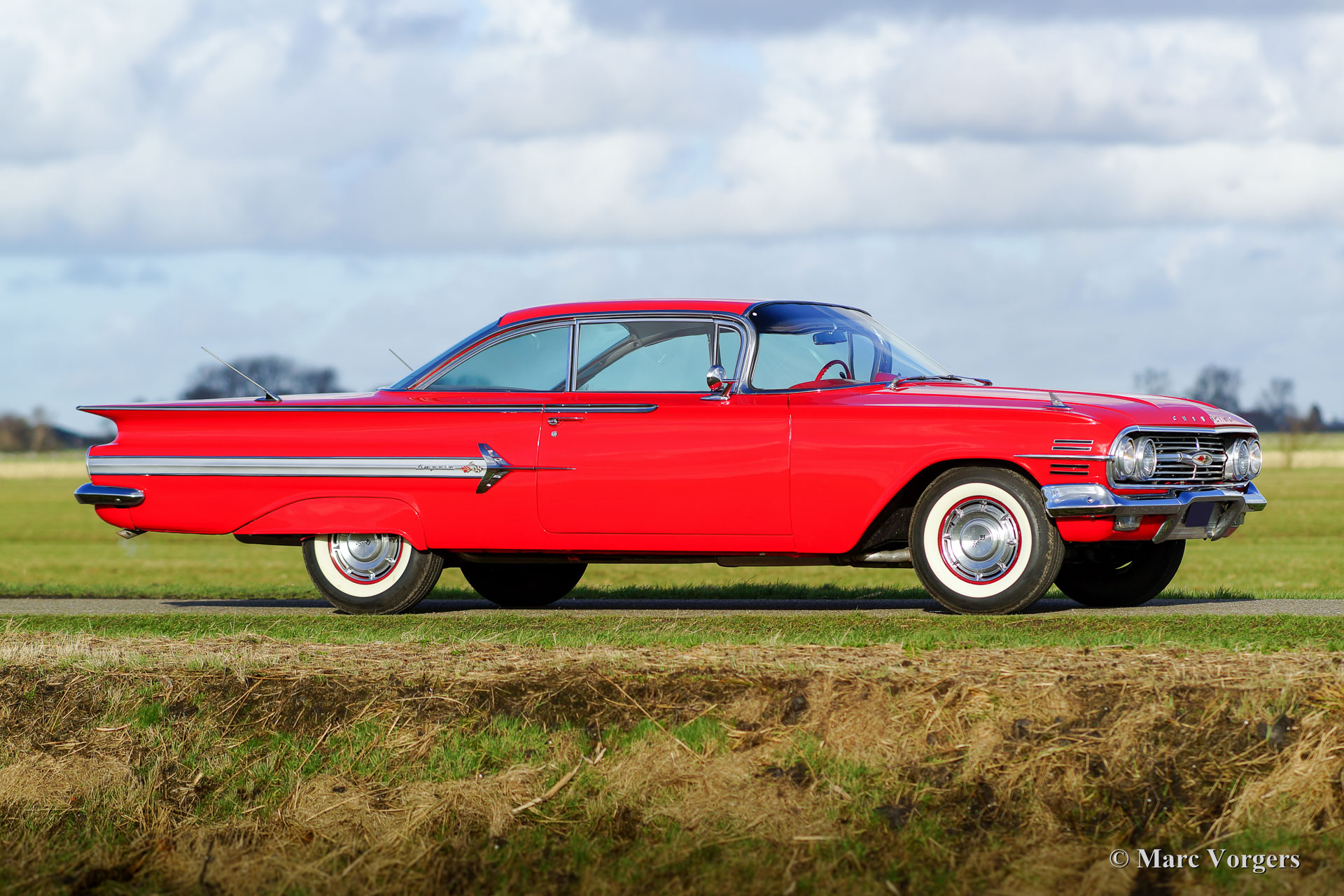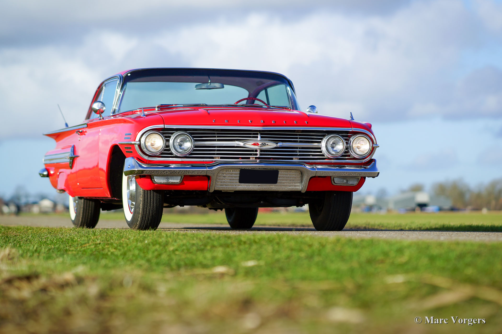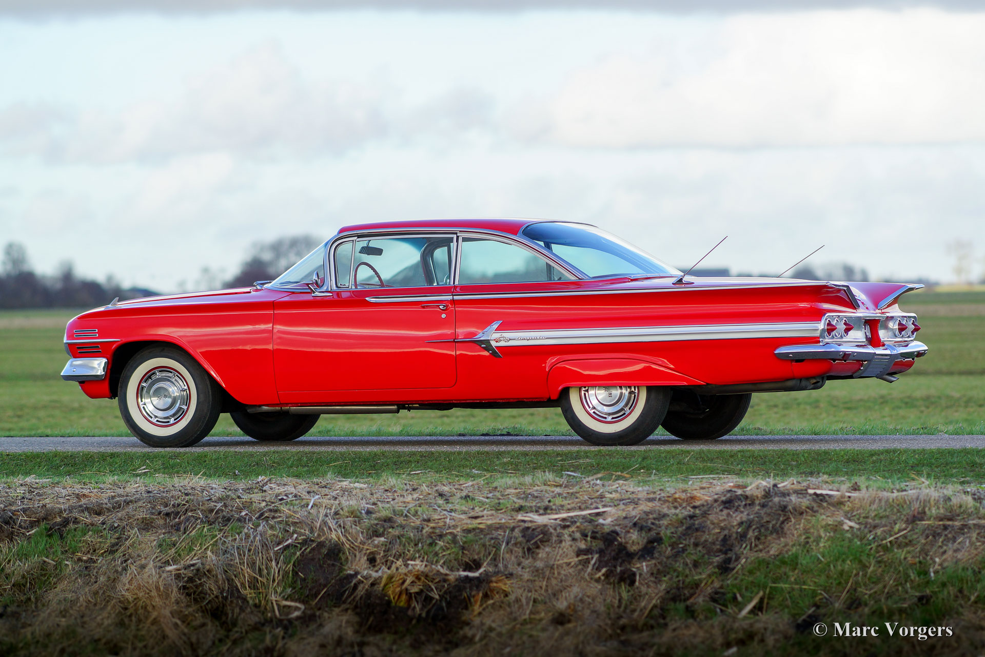 Chevrolet Impala Coupe, jaar 1960. Kleur rood met een rood/wit kunstleren interieur. Deze machtige Amerikaan uit de ‘Rock & Roll’ periode is nieuw verkocht in de USA. In de jaren 1990 is de auto ingevoerd in Nederland. In Nederland is de auto voorzien van nieuwe lak en werd de auto technisch verbeterd. Deze prachtige Impala verkeert dan ook in een zeer goede en zeer originele staat! Alle originele details zijn aanwezig, je raakt er niet op uitgekeken! De auto rijdt zoals het een Amerikaan betaamd; heerlijk comfortabel ‘cruisen’ met de geweldige V8-sound op de achtergrond. Route 66 here we come!