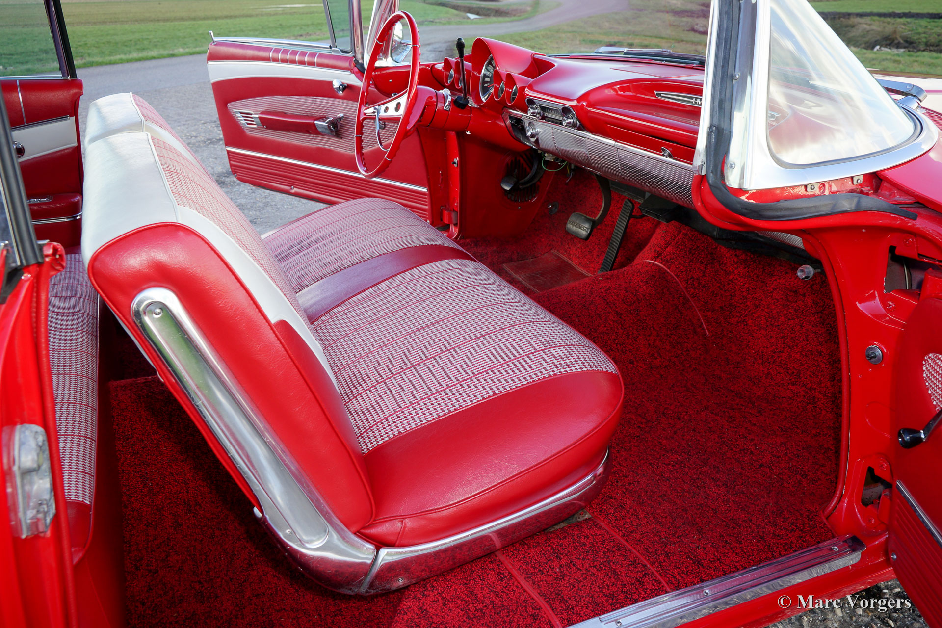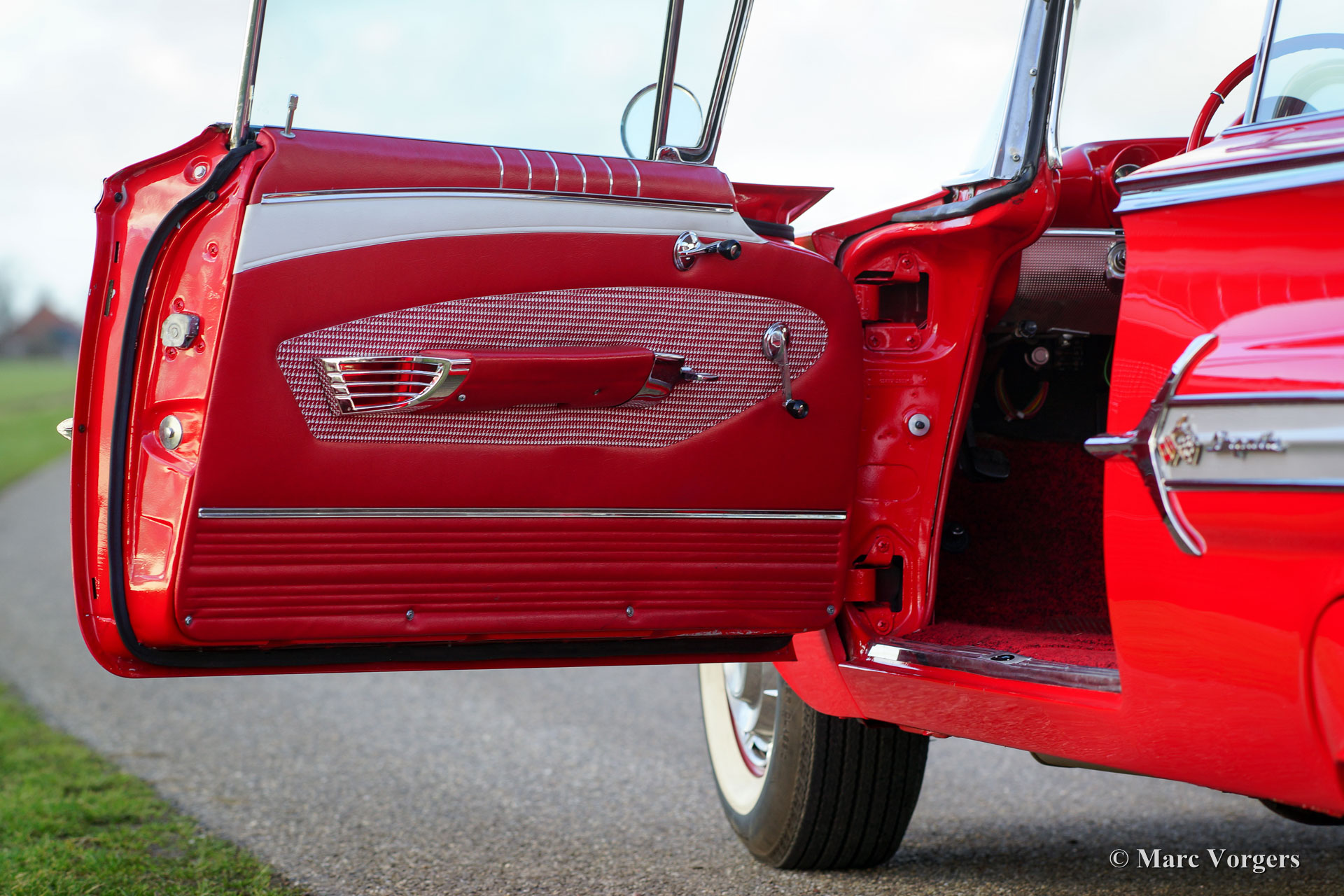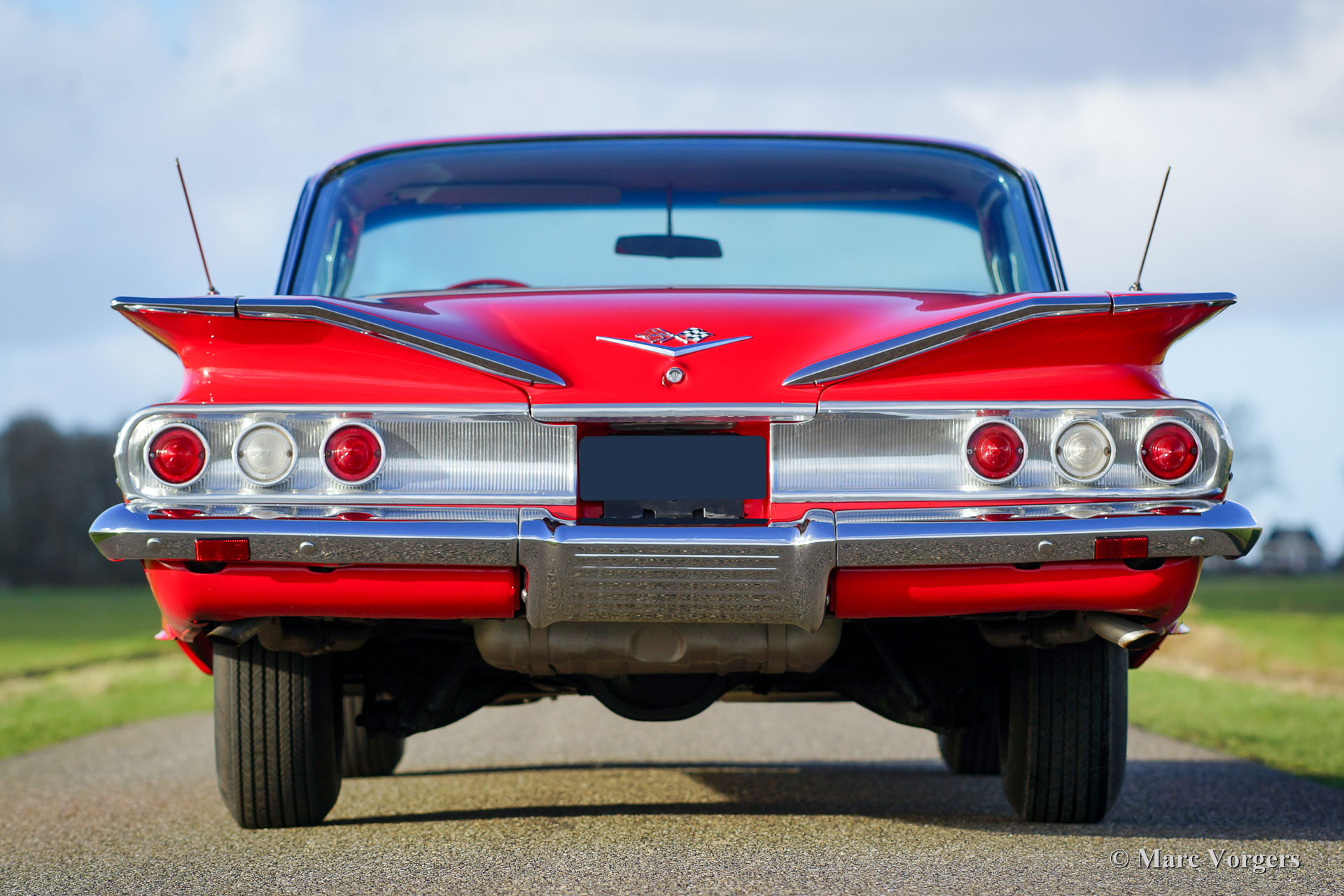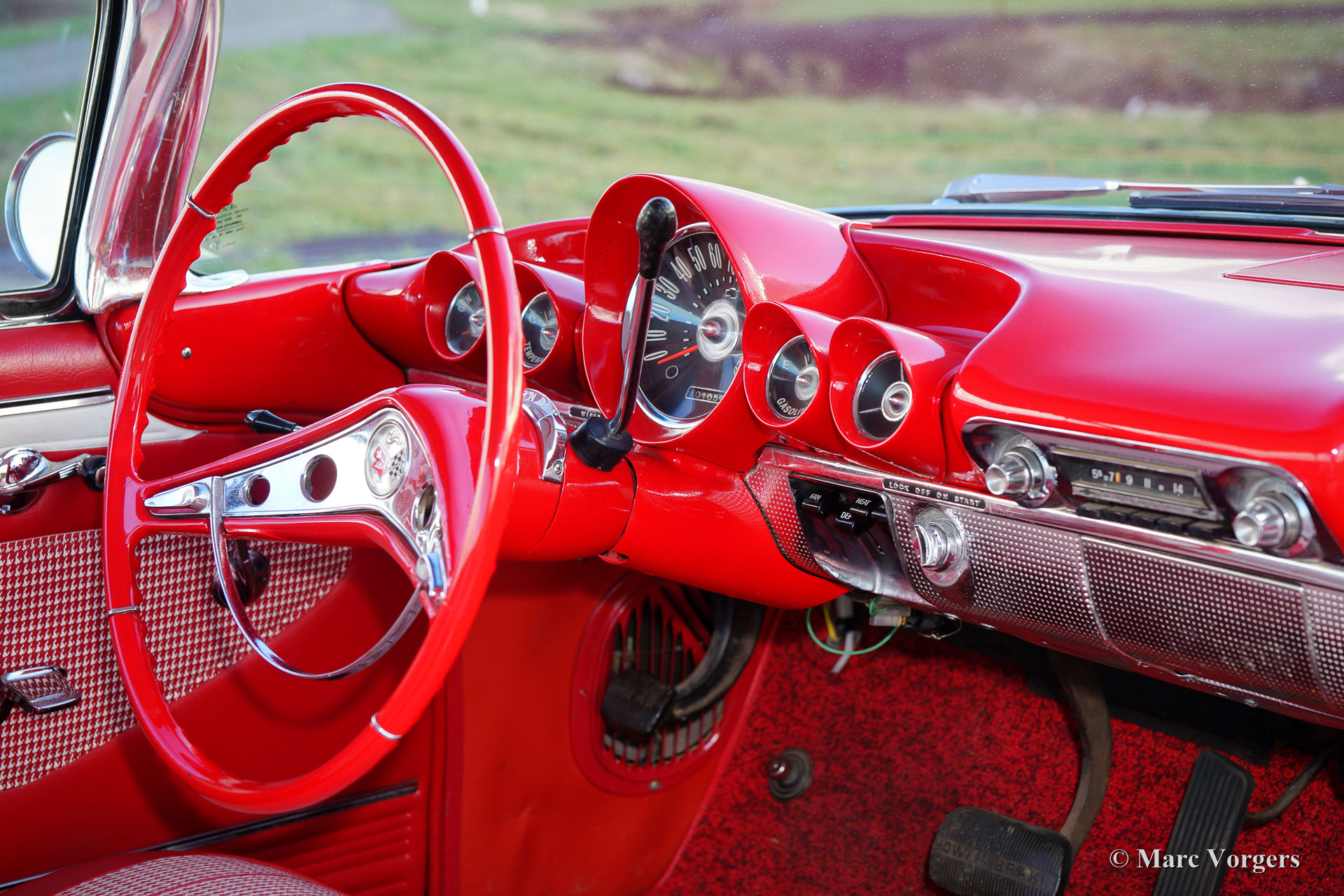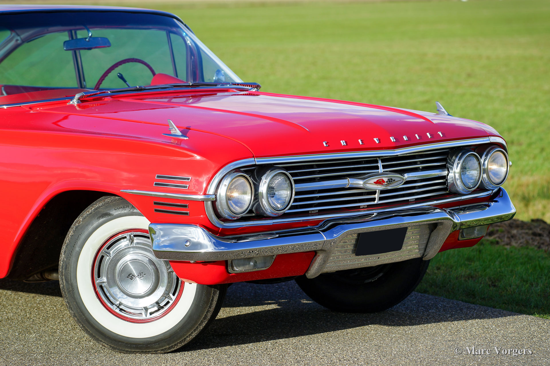 Chevrolet Impala Coupe, jaar 1960. Kleur rood met een rood/wit kunstleren interieur. Deze machtige Amerikaan uit de ‘Rock & Roll’ periode is nieuw verkocht in de USA. In de jaren 1990 is de auto ingevoerd in Nederland. In Nederland is de auto voorzien van nieuwe lak en werd de auto technisch verbeterd. Deze prachtige Impala verkeert dan ook in een zeer goede en zeer originele staat! Alle originele details zijn aanwezig, je raakt er niet op uitgekeken! De auto rijdt zoals het een Amerikaan betaamd; heerlijk comfortabel ‘cruisen’ met de geweldige V8-sound op de achtergrond. Route 66 here we come!