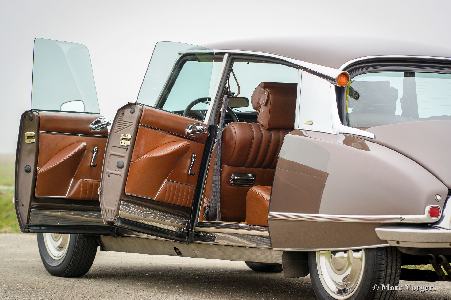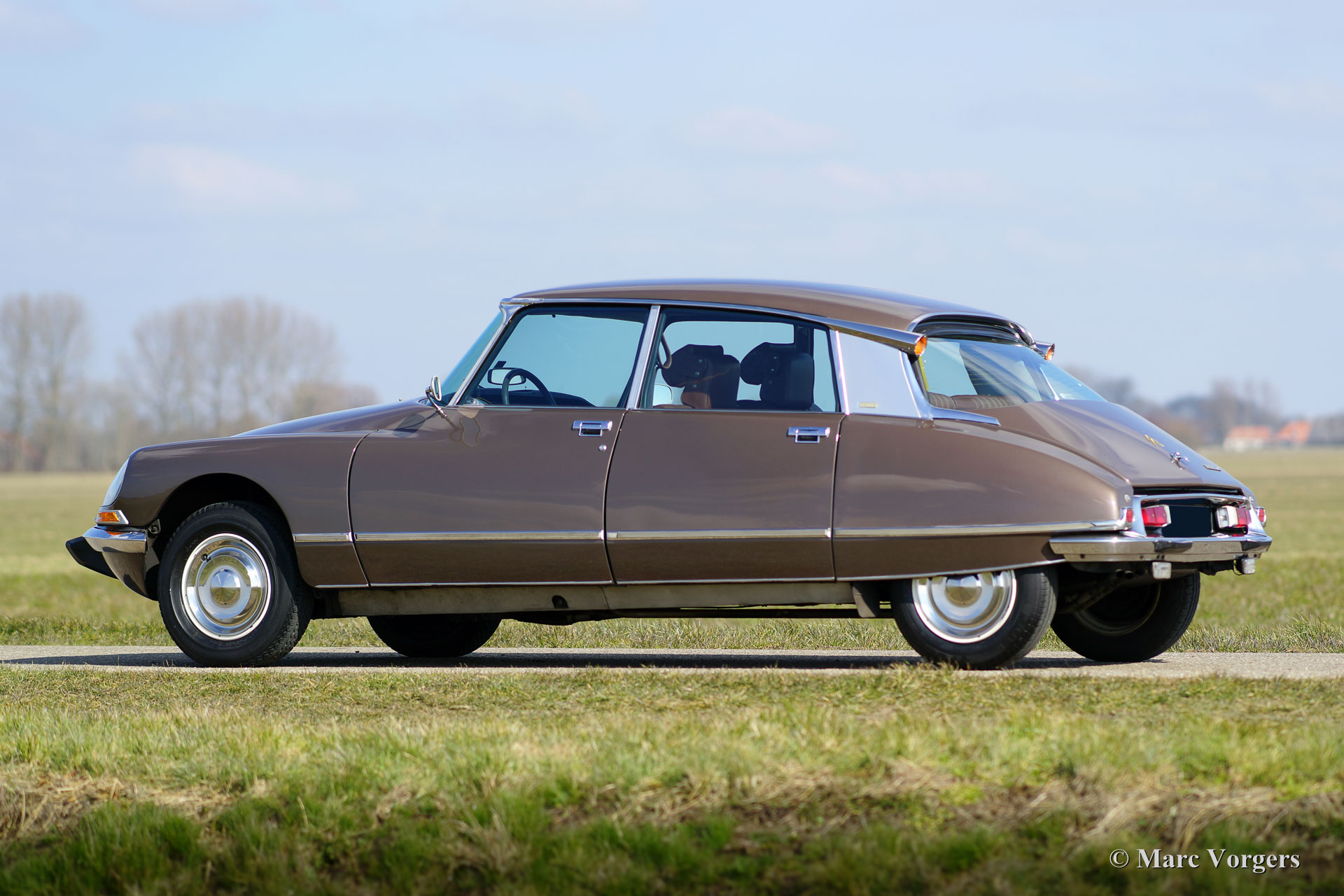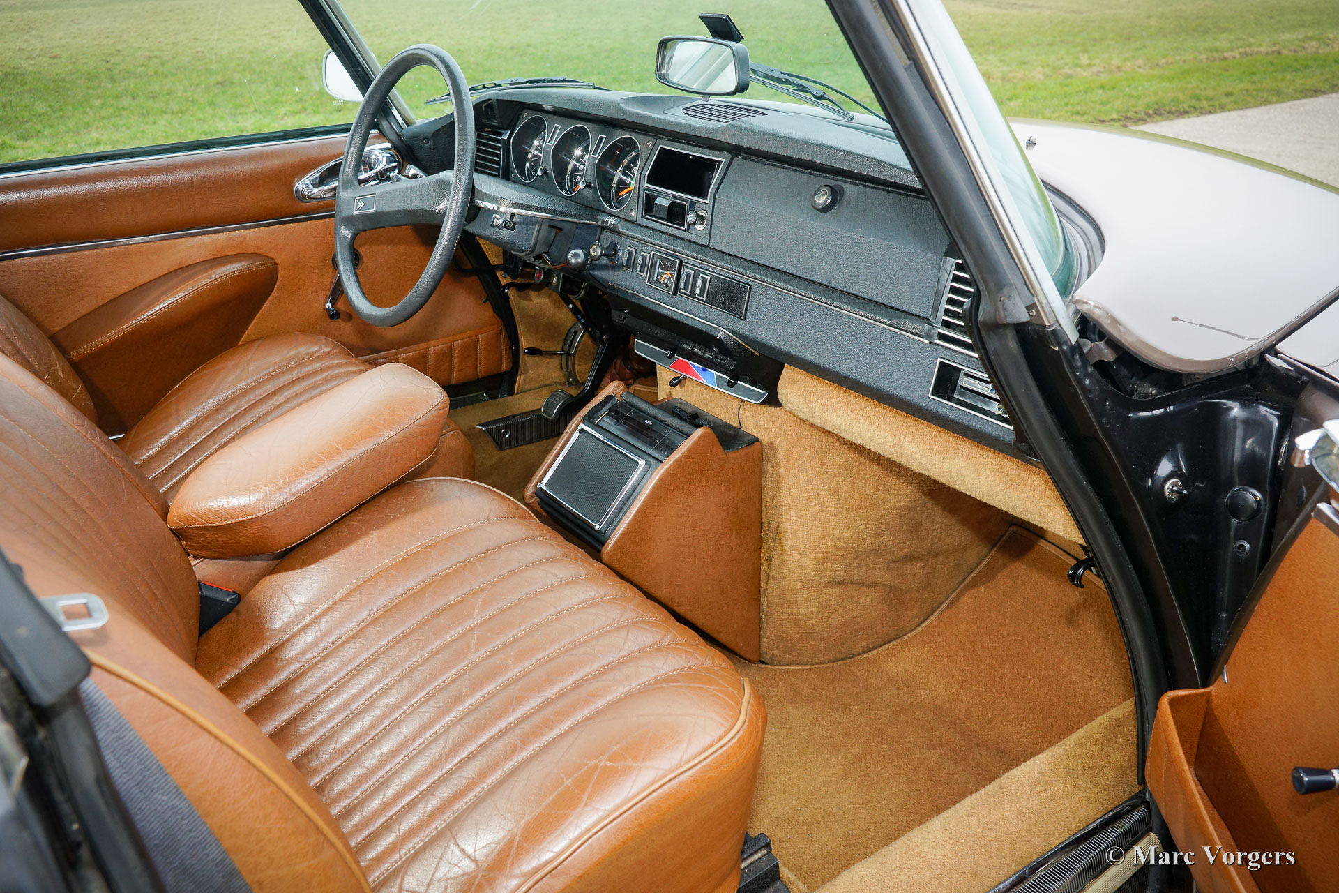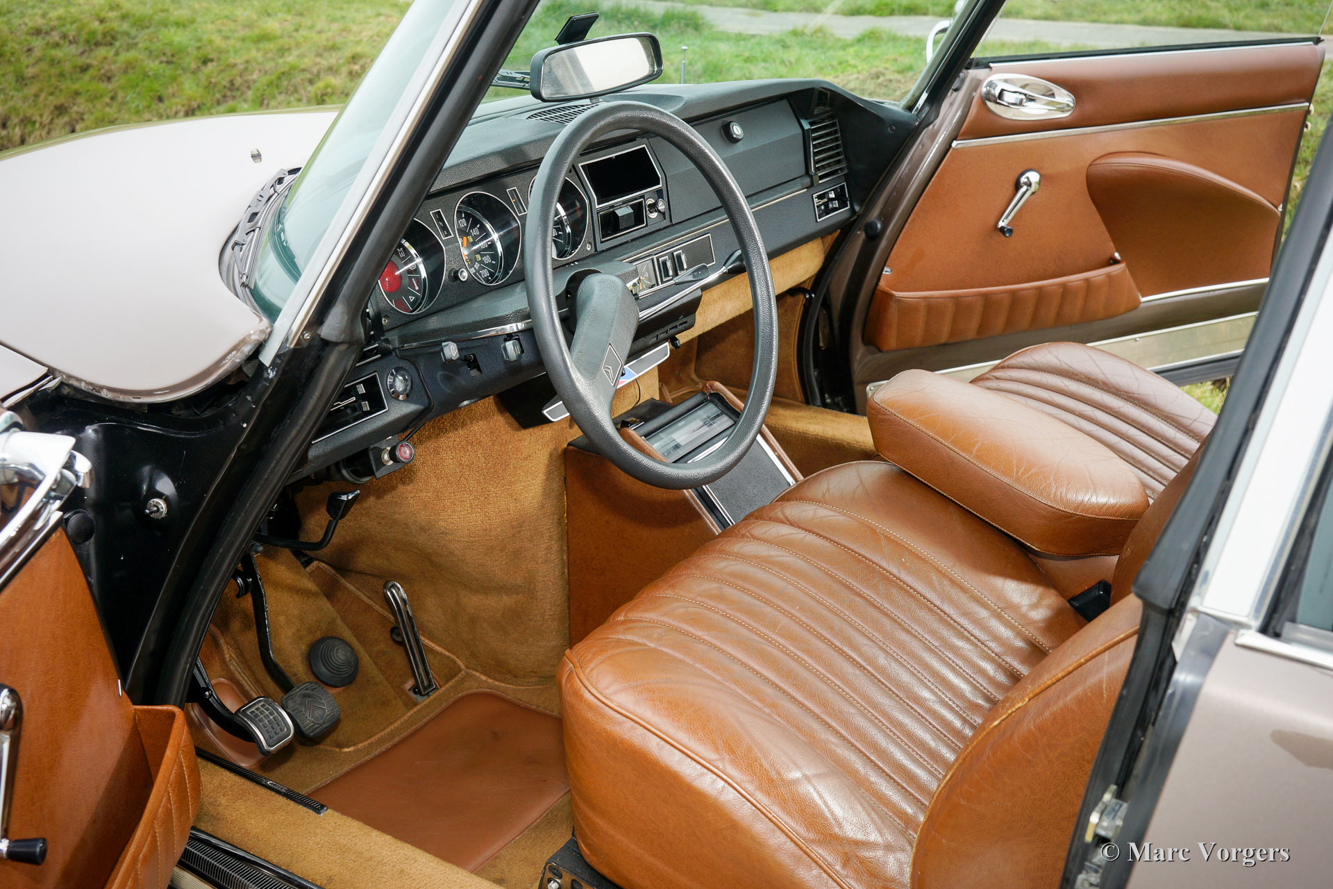 Citroën DS 23 M Pallas, jaar 1973. Kleur Brun Scarabé met een bruin vol-lederen interieur. Deze geweldige Citroën DS 23 verkeert in excellente originele staat! Er werd nooit aan de auto gelast, de auto werd in het verleden slechts voorzien van nieuwe lak. Vanaf nieuw heeft deze DS Pallas 116.000 kilometer gereden; deze automobiel rijdt werkelijk perfect! De auto is voorzien van een heerlijk schakelende vijfversnellingsbak en Michelin banden. De auto is compleet met het originele instructieboekje, origineel garantiebewijs en het originele boordgereedschap! Een prachtige en zeer luxueuze DS Pallas in een fraaie kleurcombinatie.