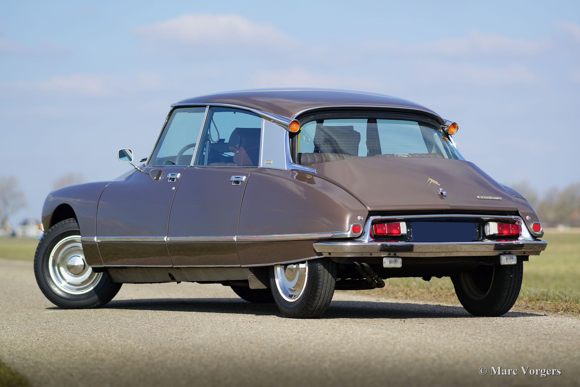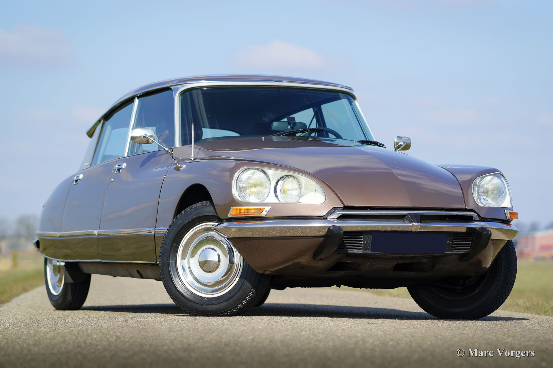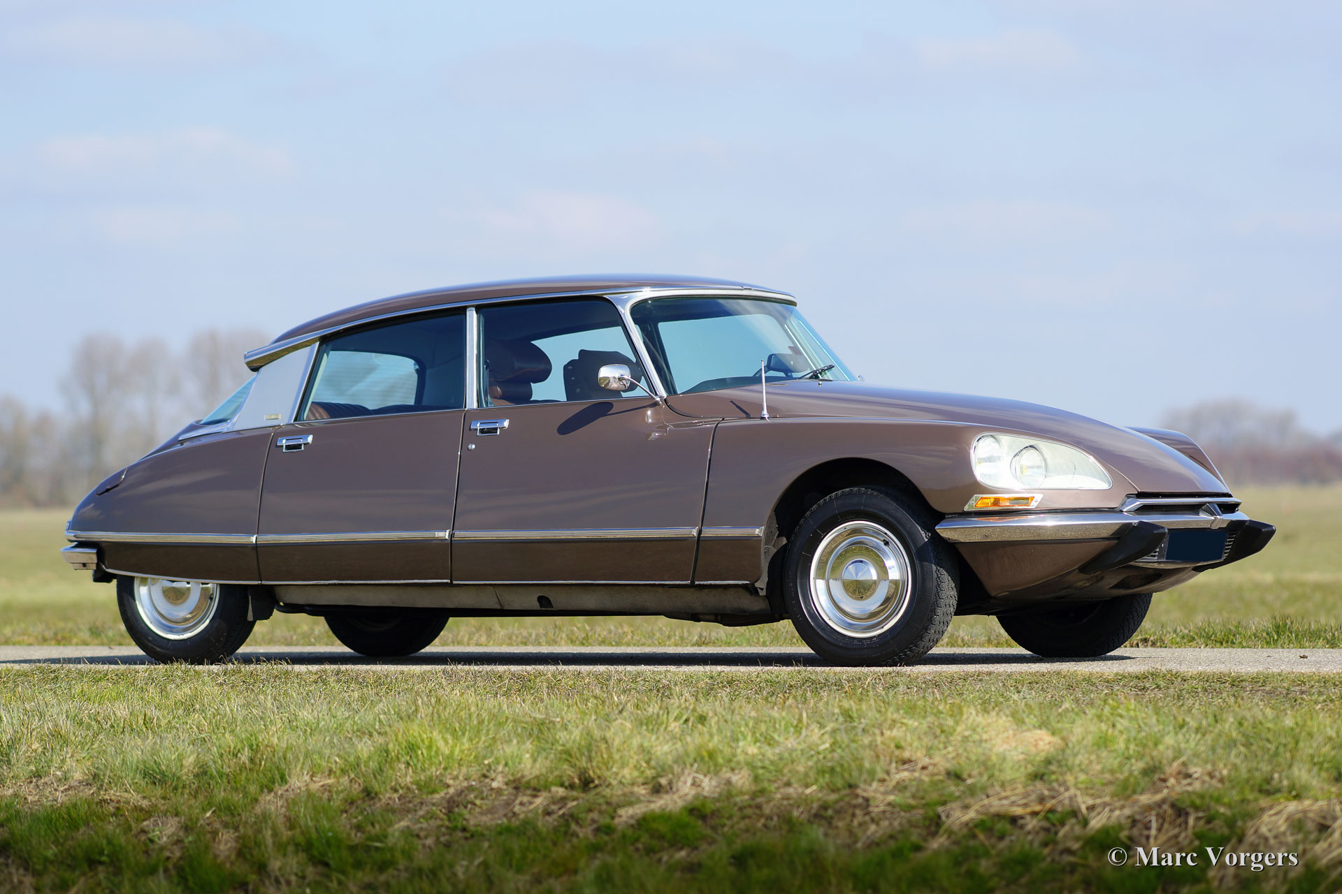 Citroën DS 23 M Pallas, jaar 1973. Kleur Brun Scarabé met een bruin vol-lederen interieur. Deze geweldige Citroën DS 23 verkeert in excellente originele staat! Er werd nooit aan de auto gelast, de auto werd in het verleden slechts voorzien van nieuwe lak. Vanaf nieuw heeft deze DS Pallas 116.000 kilometer gereden; deze automobiel rijdt werkelijk perfect! De auto is voorzien van een heerlijk schakelende vijfversnellingsbak en Michelin banden. De auto is compleet met het originele instructieboekje, origineel garantiebewijs en het originele boordgereedschap! Een prachtige en zeer luxueuze DS Pallas in een fraaie kleurcombinatie.