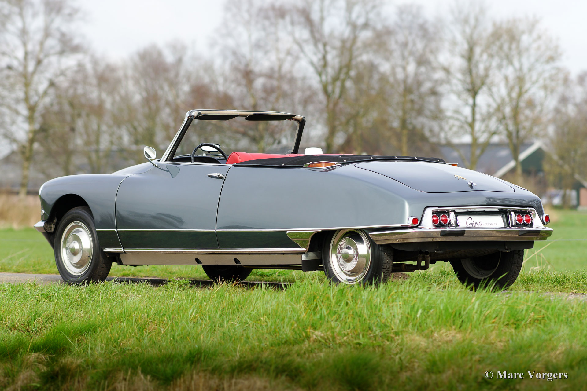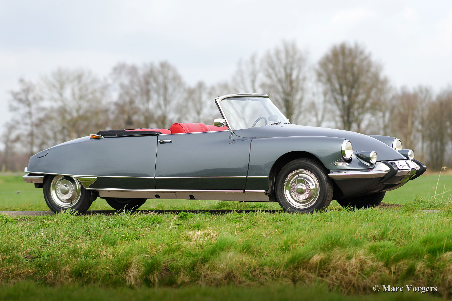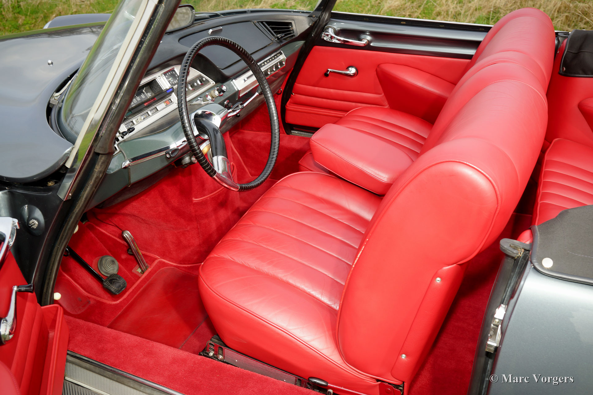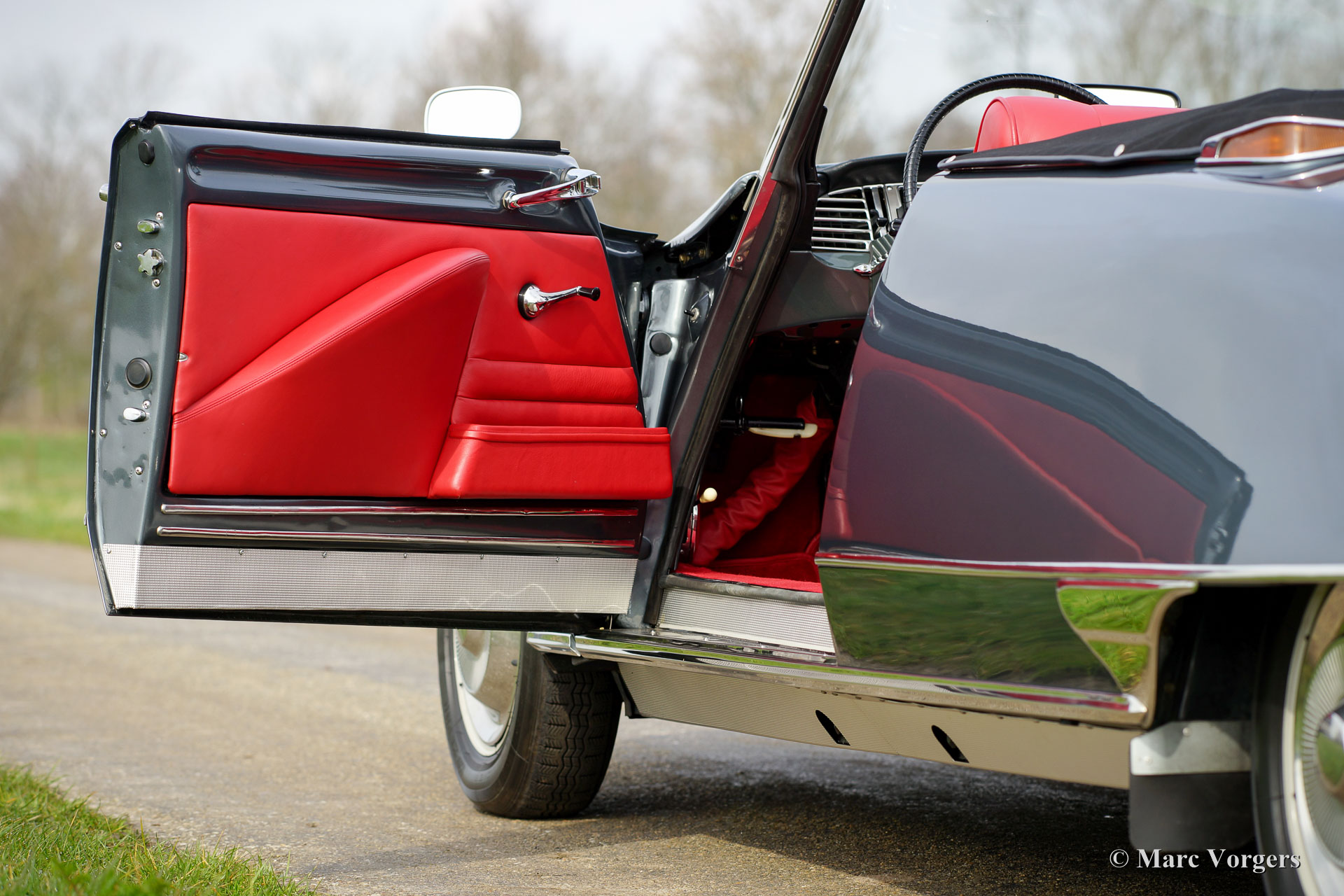 Citroën DS19 cabriolet, jaar 1963. Kleur donkergrijs metallic met een roodlederen interieur en rood tapijt. Zwarte cabrioletkap en kapafdekking. Het betreft een prachtige en perfecte replica van een Citroën DS19 Cabriolet ‘Usine’; bijna niet van echt te onderscheiden.