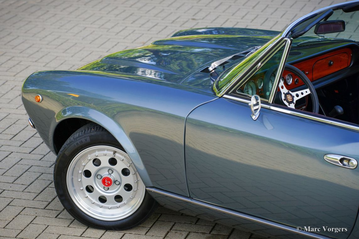 Fiat 124 Spider 2000 (CS2), jaar 1980. Kleur grijs metallic gecombineerd met een donkerrood lederen interieur afgewerkt met zwart tapijt. Cabriokap van zwart mohair. Deze schitterende Fiat 124 2000 Spider is in het jaar 2020 naar Nederland geïmporteerd. Begin 2021 is de auto voorzien van prachtige nieuwe lak, zijn de motor en versnellingsbak gereviseerd, zijn de remmen gereviseerd en is de ophanging iets verlaagd. Er zijn nieuwe Weber IDF40 carburateurs gemonteerd, die op een rollenbank zijn afgesteld. Verder zijn de standaard bumpers verwijderd en vervangen door Abarth stijl bumperettes, zijn er nieuwe Abarth wielen gemonteerd met nieuwe Continental 195/50 15 banden en is er een nieuwe RVS uitlaat gemonteerd. Ook is er een nieuw dashboard gemonteerd, is het elektrisch systeem teruggebracht naar de originele specificaties en heeft de carrosserie een Dinitrol anti-corrosiebehandeling gekregen. Er is recent veel geld geïnvesteerd om deze fantastische Fiat 124 2000 Spider naar topconditie te brengen! Alles is up-to-date en de auto kan met volle teugen worden genoten door een nieuwe eigenaar. De auto rijdt, stuurt en klinkt geweldig! De teller staat momenteel op 74.166 kilometer. De auto wordt compleet geleverd met facturen waarin alle uitgevoerde werkzaamheden en gemonteerde onderdelen beschreven zijn. Een rollenbank test document is ook aanwezig. Voor deze auto is het gebruik van de kleine Nederlandse kentekenplaat model 18.2 toegestaan. Dit is een fantastische Fiat 124 Spider 2000 in topconditie!