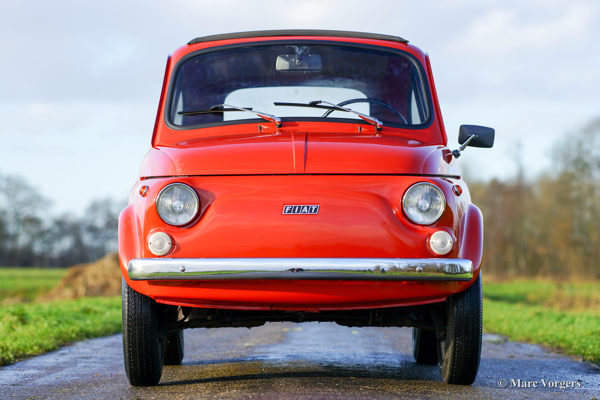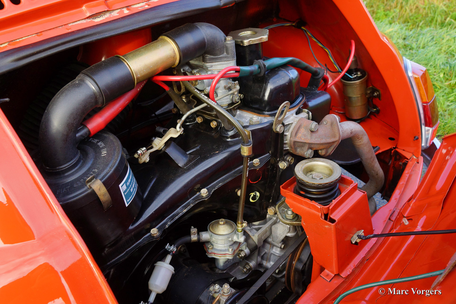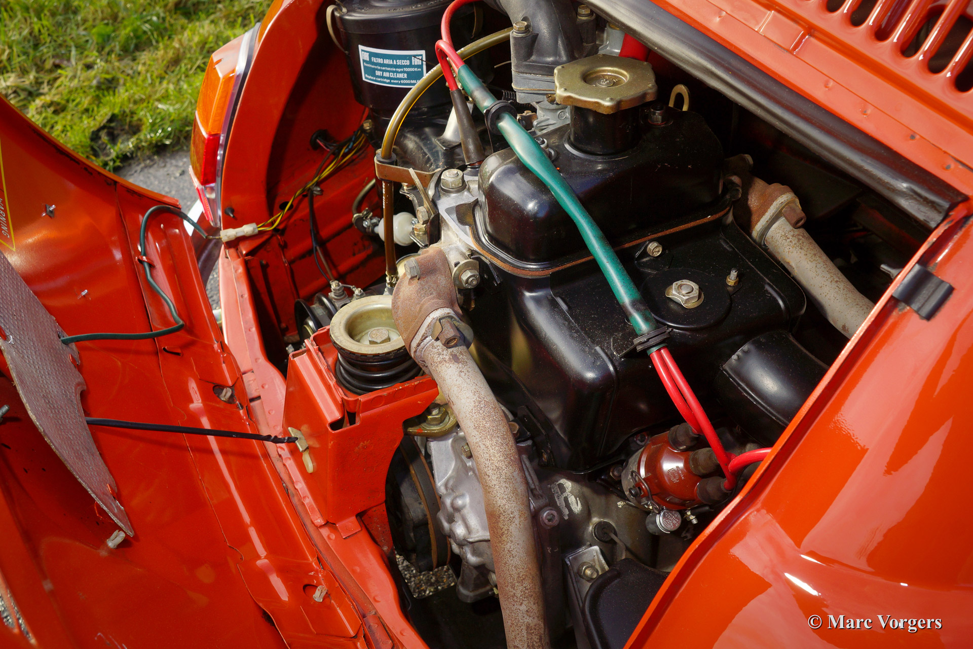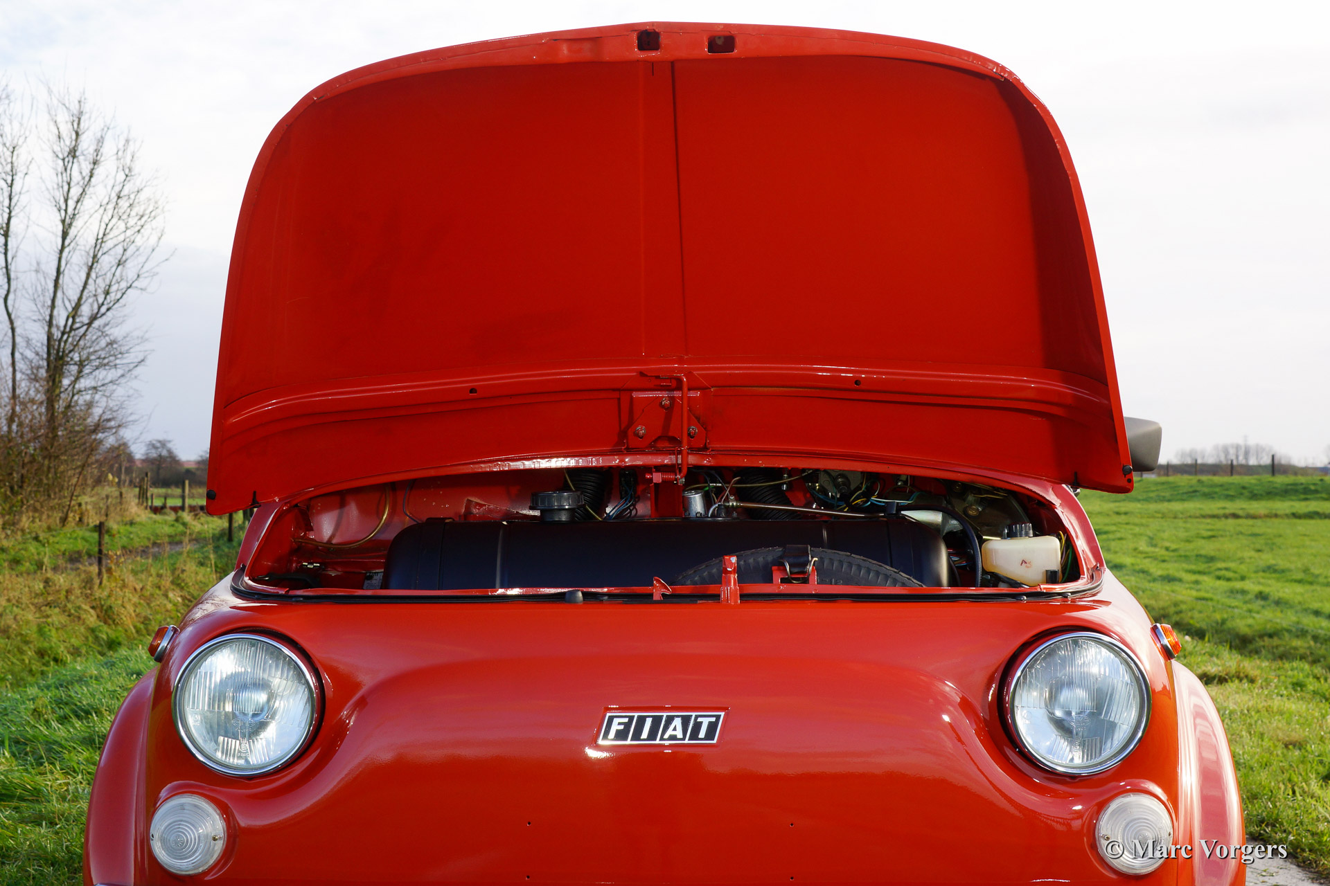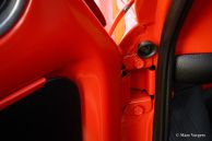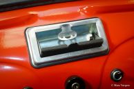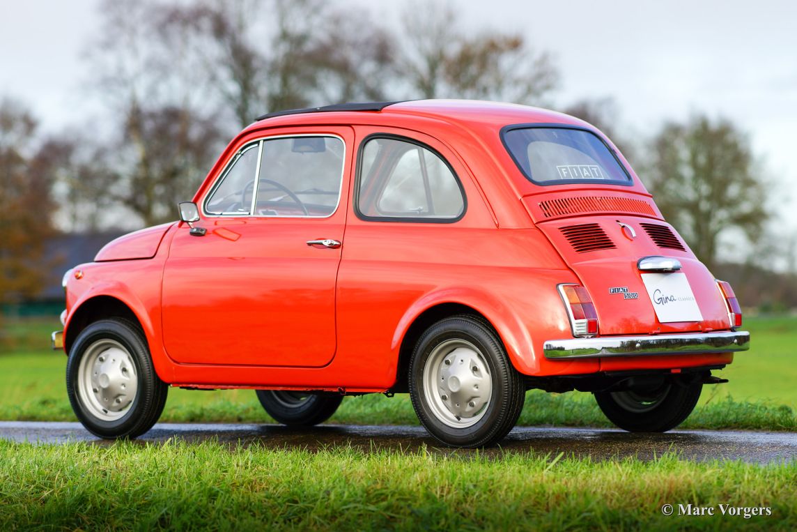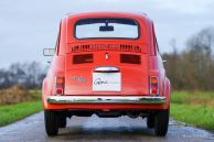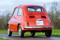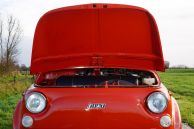 Fiat 500 R, bouwjaar 1975. Kleur rood (Rosso Corallo Scuro). Zwart interieur met zwarte kunstlederen bekleding en zwart rubber vloerbedekking. Deze Fiat ‘Cinquecento’ is een bijzonder juweel. De conditie van de auto is de droom van menig verzamelaar: volledig originele concoursstaat met 100% originele lak en zelfs nog uitgerust met de originele banden! Deze Fiat werd gebouwd in het laatste jaar van productie (1975).