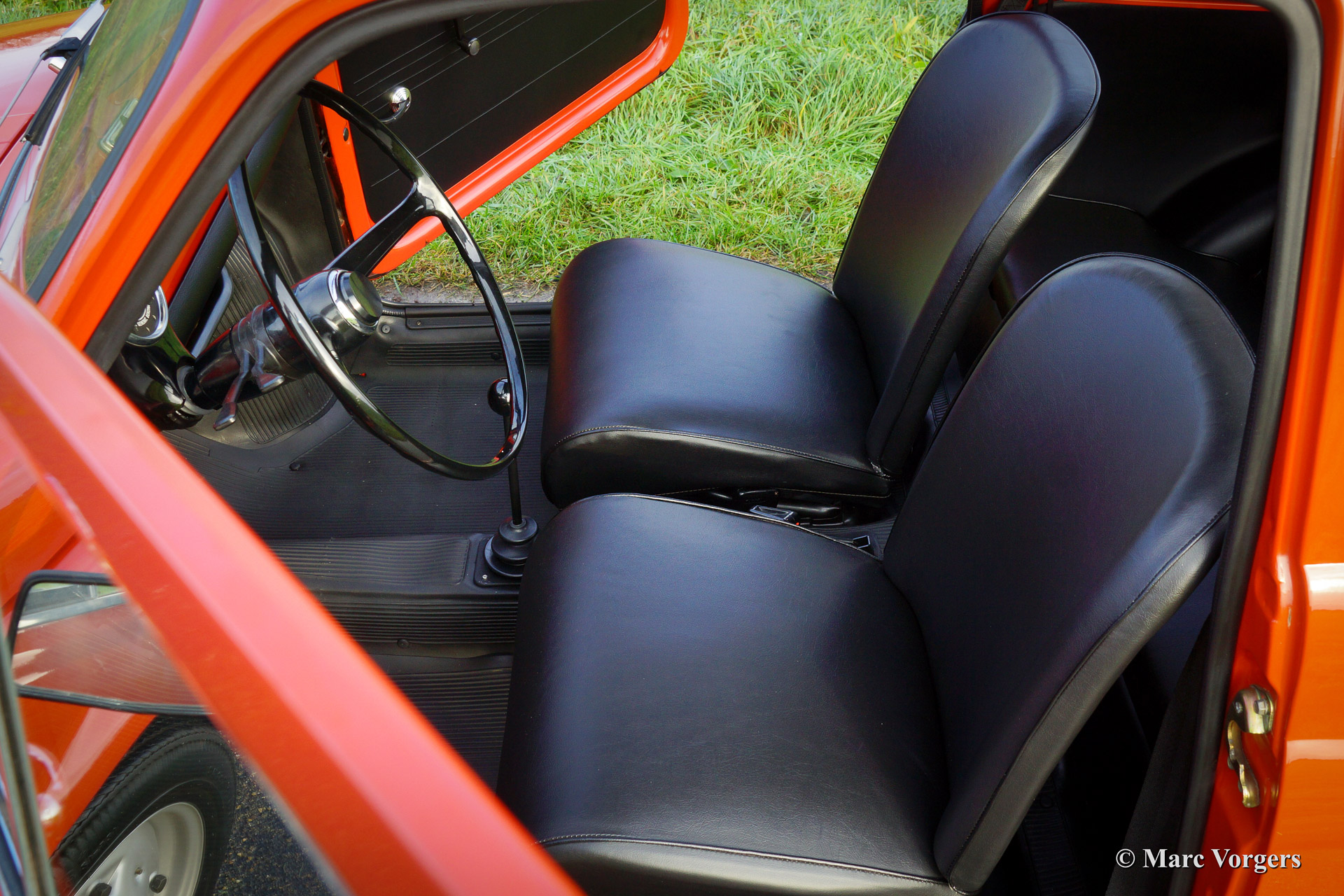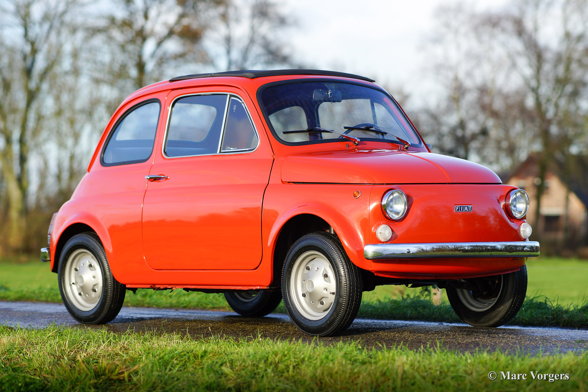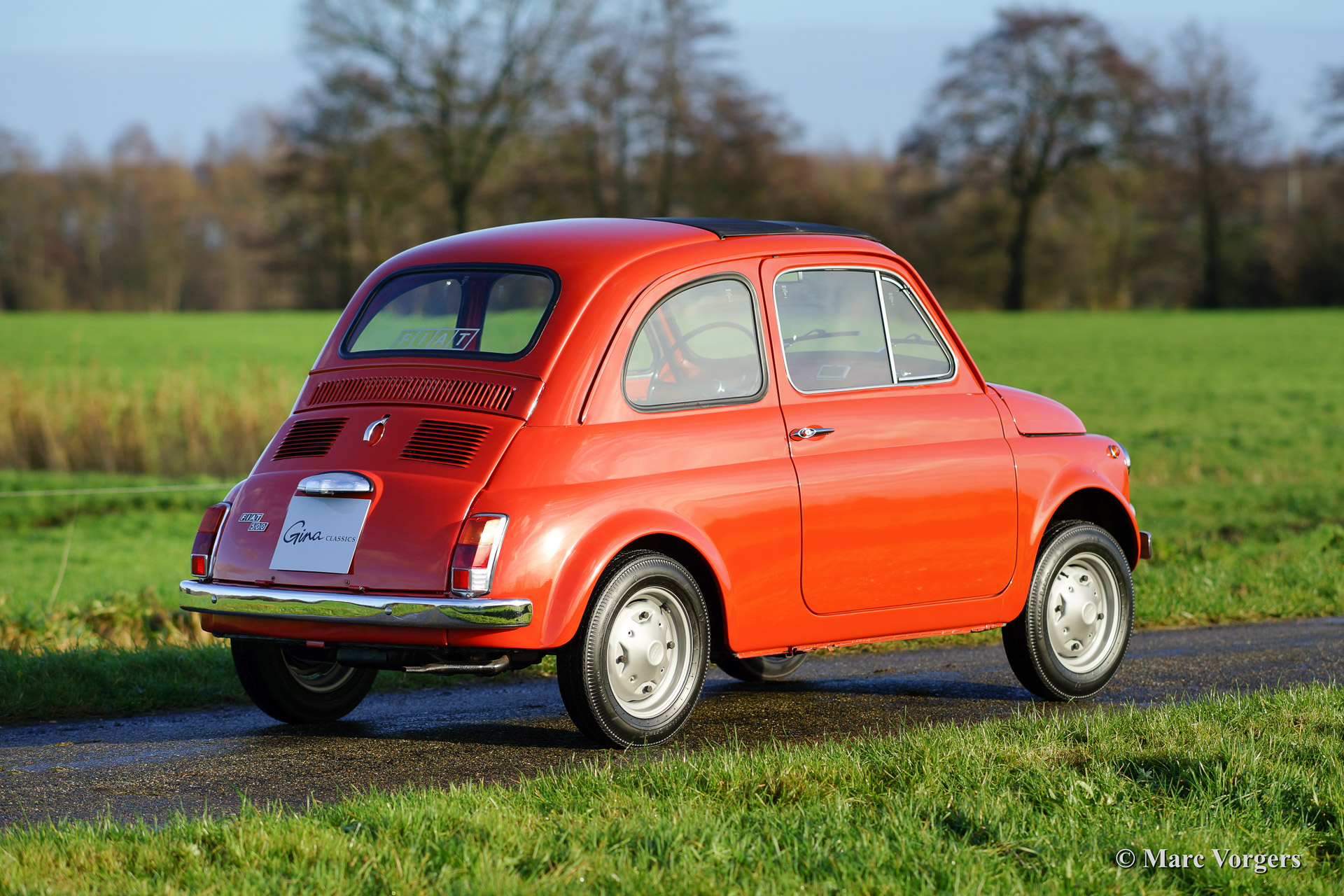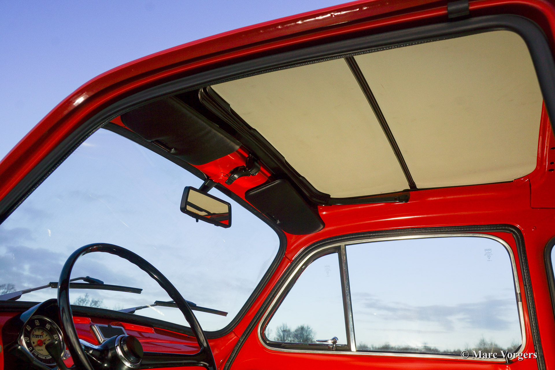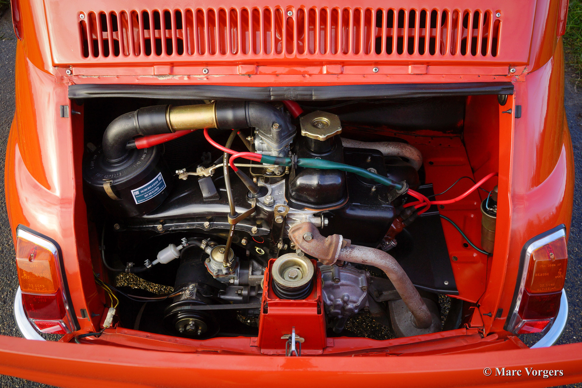 Fiat 500 R, bouwjaar 1975. Kleur rood (Rosso Corallo Scuro). Zwart interieur met zwarte kunstlederen bekleding en zwart rubber vloerbedekking. Deze Fiat ‘Cinquecento’ is een bijzonder juweel. De conditie van de auto is de droom van menig verzamelaar: volledig originele concoursstaat met 100% originele lak en zelfs nog uitgerust met de originele banden! Deze Fiat werd gebouwd in het laatste jaar van productie (1975).