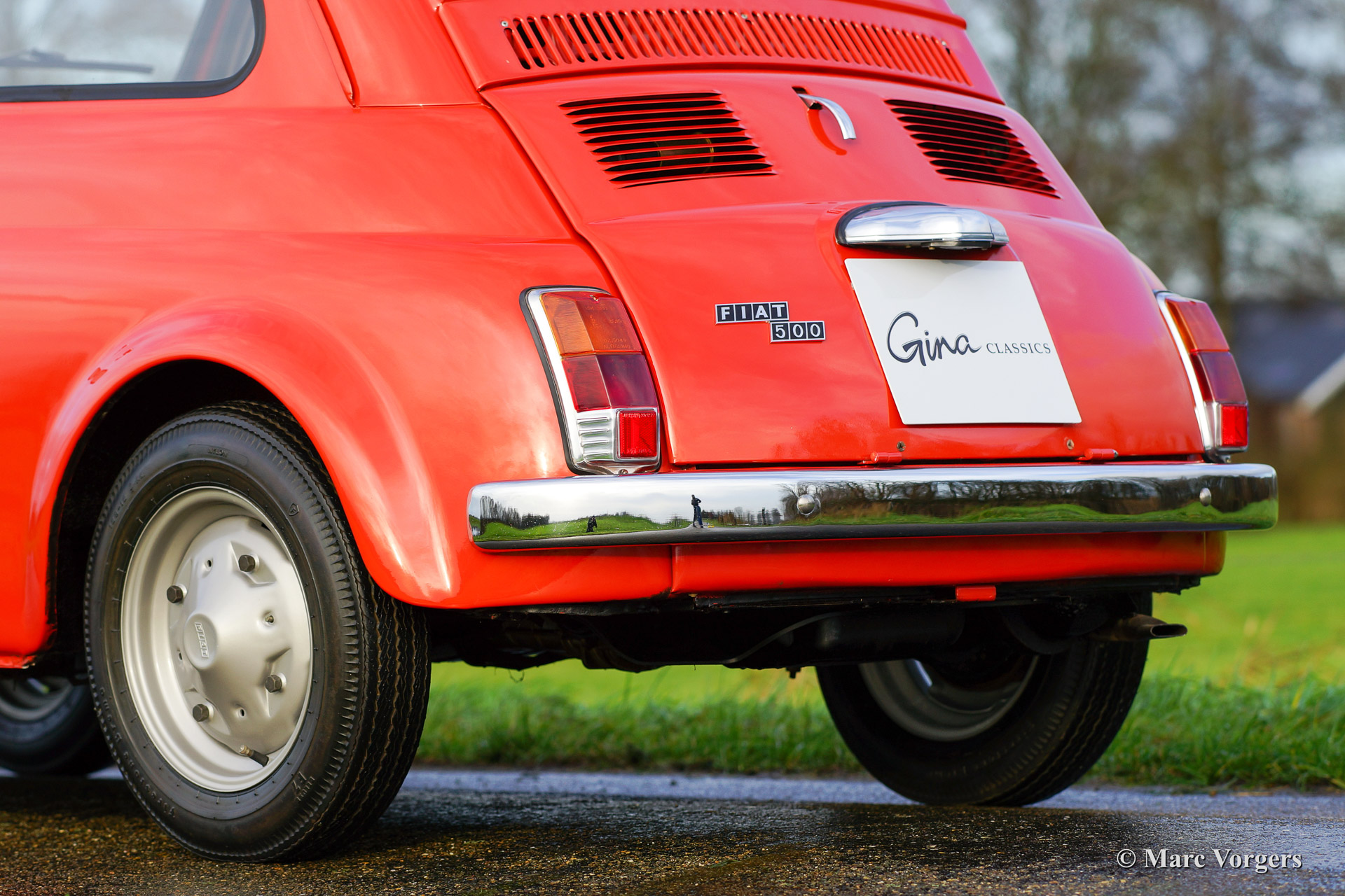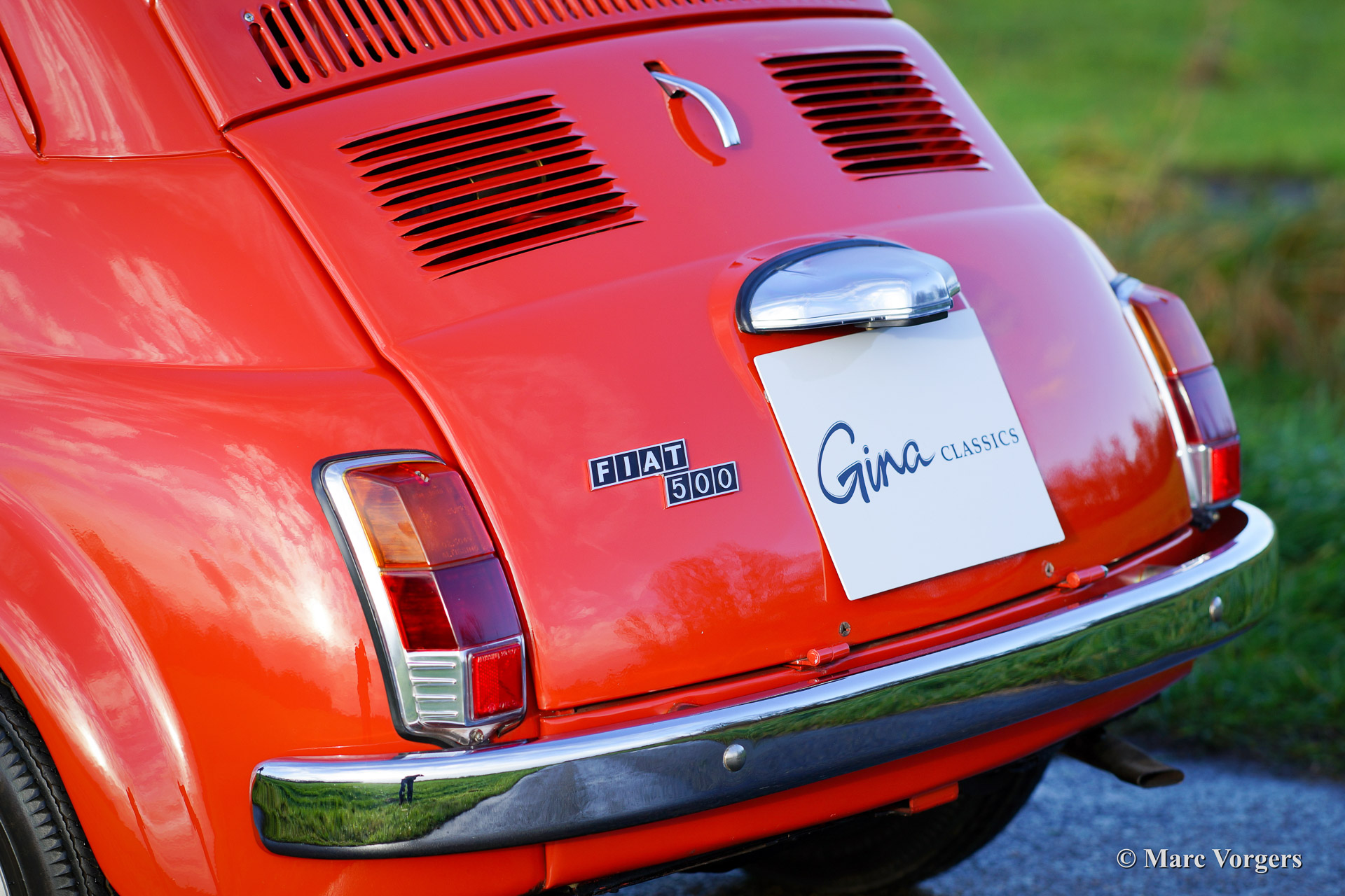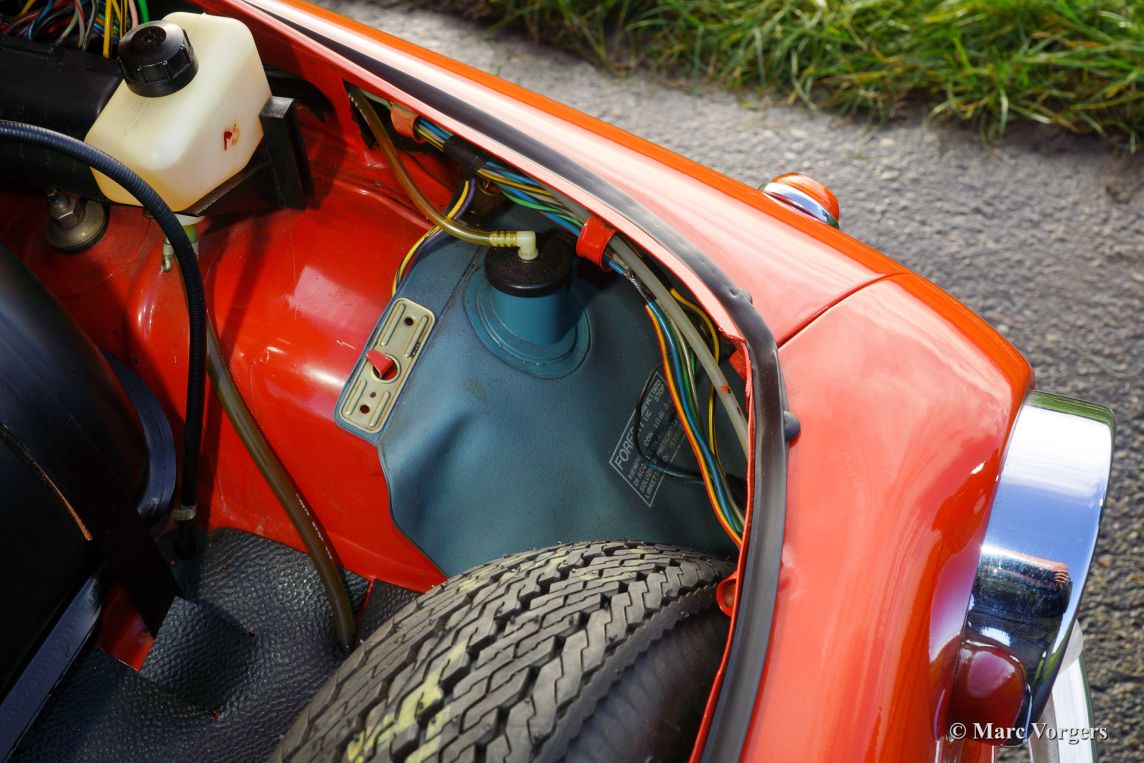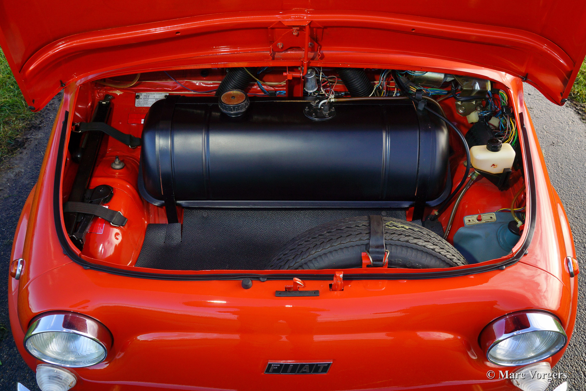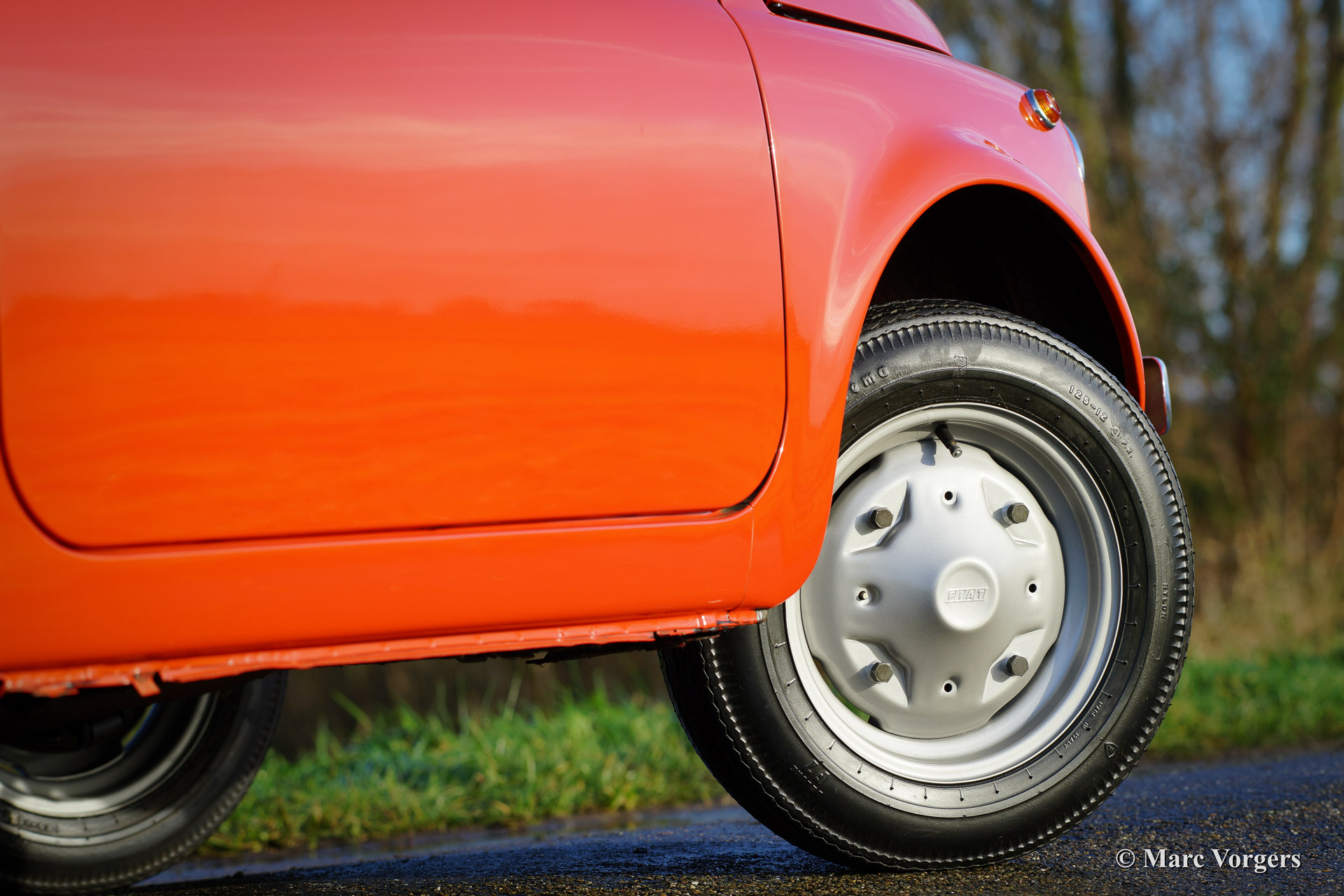 Fiat 500 R, bouwjaar 1975. Kleur rood (Rosso Corallo Scuro). Zwart interieur met zwarte kunstlederen bekleding en zwart rubber vloerbedekking. Deze Fiat ‘Cinquecento’ is een bijzonder juweel. De conditie van de auto is de droom van menig verzamelaar: volledig originele concoursstaat met 100% originele lak en zelfs nog uitgerust met de originele banden! Deze Fiat werd gebouwd in het laatste jaar van productie (1975).