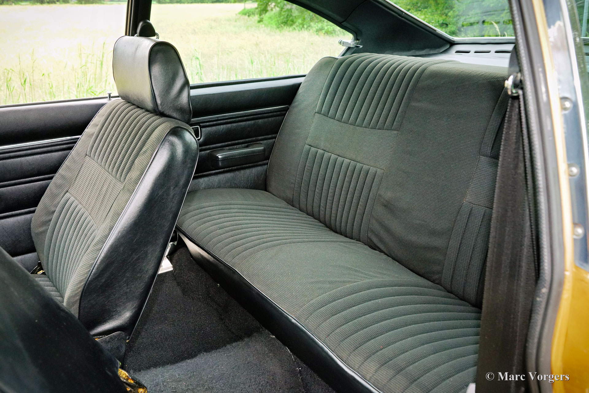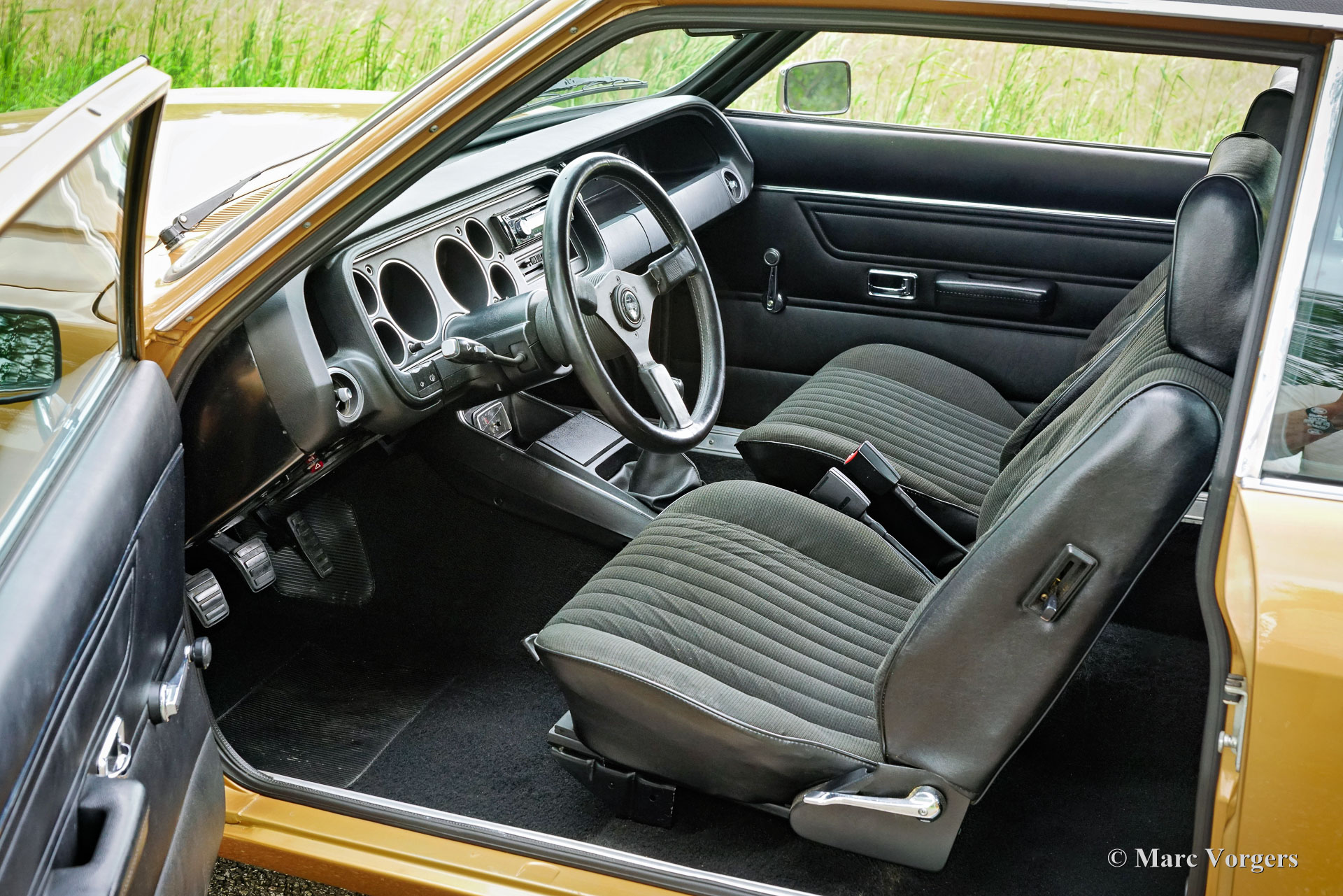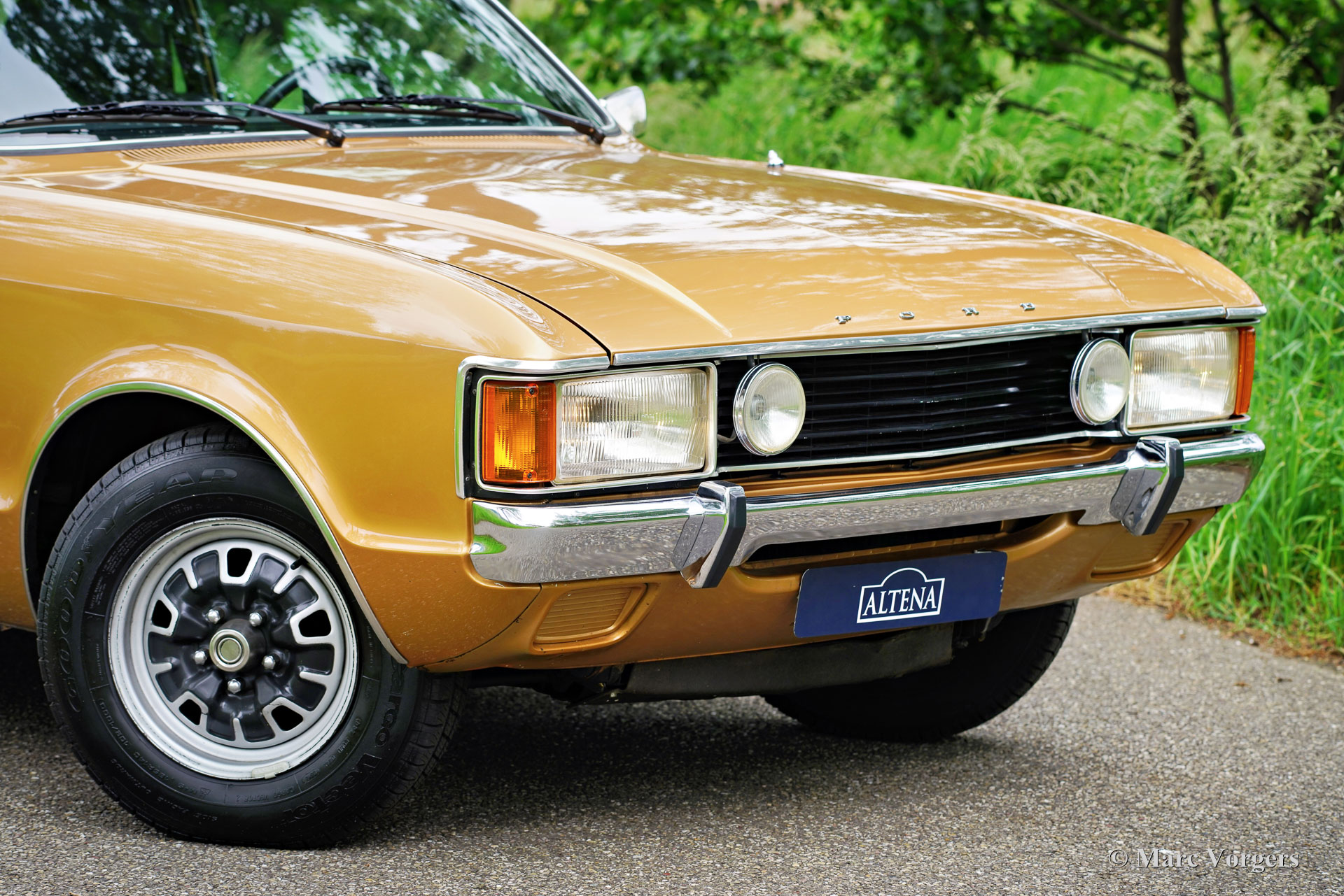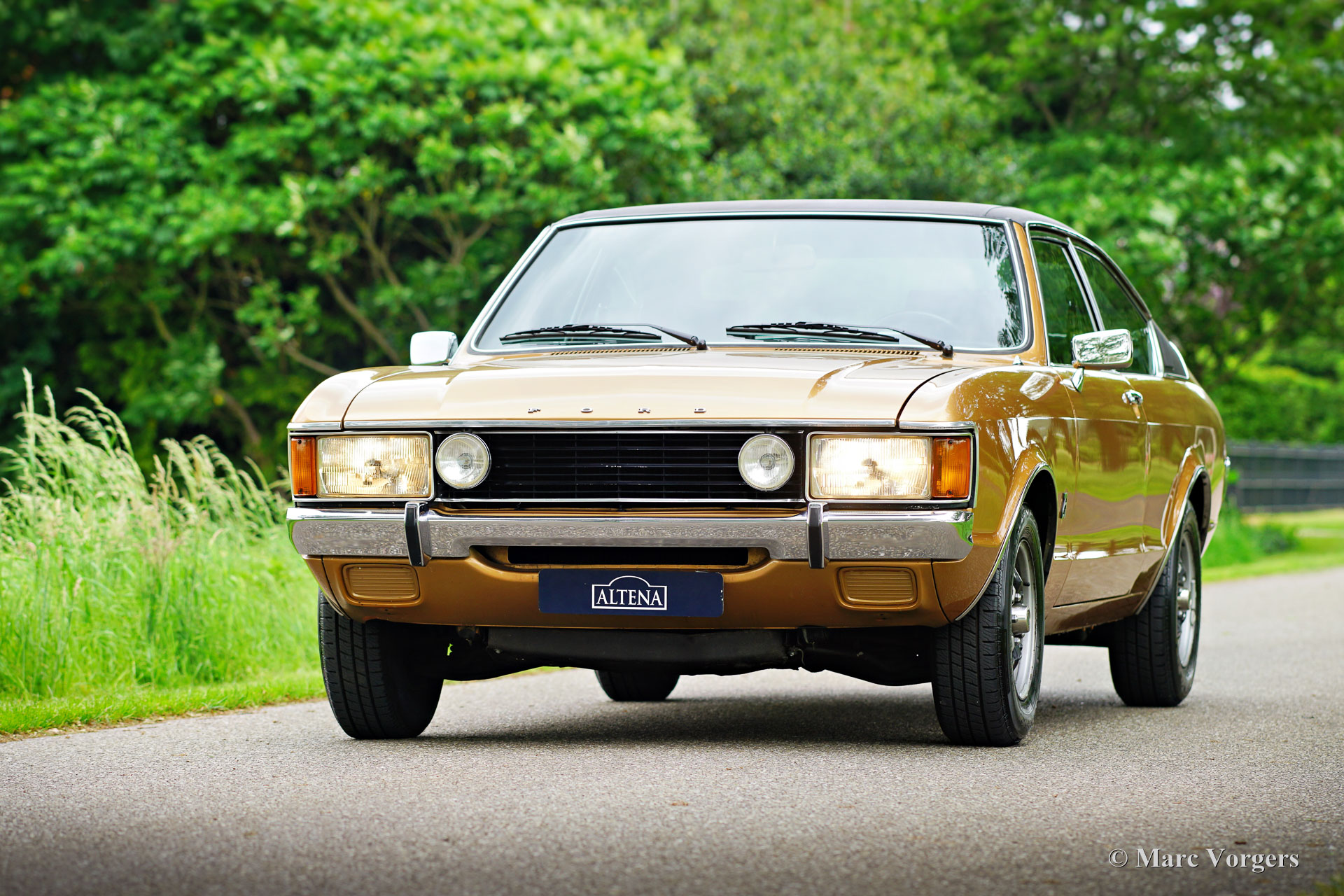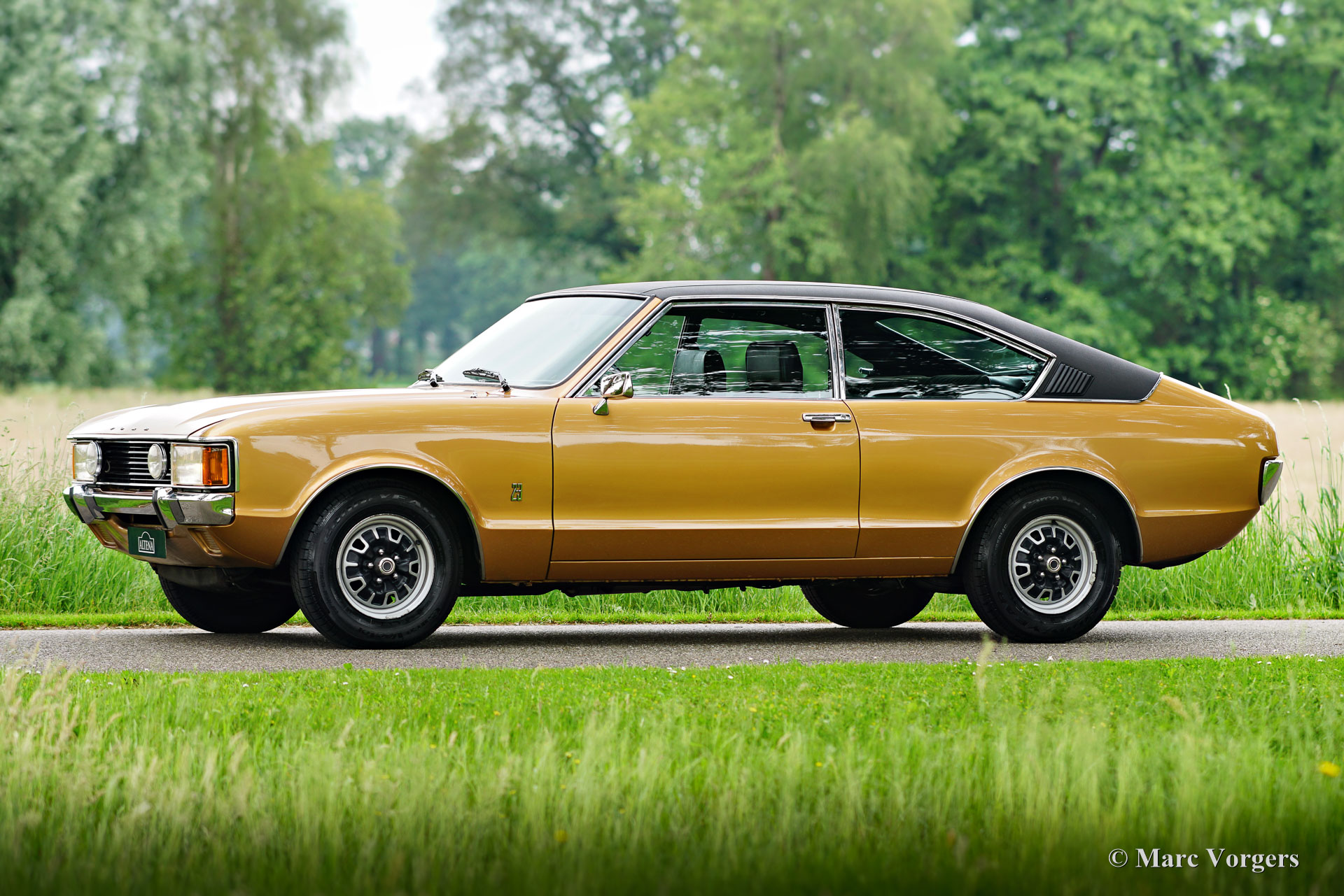 Ford Consul 2.3 GT Coupé, jaar 1974. Kleur brons/goud metallic met een zwart vinyl dak, gecombineerd met een antraciet/zwart stoffen/kunstlederen interieur afgewerkt met zwart tapijt en zwarte hemelbekleding. Deze prachtige Ford Consul 2.3 GT is nieuw verkocht in Frankrijk en de auto heeft vanaf nieuw slechts 57.000 kilometer gereden! Deze fraaie Ford verkeert in een uitmuntende en prachtige originele staat! De carrosserie toont perfecte lak, een perfect zwart vinyl dak, prachtig chroomwerk en een smetteloos origineel interieur! De buitenpanelen van de carrosserie zijn in het verleden perfect opnieuw gespoten, de lak aan de binnenkant van de deuren, motorkap en achterklepopeningen zijn allemaal origineel en de nieuwe lak “matcht” perfect! Alle originele fabrieksstickers zijn nog aanwezig. Deze Ford Consul GT is een unieke tijdcapsule, het zal moeilijk zo niet onmogelijk zijn om een tweede exemplaar te vinden in deze nooit gerestaureerde originele staat! De Ford Consul was verkrijgbaar als vierdeurs sedan, stationwagen en als tweedeurs “fastback” coupé. De hier gepresenteerde “fastback” coupé is het zeldzaamste model. De Ford Consul werd in andere landen en afhankelijk van de motorisering ook verkocht onder de naam Ford “Granada”. Na 1975 heetten al deze Ford-modellen Granada. De Ford Consul 2.3 GT wordt aangedreven door een 108 DIN pk sterke Ford “Keulen” 2,3 liter V6-motor, gekoppeld aan een handgeschakelde versnellingsbak met 4 versnellingen. De auto heeft achterwielaandrijving en de onafhankelijke wielophanging zorgt voor een uitstekende wegligging en veel comfort. De huidige eigenaar heeft een Momo sportstuur en een moderne radio gemonteerd, het originele stuur en een eerder geïnstalleerde jaren 1970 radio zijn bij de auto aanwezig. Deze Ford Consul is voorzien van een periode correct kompas op het dashboard en de auto wordt geleverd met de originele sleutelset. De volledige historie is gedocumenteerd en compleet met de originele boekjes. De Ford heeft een volledige onderhoudsbeurt gehad en alles is up-to-date. Facturen van de meest recente werkzaamheden zijn aanwezig. Deze Ford Consul 2.3 GT Coupé is een zeldzame en fantastische vondst voor de (Ford) oldtimerliefhebber!