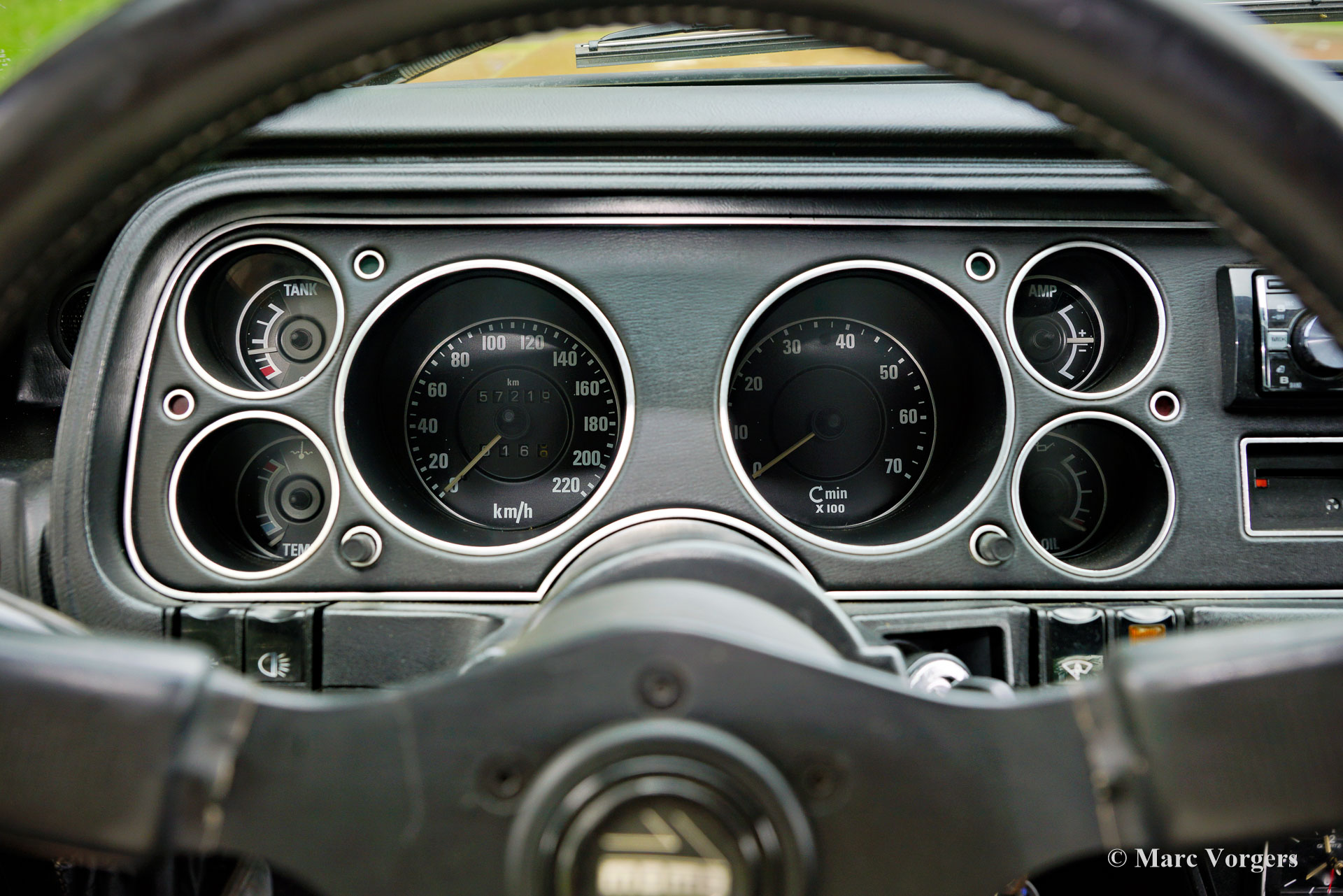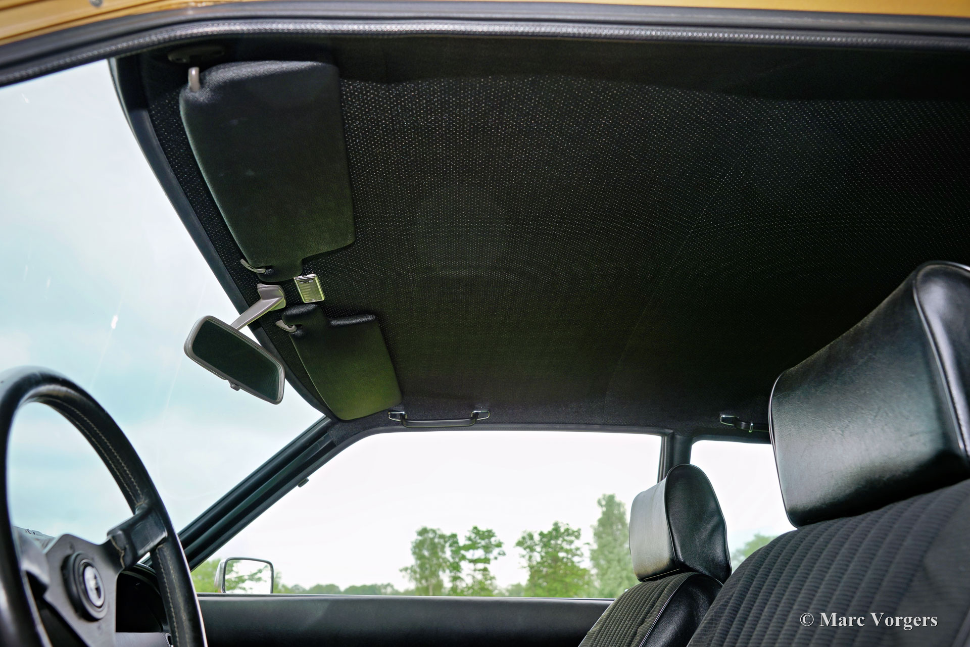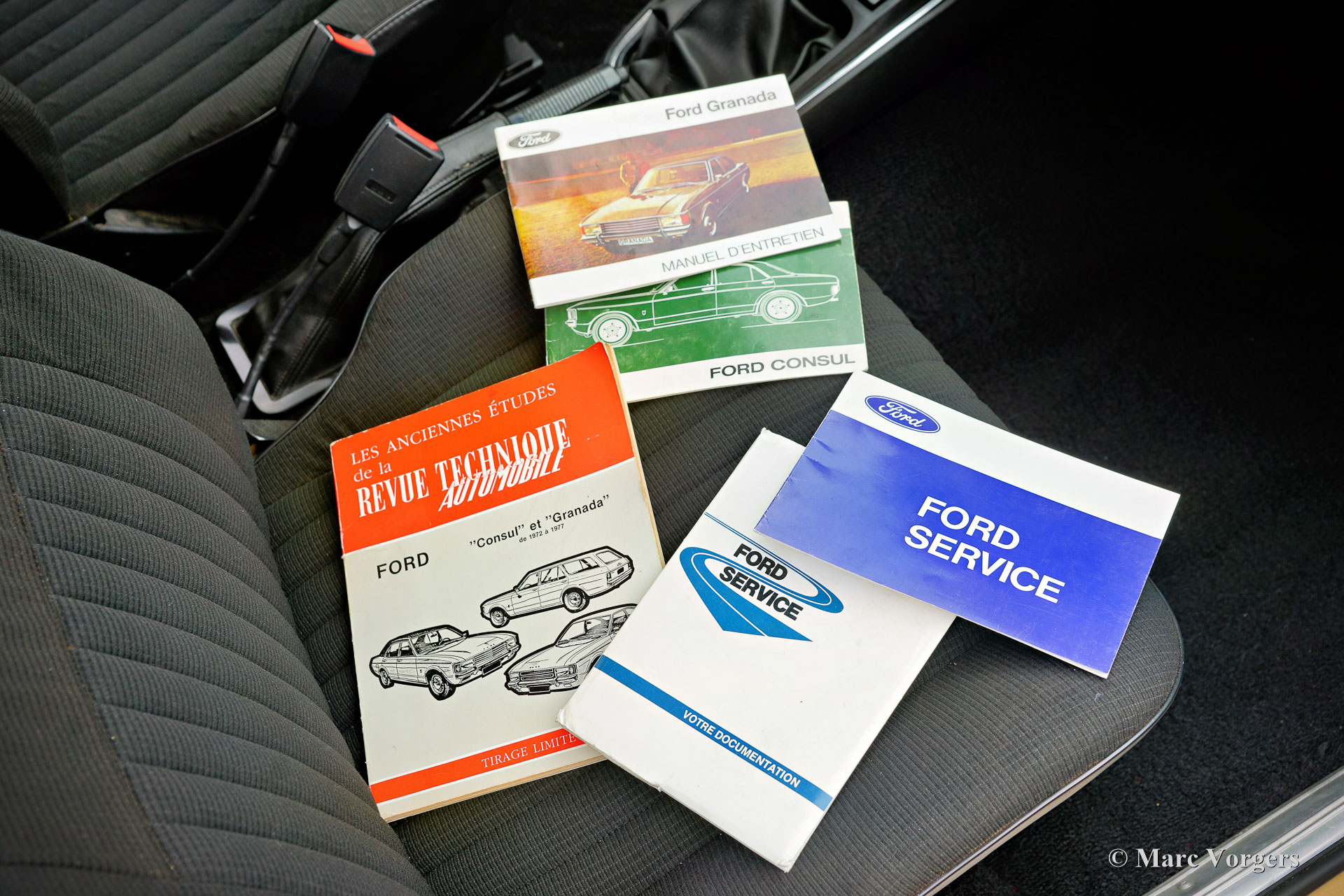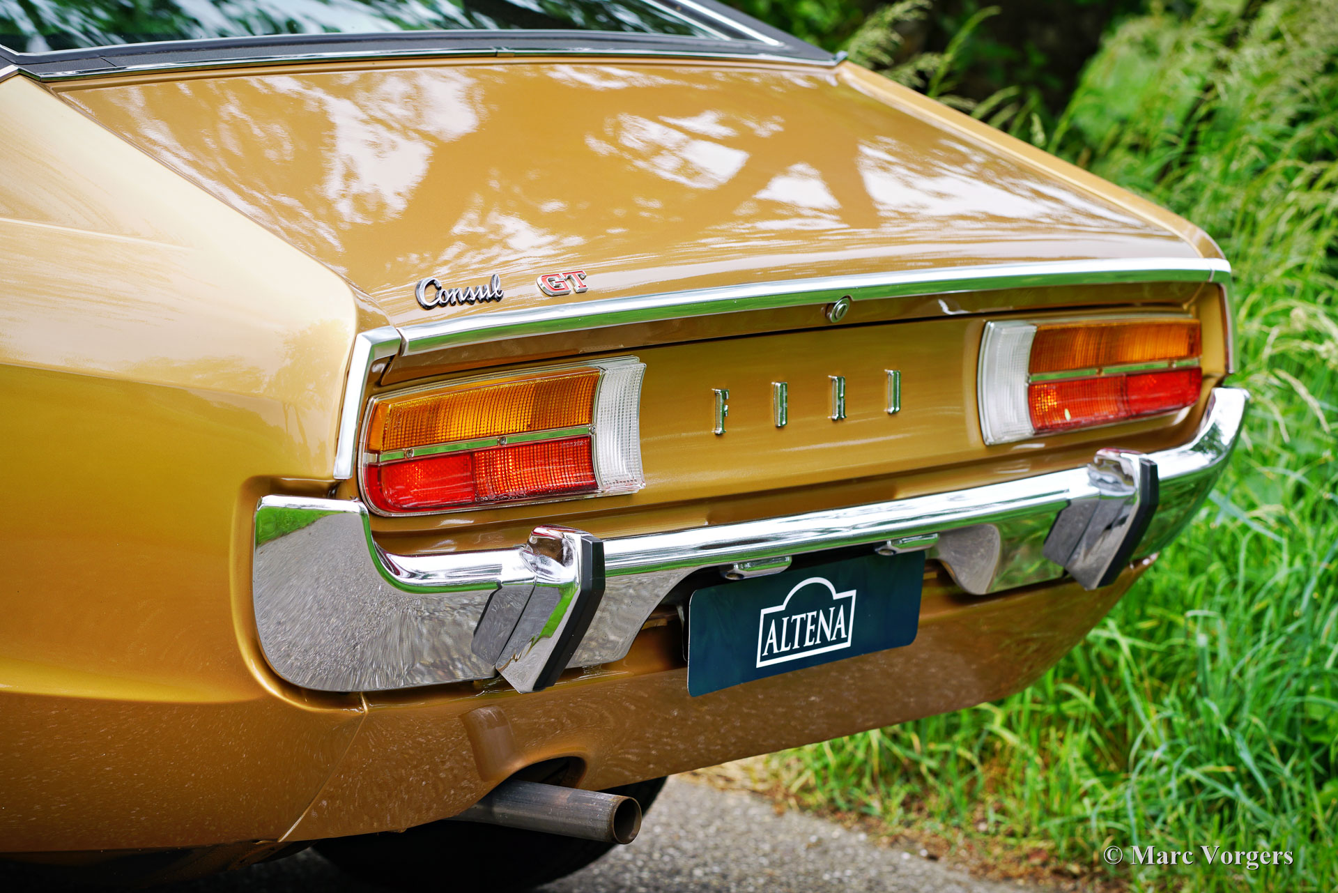Ford Consul 2.3 GT Coupé, jaar 1974. Kleur brons/goud metallic met een zwart vinyl dak, gecombineerd met een antraciet/zwart stoffen/kunstlederen interieur afgewerkt met zwart tapijt en zwarte hemelbekleding. Deze prachtige Ford Consul 2.3 GT is nieuw verkocht in Frankrijk en de auto heeft vanaf nieuw slechts 57.000 kilometer gereden! Deze fraaie Ford verkeert in een uitmuntende en prachtige originele staat! De carrosserie toont perfecte lak, een perfect zwart vinyl dak, prachtig chroomwerk en een smetteloos origineel interieur! De buitenpanelen van de carrosserie zijn in het verleden perfect opnieuw gespoten, de lak aan de binnenkant van de deuren, motorkap en achterklepopeningen zijn allemaal origineel en de nieuwe lak “matcht” perfect! Alle originele fabrieksstickers zijn nog aanwezig. Deze Ford Consul GT is een unieke tijdcapsule, het zal moeilijk zo niet onmogelijk zijn om een tweede exemplaar te vinden in deze nooit gerestaureerde originele staat! De Ford Consul was verkrijgbaar als vierdeurs sedan, stationwagen en als tweedeurs “fastback” coupé. De hier gepresenteerde “fastback” coupé is het zeldzaamste model. De Ford Consul werd in andere landen en afhankelijk van de motorisering ook verkocht onder de naam Ford “Granada”. Na 1975 heetten al deze Ford-modellen Granada. De Ford Consul 2.3 GT wordt aangedreven door een 108 DIN pk sterke Ford “Keulen” 2,3 liter V6-motor, gekoppeld aan een handgeschakelde versnellingsbak met 4 versnellingen. De auto heeft achterwielaandrijving en de onafhankelijke wielophanging zorgt voor een uitstekende wegligging en veel comfort. De huidige eigenaar heeft een Momo sportstuur en een moderne radio gemonteerd, het originele stuur en een eerder geïnstalleerde jaren 1970 radio zijn bij de auto aanwezig. Deze Ford Consul is voorzien van een periode correct kompas op het dashboard en de auto wordt geleverd met de originele sleutelset. De volledige historie is gedocumenteerd en compleet met de originele boekjes. De Ford heeft een volledige onderhoudsbeurt gehad en alles is up-to-date. Facturen van de meest recente werkzaamheden zijn aanwezig. Deze Ford Consul 2.3 GT Coupé is een zeldzame en fantastische vondst voor de (Ford) oldtimerliefhebber!