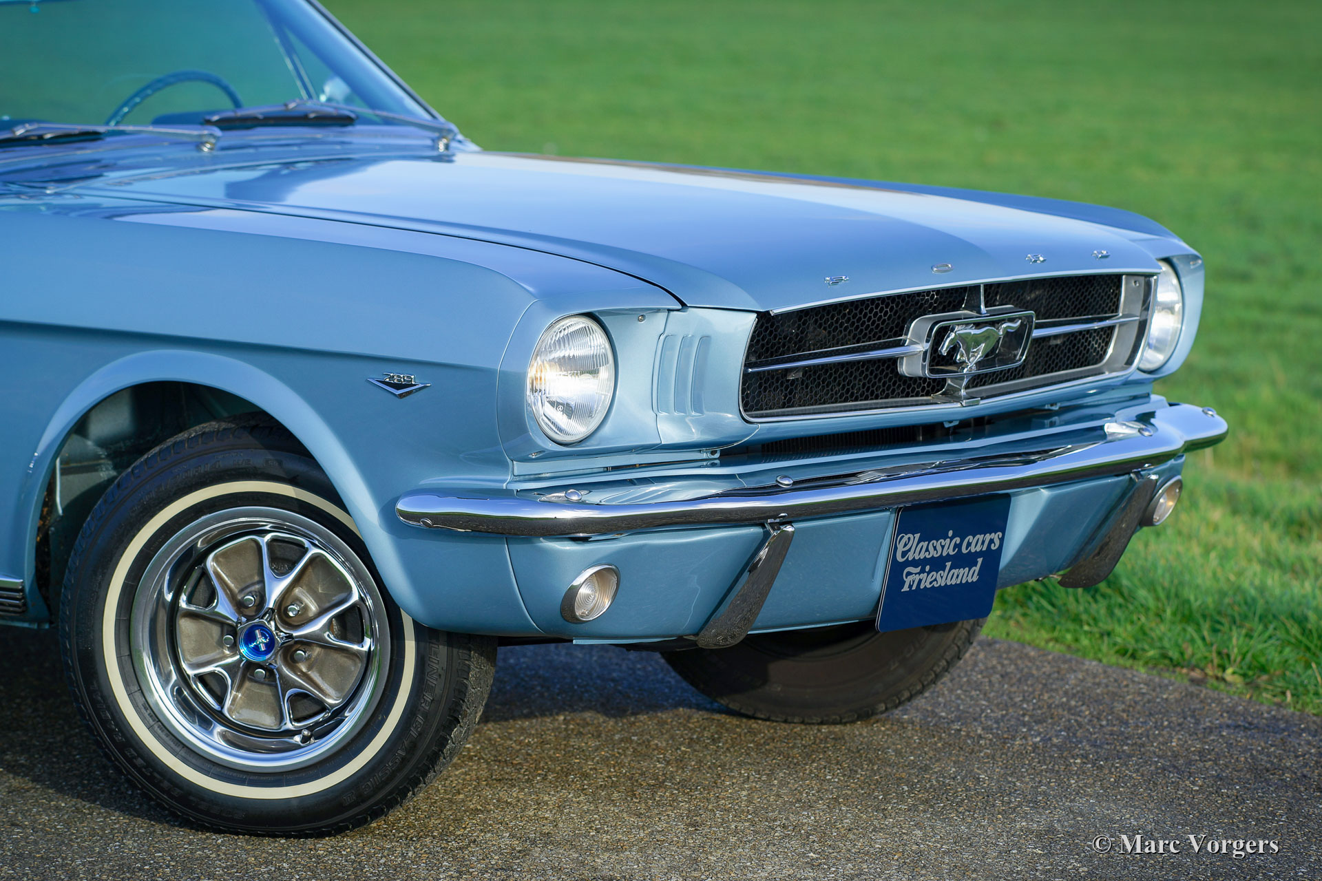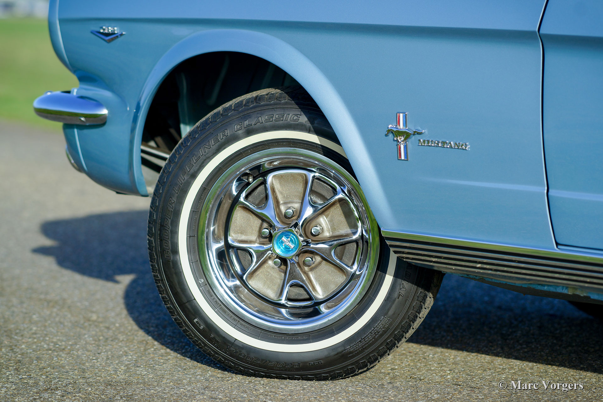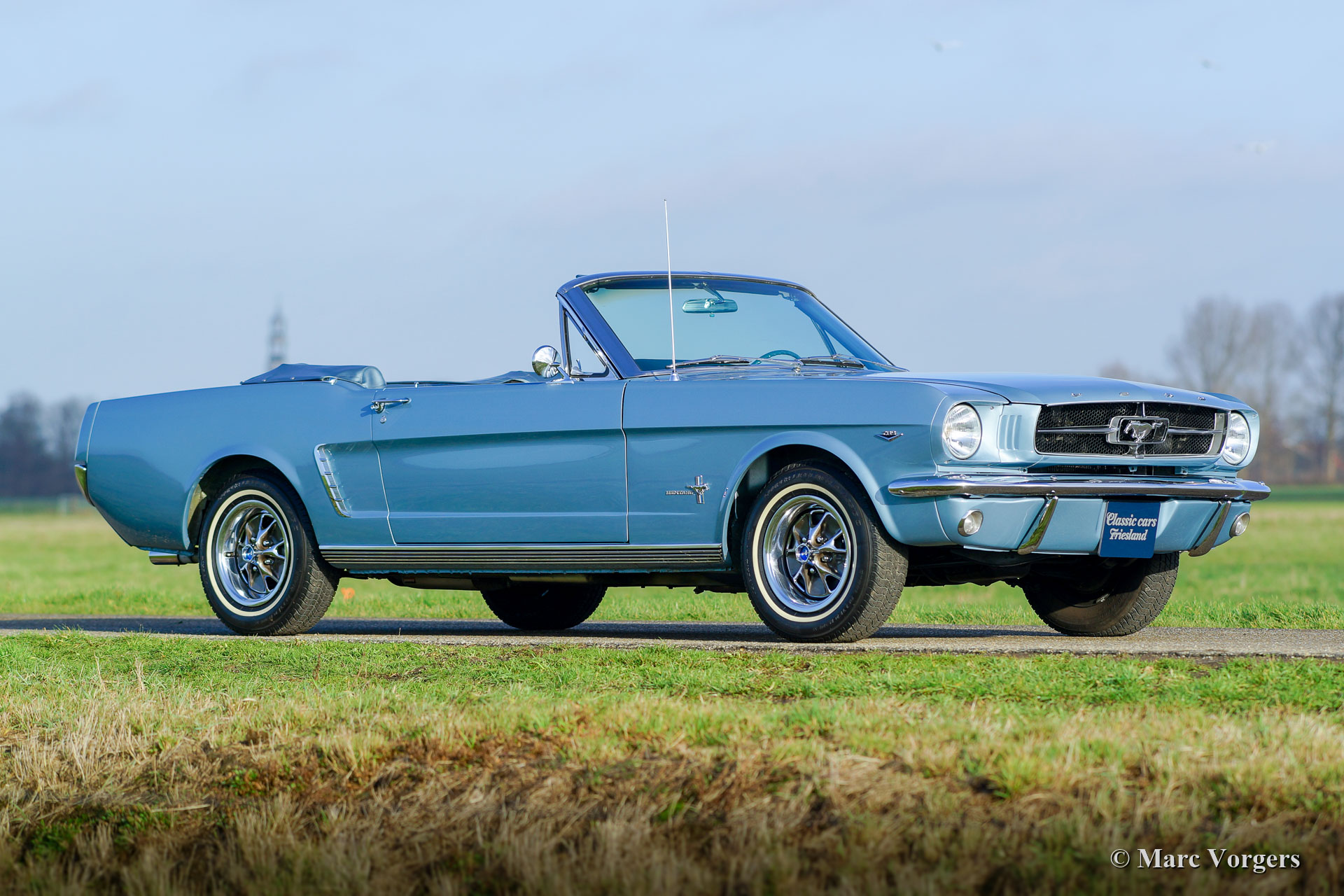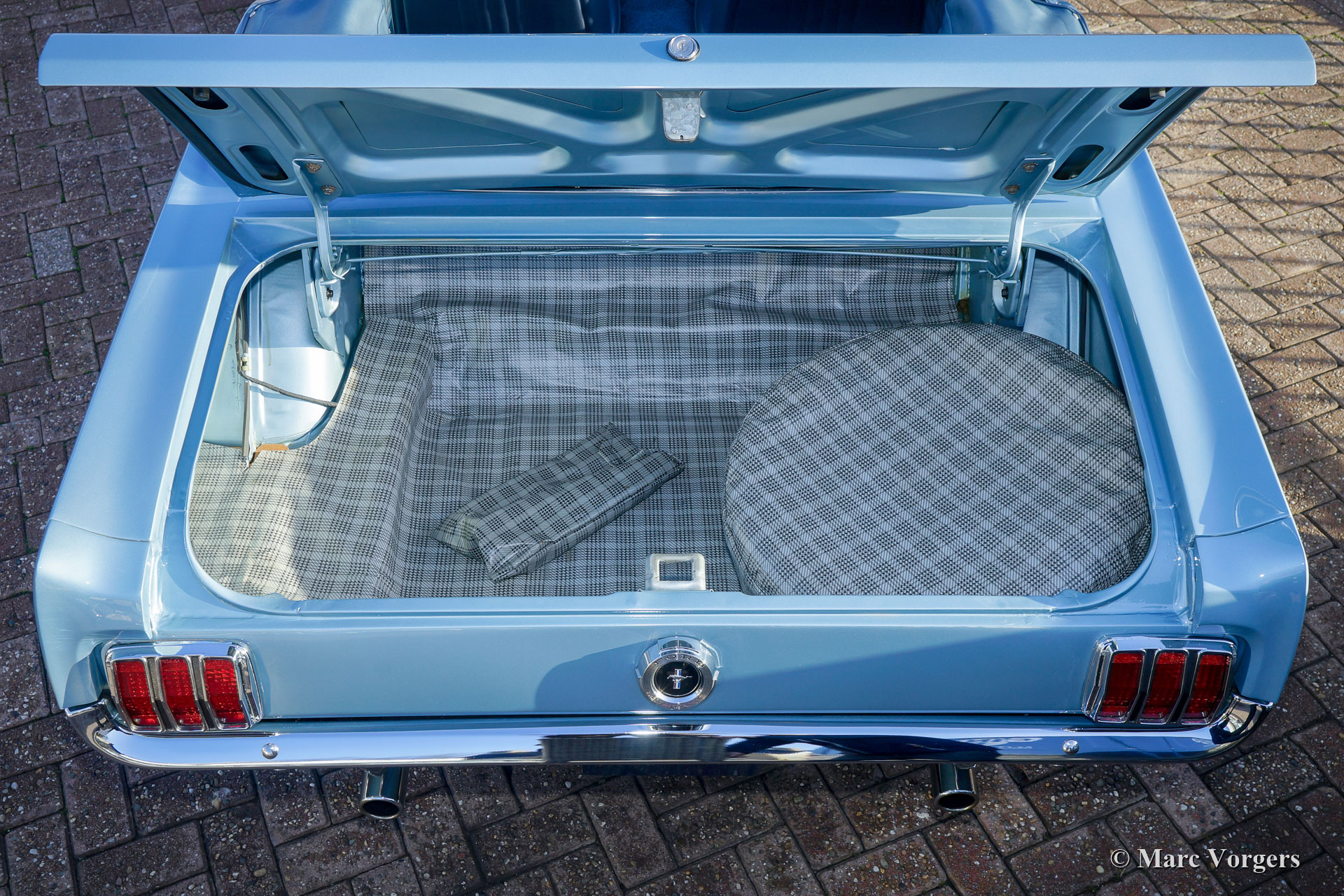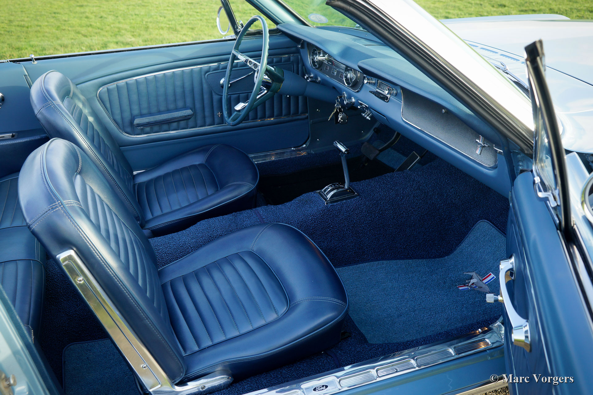 Ford Mustang Convertible, jaar 1965. ‘Matching numbers and colours’. Kleur Zilverblauw metallic gecombineerd met een blauw kunstleren interieur en blauw tapijt. Vloermatten met Ford Mustang-logo zijn de ‘finishing touch’. De auto is voorzien van een witte cabriokap en een blauwe kap-afdekking. Deze prachtige Ford Mustang is in de jaren 2012 - 2014 in Nederland grondig gerestaureerd tot in de perfectie. Een uitgebreid restauratieverslag met fotoreportage en facturen is aanwezig. De restauratie begon met een roest- en schadevrije basis, de restauratie is zeer professioneel uitgevoerd. De 289 Cui V8-motor en de automatische versnellingsbak zijn tijdens het de restauratie gereviseerd en de kabelboom is vernieuwd. De auto verkeert in sublieme topconditie (concours!) en de auto heeft slechts 1450 kilometer gereden sinds voltooiing van de restauratie. De originele kilometerstand is slechts 48365 mijl! Deze prachtige Ford Mustang toont alle originele details, waaronder een originele Ford-radio. Verder is de auto voorzien van banden met witte zijvlakken en een dubbele uitlaat. Dit is een als nieuw rijdende Ford Mustang Cabriolet in topstaat!