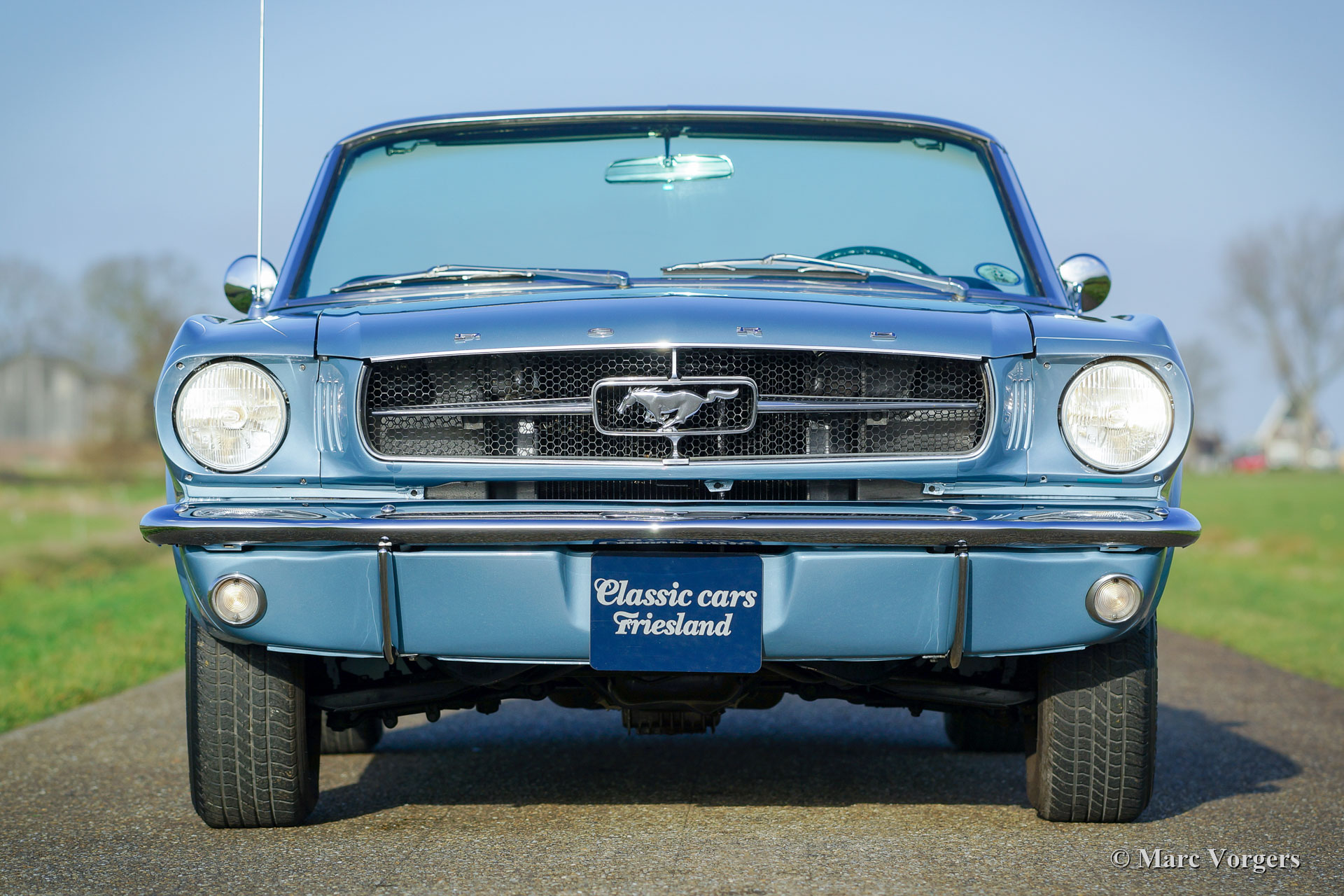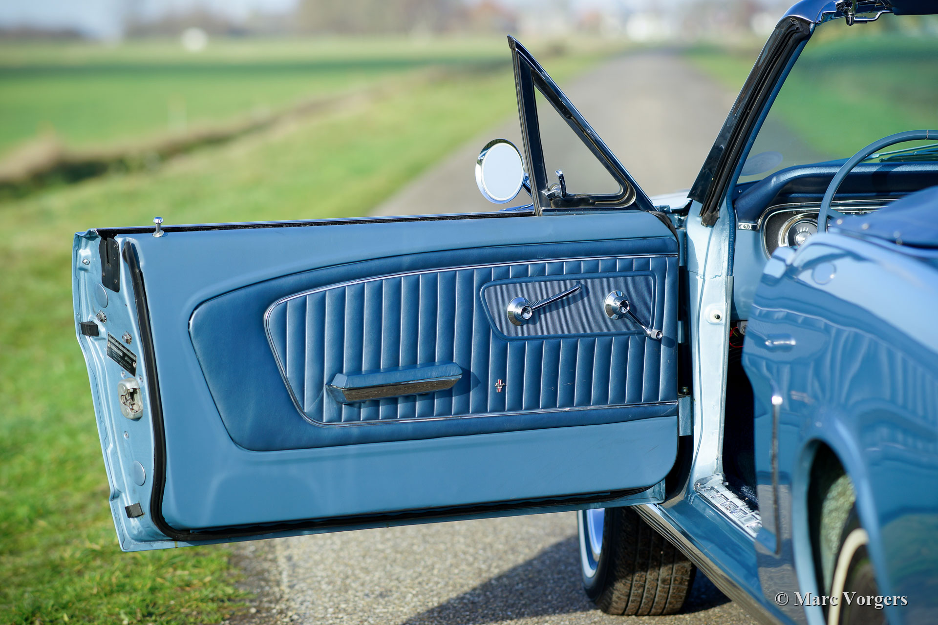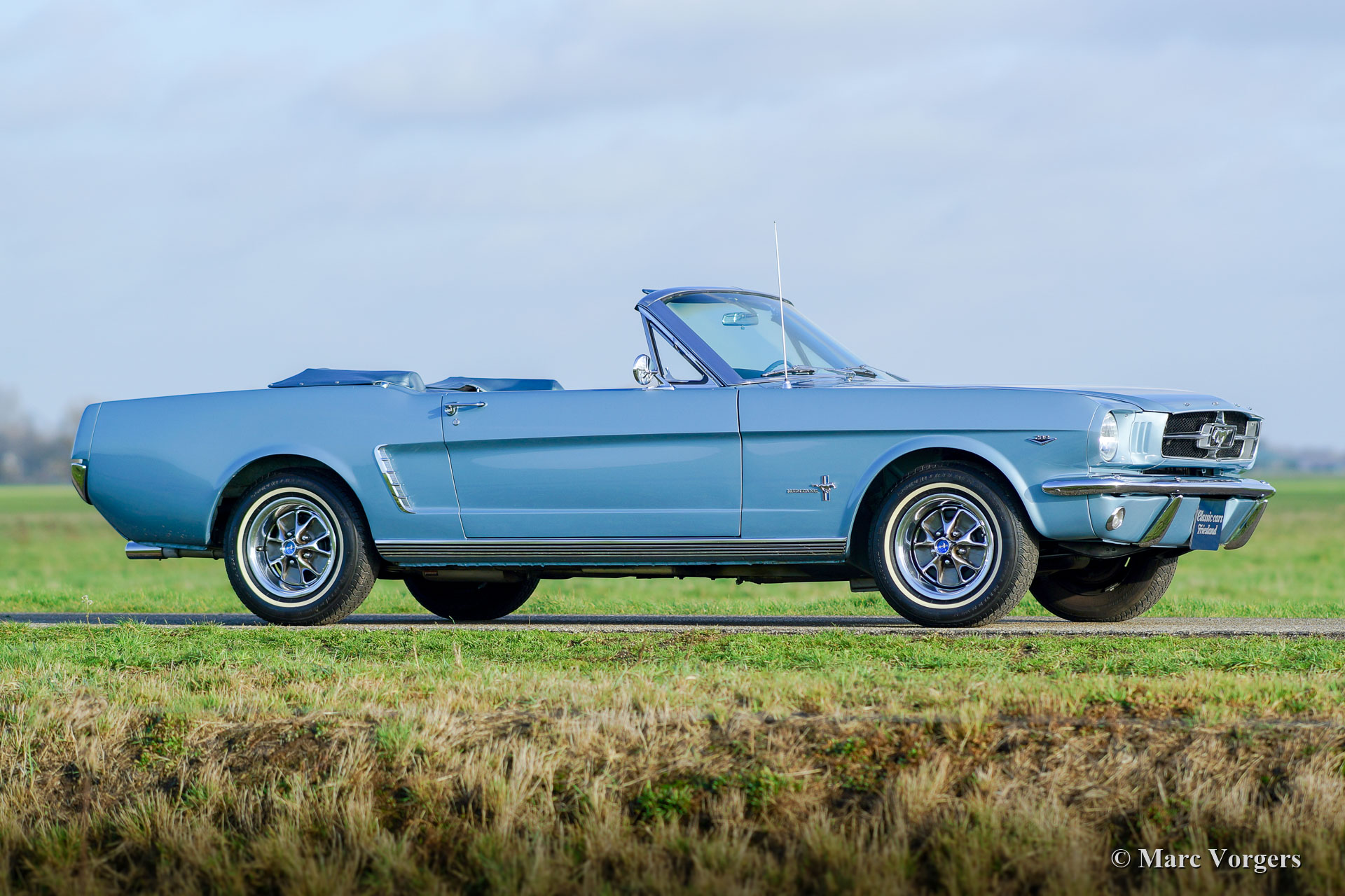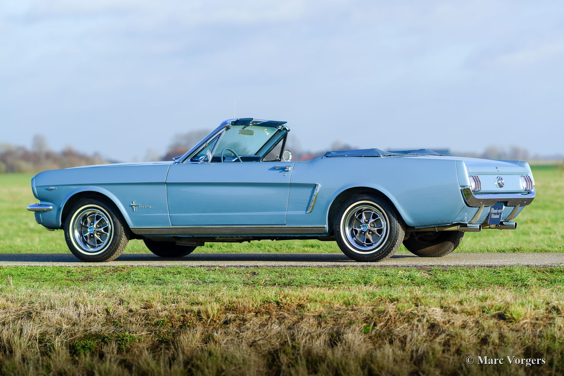 Ford Mustang Convertible, jaar 1965. ‘Matching numbers and colours’. Kleur Zilverblauw metallic gecombineerd met een blauw kunstleren interieur en blauw tapijt. Vloermatten met Ford Mustang-logo zijn de ‘finishing touch’. De auto is voorzien van een witte cabriokap en een blauwe kap-afdekking. Deze prachtige Ford Mustang is in de jaren 2012 - 2014 in Nederland grondig gerestaureerd tot in de perfectie. Een uitgebreid restauratieverslag met fotoreportage en facturen is aanwezig. De restauratie begon met een roest- en schadevrije basis, de restauratie is zeer professioneel uitgevoerd. De 289 Cui V8-motor en de automatische versnellingsbak zijn tijdens het de restauratie gereviseerd en de kabelboom is vernieuwd. De auto verkeert in sublieme topconditie (concours!) en de auto heeft slechts 1450 kilometer gereden sinds voltooiing van de restauratie. De originele kilometerstand is slechts 48365 mijl! Deze prachtige Ford Mustang toont alle originele details, waaronder een originele Ford-radio. Verder is de auto voorzien van banden met witte zijvlakken en een dubbele uitlaat. Dit is een als nieuw rijdende Ford Mustang Cabriolet in topstaat!