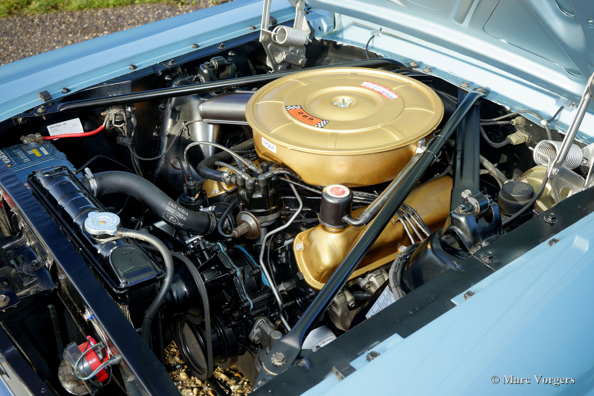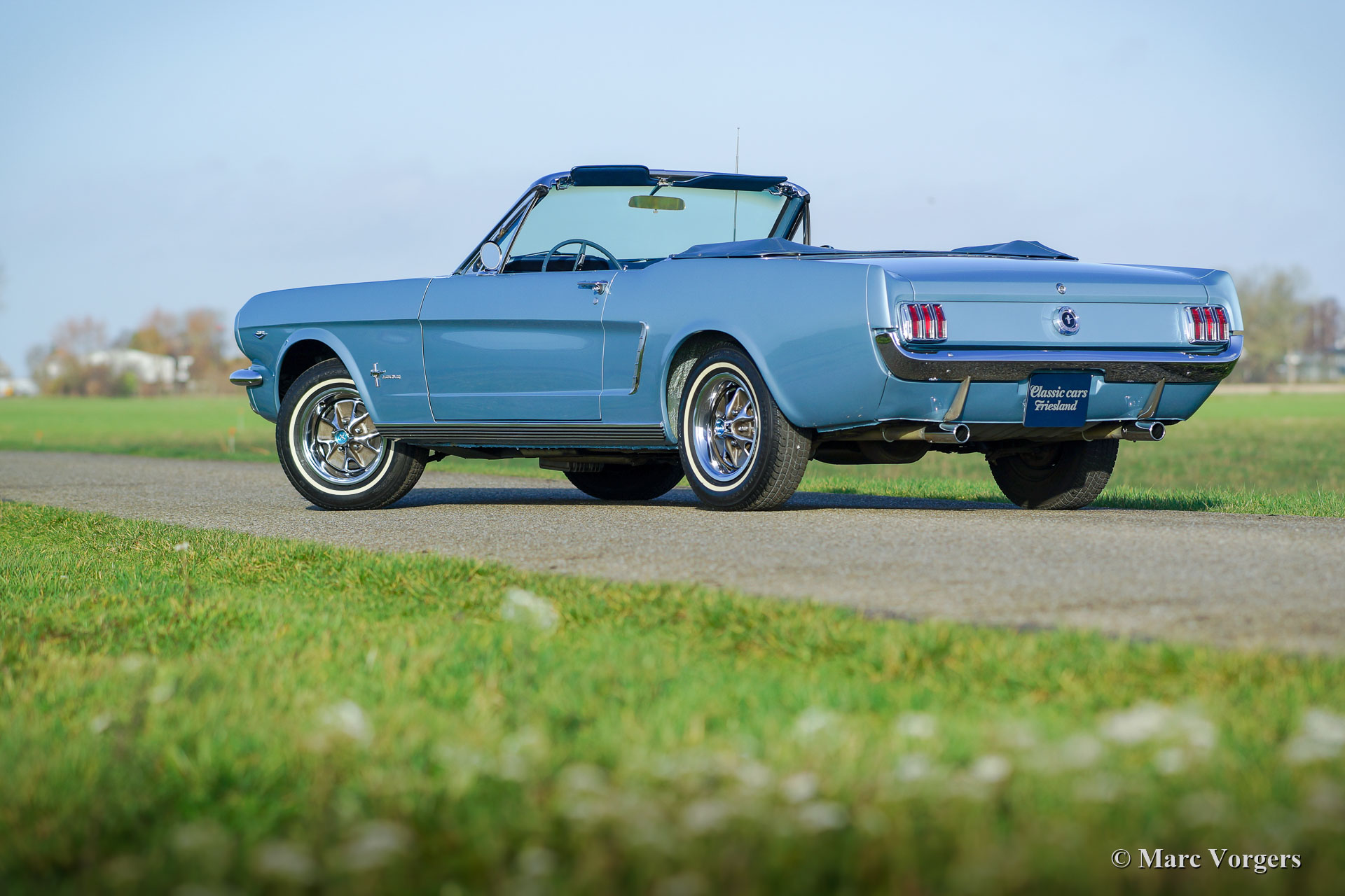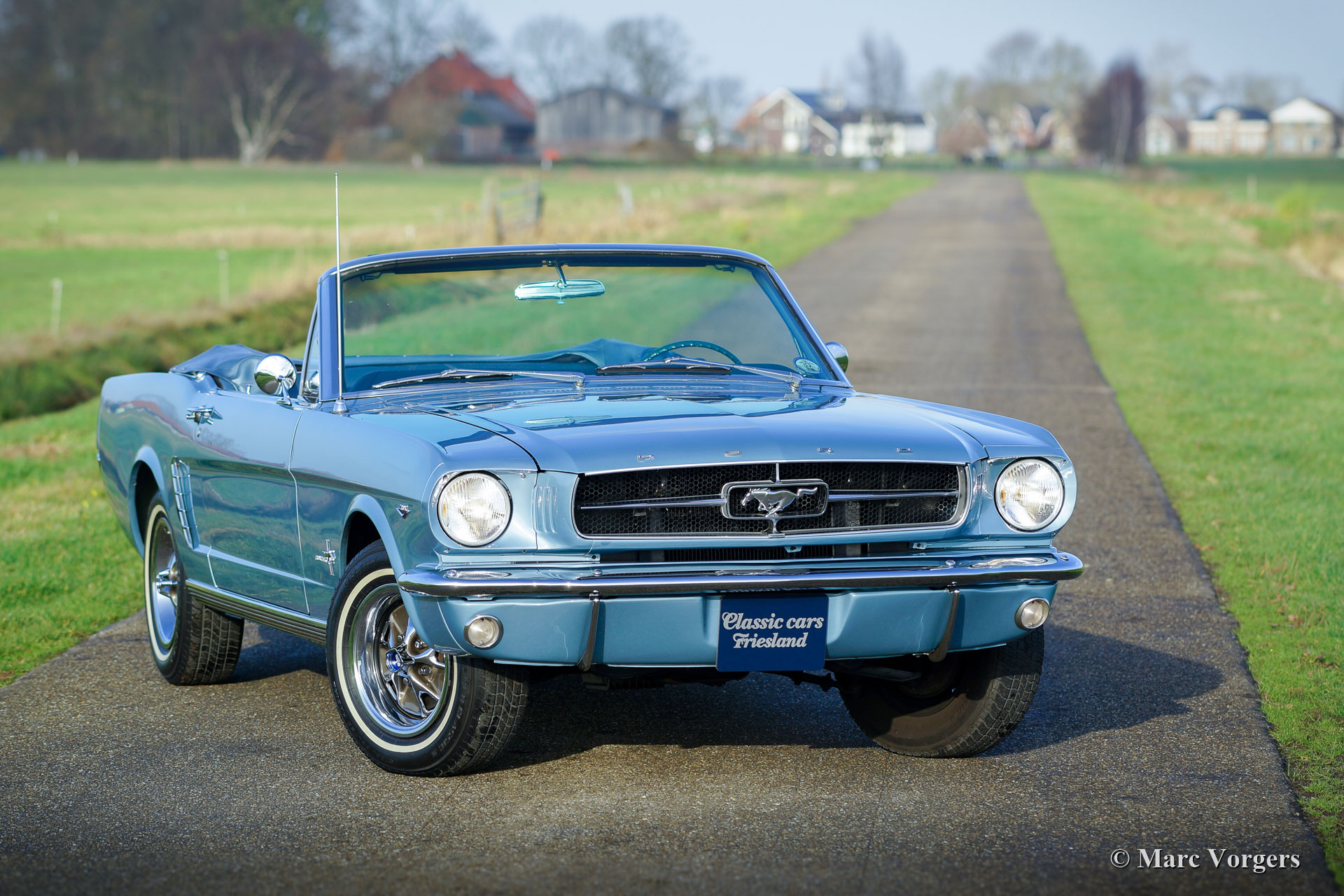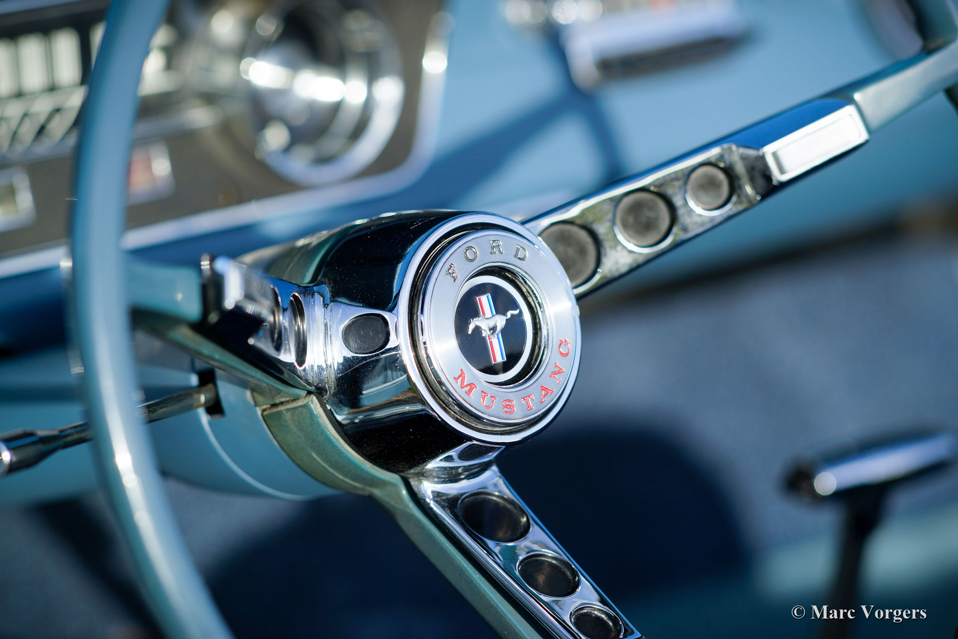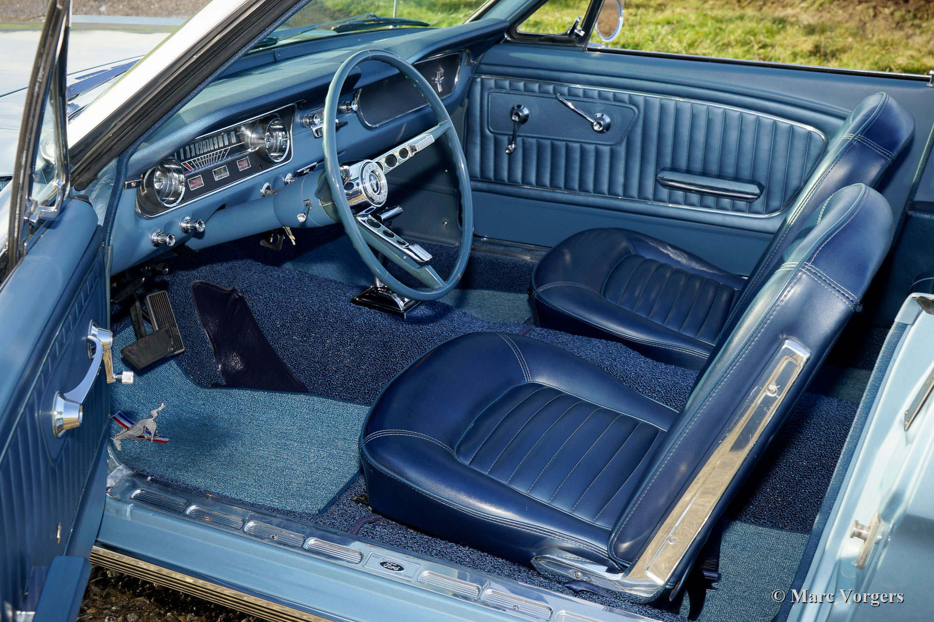 Ford Mustang Convertible, jaar 1965. ‘Matching numbers and colours’. Kleur Zilverblauw metallic gecombineerd met een blauw kunstleren interieur en blauw tapijt. Vloermatten met Ford Mustang-logo zijn de ‘finishing touch’. De auto is voorzien van een witte cabriokap en een blauwe kap-afdekking. Deze prachtige Ford Mustang is in de jaren 2012 - 2014 in Nederland grondig gerestaureerd tot in de perfectie. Een uitgebreid restauratieverslag met fotoreportage en facturen is aanwezig. De restauratie begon met een roest- en schadevrije basis, de restauratie is zeer professioneel uitgevoerd. De 289 Cui V8-motor en de automatische versnellingsbak zijn tijdens het de restauratie gereviseerd en de kabelboom is vernieuwd. De auto verkeert in sublieme topconditie (concours!) en de auto heeft slechts 1450 kilometer gereden sinds voltooiing van de restauratie. De originele kilometerstand is slechts 48365 mijl! Deze prachtige Ford Mustang toont alle originele details, waaronder een originele Ford-radio. Verder is de auto voorzien van banden met witte zijvlakken en een dubbele uitlaat. Dit is een als nieuw rijdende Ford Mustang Cabriolet in topstaat!