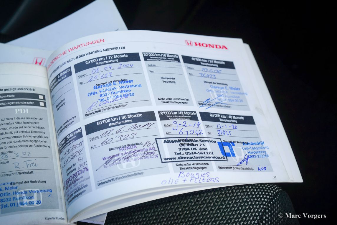 Honda Civic, Type R, jaar 2002. (Type R EP3). Exterieurkleur rood gecombineerd met een donkergrijs suède/ stoffen interieur met rode stiksels en rode accenten. Deze fantastische Honda Civic Type R is nieuw verkocht in Zwitserland. In 2017 is de auto in Nederland geïmporteerd met 66.000 originele kilometers op de teller. Nu staat er 83.000 kilometer op de teller. Deze Type R is door de jaren heen perfect onderhouden en gekoesterd door een liefhebber. De auto verkeert in een sublieme originele staat en rijdt en schakelt perfect! Het onderhoudsboekje toont stipte dealerservice-intervallen en bevestigt de kilometerstand. De auto wordt compleet geleverd met alle originele boekjes en onderhoudsfacturen. Deze Honda Civic type R toont het nummer R-09830 op een aluminium badge op de middenconsole. Het interieur is onberispelijk. De carrosserie is ook onberispelijk en toont nog steeds 100% perfecte originele lak.