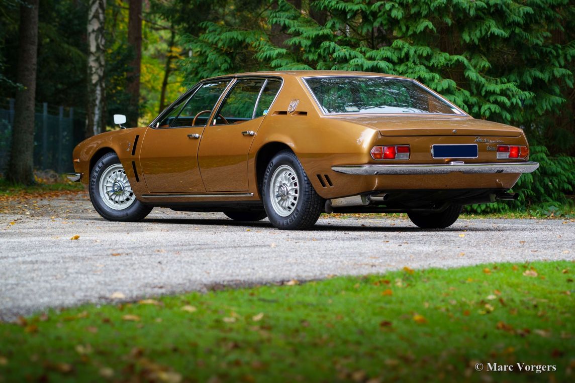 Iso Rivolta Fidia, jaar 1969. Kleur goudbruin metallic gecombineerd met een cognac lederen interieur en lichtbruin tapijt. Deze indrukwekkende en zeer zeldzame Iso Fidia werd nieuw verkocht in Zwitserland. In februari 2015 werd de auto naar Nederland geïmporteerd. De Iso Fidia is zeer zeldzaam, slechts 192 exemplaren werden gebouwd van 1967 tot 1974. De Iso Fidia, ontworpen door Giugiaro bij Ghia, was een van de snelste vierdeurs sedanauto's van de periode. Net als de Iso Rivolta sportwagens werd de Fidia ook aangedreven door robuuste, betrouwbare en zeer krachtige Chevrolet (Corvette) V8-motoren (Ford V8-motoren vanaf 1973). Dit prachtige exemplaar is uitgerust met een Chevrolet 5.4 Liter V8-motor gekoppeld aan een handgeschakelde vierversnellingsbak (volledig gesynchroniseerd). De achteras is voorzien van een sperdifferentieel om de 350 paardenkrachten op de juiste manier op straat te brengen. Deze Iso Fidia verkeert van binnen en van buiten in uitstekende conditie en de auto rijdt geweldig! Het is een heel speciaal gevoel om in een grote Italiaanse luxe sedan met V8 te rijden. Het leren interieur met het houten dashboard ademt pure luxe uit de jaren 1960, de stuurbekrachtiging is een genot en de donder van de prachtige V8-motor op de achtergrond maakt de ervaring compleet. De auto is uitgerust met prachtige originele lichtmetalen velgen, Pirelli P4000-banden en een Becker Mexico stereo cassette radio uit de jaren 1970. Dit is een topexemplaar van de zeer zeldzame Iso Rivolta Fidia.