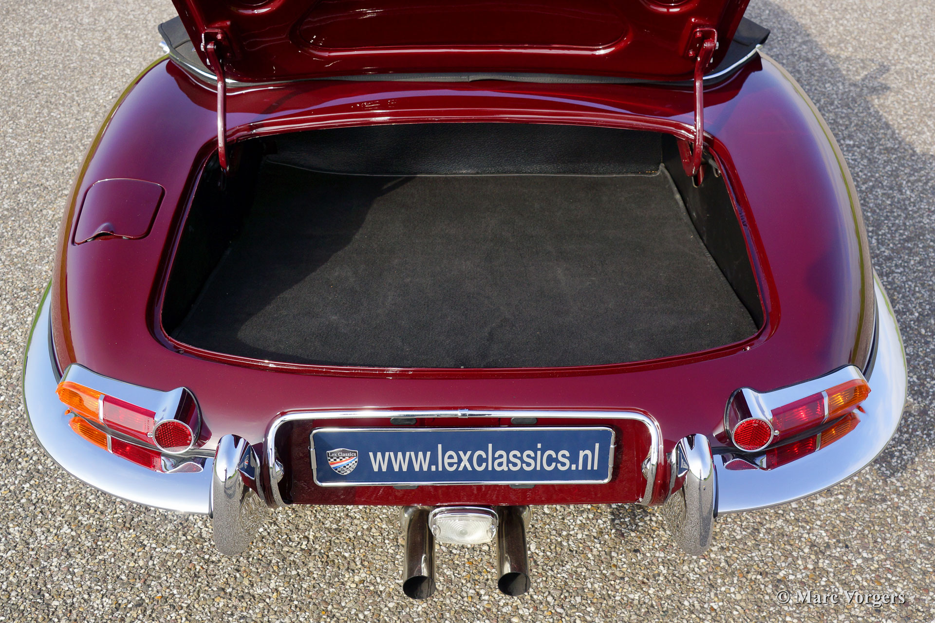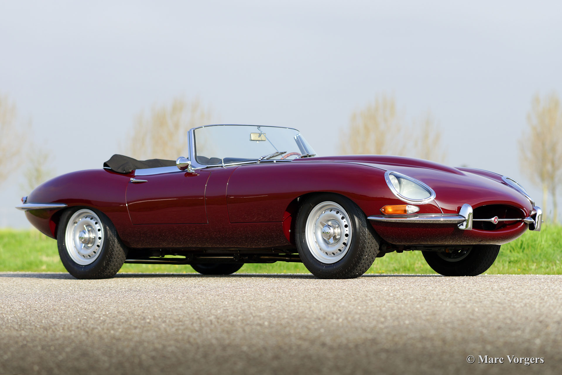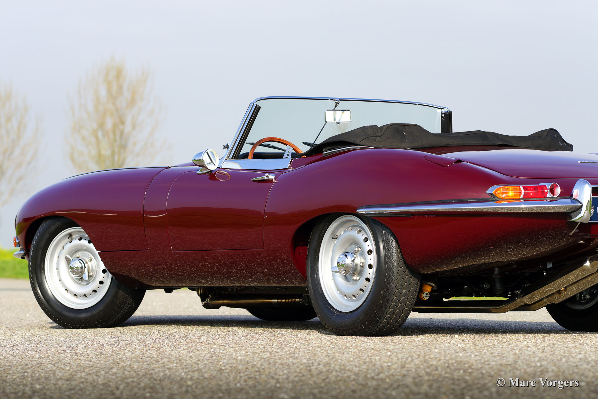 Jaguar E-type 3.8 Litre OTS ‘flat floor’, bouwjaar 1961. Chassisnummer: 8758XX, motornummer: R2110-X. Kleur Maroon rood met een zwart lederen interieur. Zwarte soft top en een zwarte hood cover. Deze prachtige Jaguar E-type is een vroege ‘flat floor’ uitvoering. De auto werd in het jaar 2006 uitvoerig en ‘body off’ gerestaureerd naar absolute topstaat. De motor werd daarbij aangepast voor het gebruik van loodvrije benzine. In 2015 werd de auto professioneel en perfect voorzien van nieuwe lak. Er is een fotoreportage van de restauratie aanwezig. De afgelopen jaren werd de auto onderhouden bij Lex Classics, het uitgevoerde werk is goed gedocumenteerd. De auto is voorzien van prachtige en robuuste ‘Dunlop’ lichtmetalen wielen die ook gebruikt werden op de Jaguar D-type en op de ‘lightweight’ uitvoeringen van de E-type. Een sublieme en perfect rijdende vroege E-type roadster.