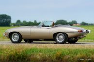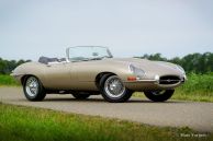 Jaguar E-type 3.8 Liter-serie 1 OTS, jaar 1963. ‘Matching Numbers and Colours’, een Heritage-certificaat om dit te bevestigen is aanwezig. Kleur ‘Opalescent Golden Sand’ gecombineerd met een ‘Light Tan’ leren interieur. ‘French Grey’ mohair soft-top en hood-cover. Deze fantastische Jaguar E-type OTS uit 1963 (Open Two Seater, ook Roadster genoemd) werd volledig en perfect gerestaureerd door een Nederlandse Jaguar-specialist. De restauratie begon in het jaar 2014 en deze werd voltooid in 2018. Deze Jaguar is ‘Nut & Bolt’ gerestaureerd; alles werd gerestaureerd/ gereviseerd en/ of vernieuwd. Kosten noch moeite zijn gespaard om perfectie te bereiken. Een compleet restauratiebestand met fotoreportage en facturen is aanwezig. Deze fabuleuze Jaguar E-type verkeert in perfecte concours-staat! De auto is uitgerust met een aluminium radiator, een verbeterd remsysteem, een roestvrijstalen uitlaat, verchroomde spaakwielen en een stuurwiel met houten rand. Deze E-type wordt compleet geleverd met de originele ‘tool-box’ en werkplaatshandleiding. Dit is een zeer begeerlijk TOP-exemplaar!