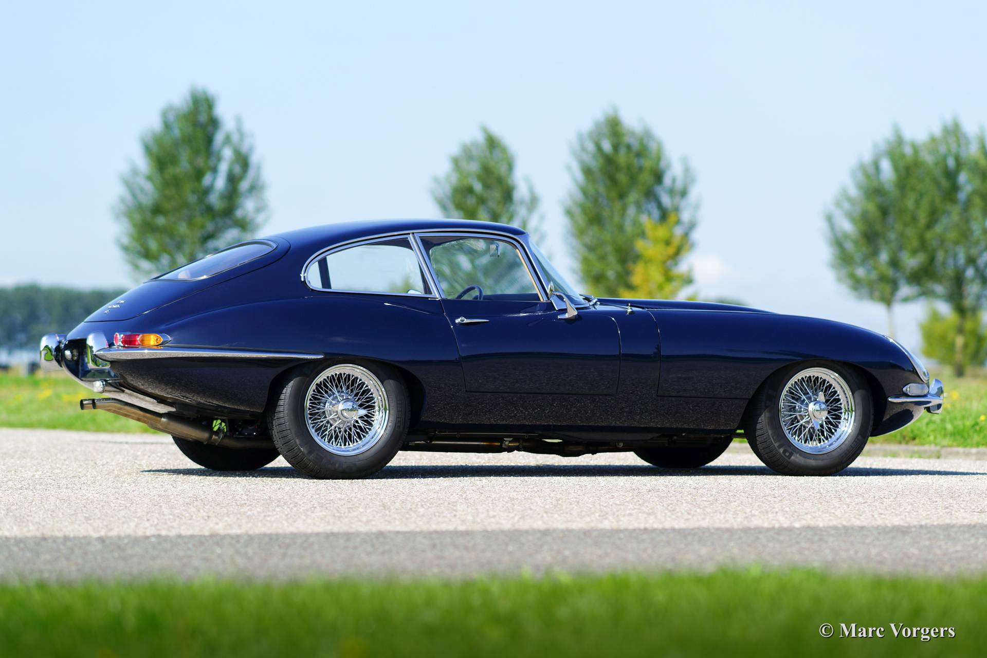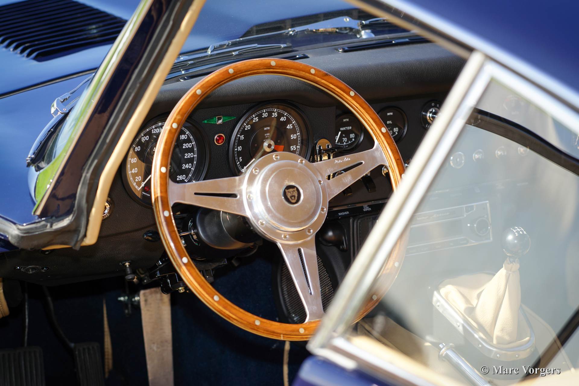 Jaguar E-type 4.2 Liter FHC serie 1, bouwjaar 1966. Kleur donkerblauw met een beige lederen interieur.