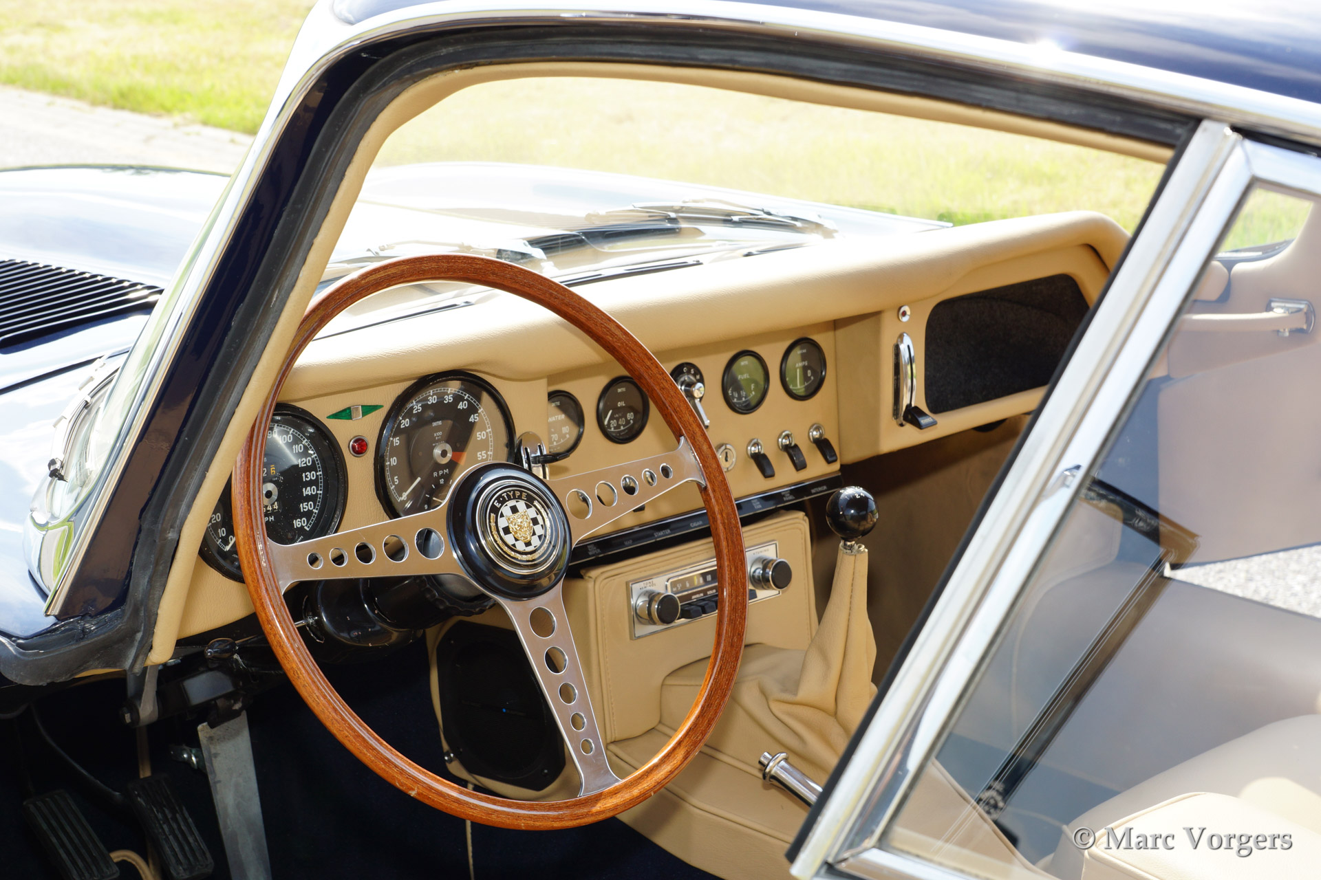 Jaguar E-type 4.2 Litre FHC serie 1, bouwjaar 1966. Kleur donkerblauw met een beige lederen interieur en donkerblauw tapijt. Deze fantastische Jaguar E-type werd prachtig gerestaureerd. De auto is in concoursstaat. Deze E-type is uitgerust met brede chroom spaakwielen, Pirelli P4000 banden, een aluminium hoge capaciteit radiator en een RVS uitlaat inclusief het uitlaatspruitstuk.