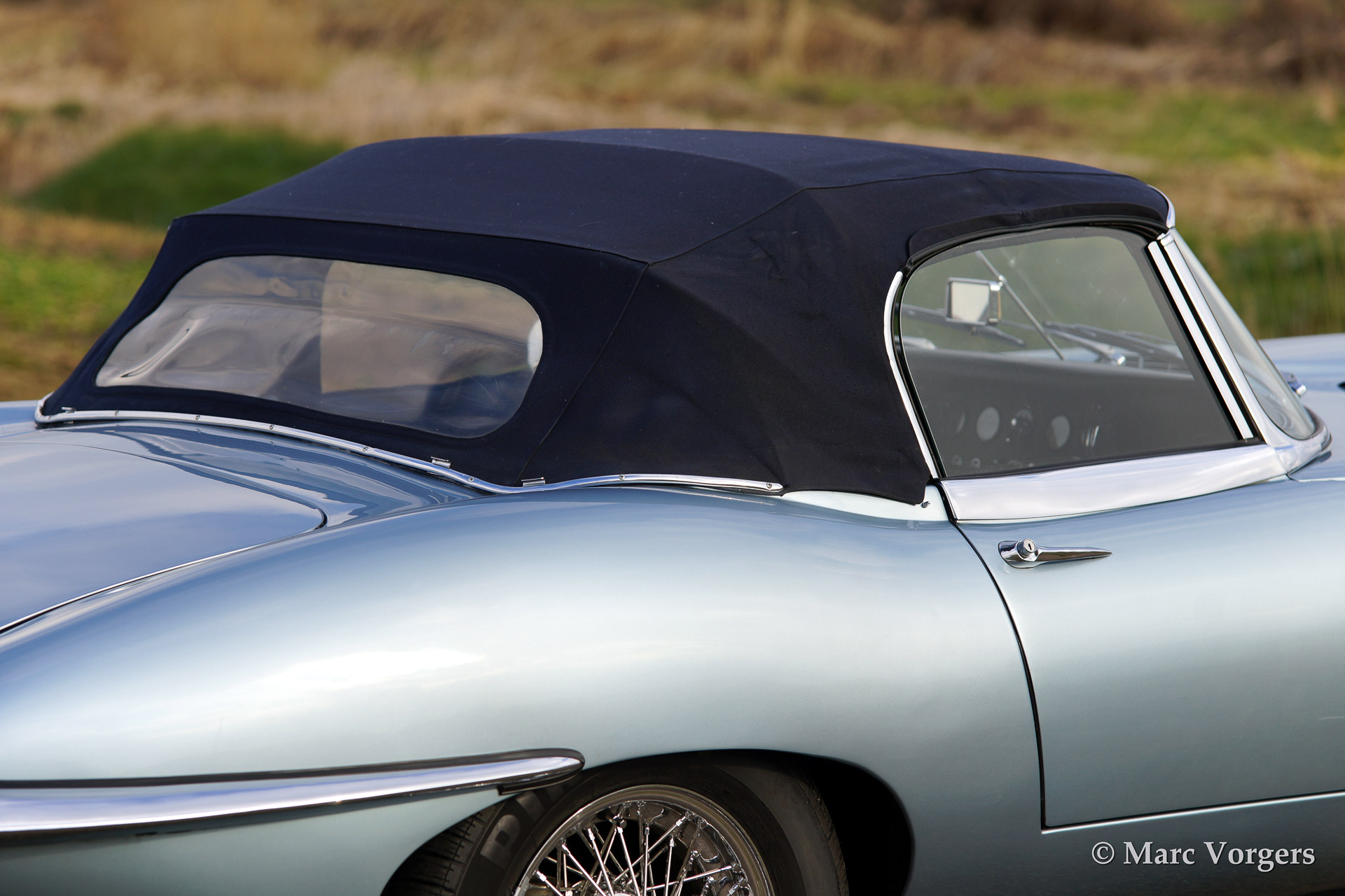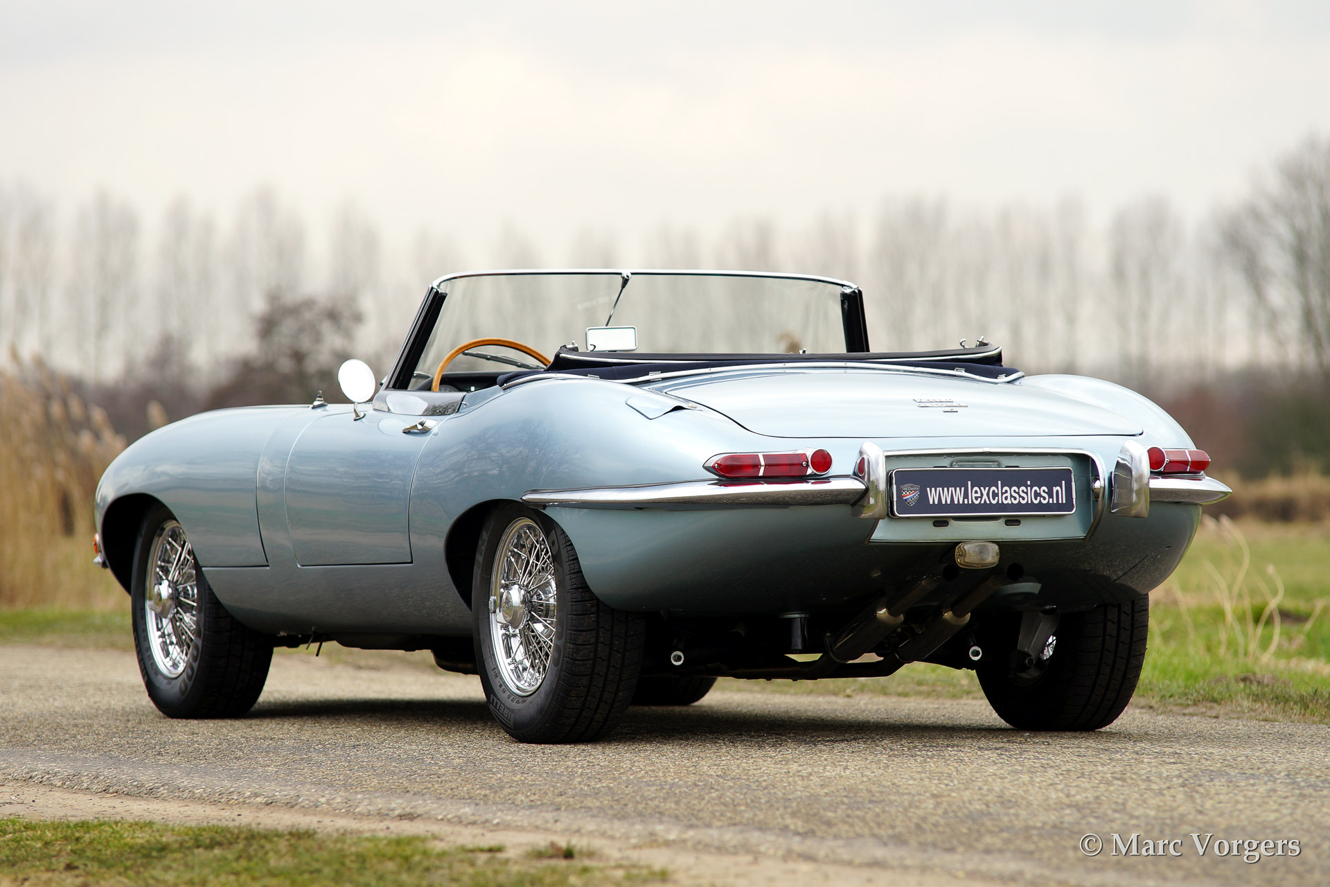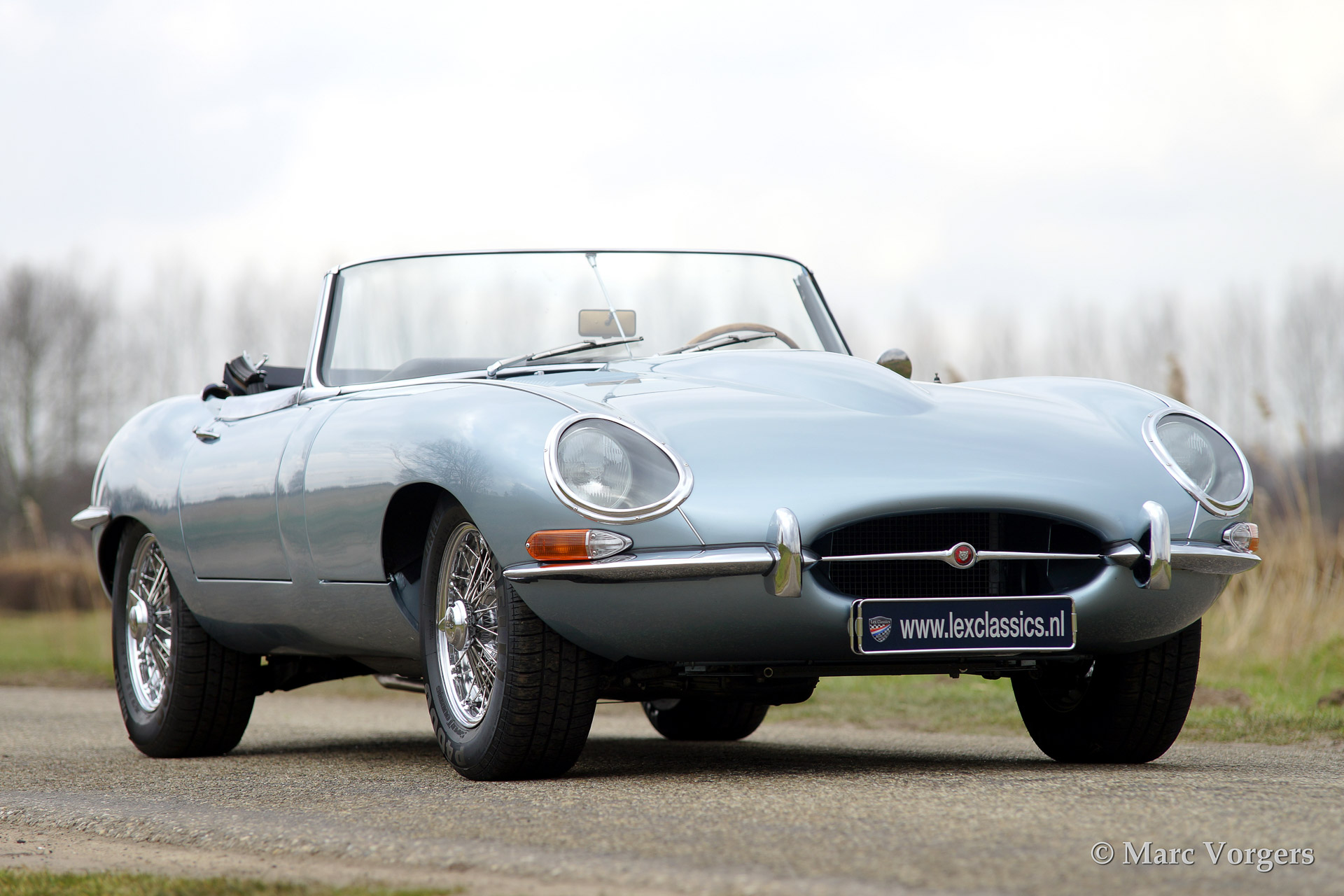 Jaguar E-type 4.2 Litre OTS (roadster) serie 1, bouwjaar 1965. Kleur 'Opalescent Silver Blue'. Blauw lederen interieur met blauw tapijt. Blauwe mohair soft top en hard top in carrosseriekleur! De auto is uitgerust met chroom spaakwielen.