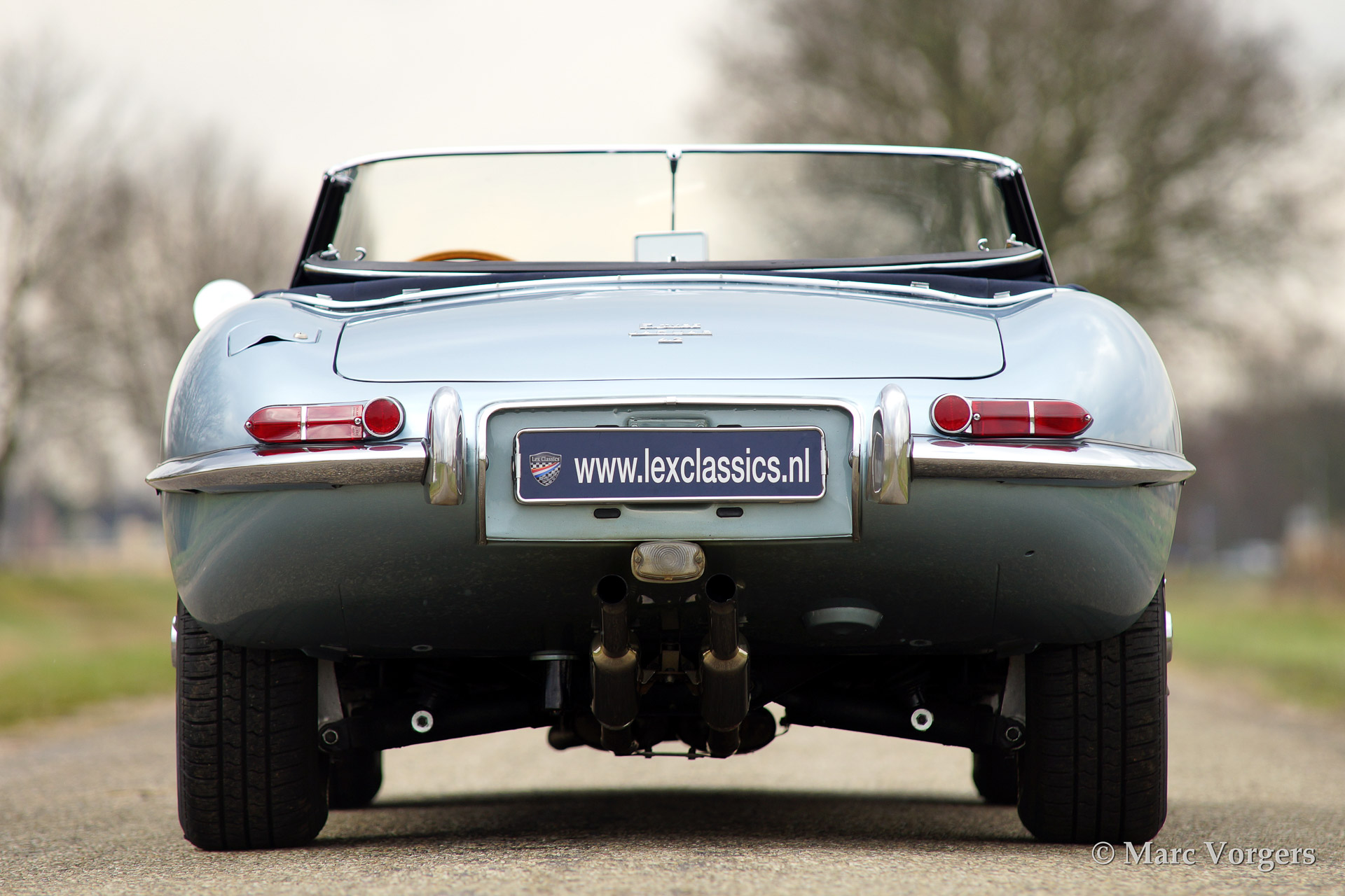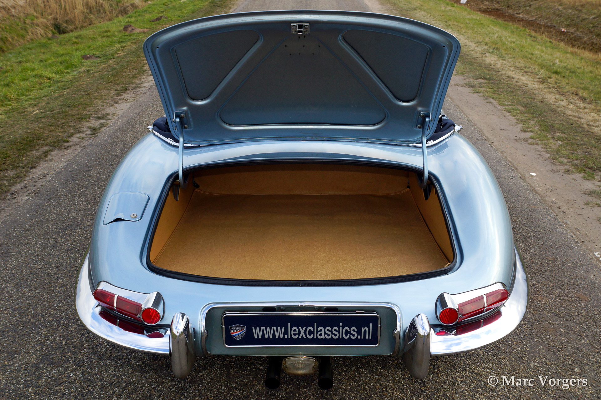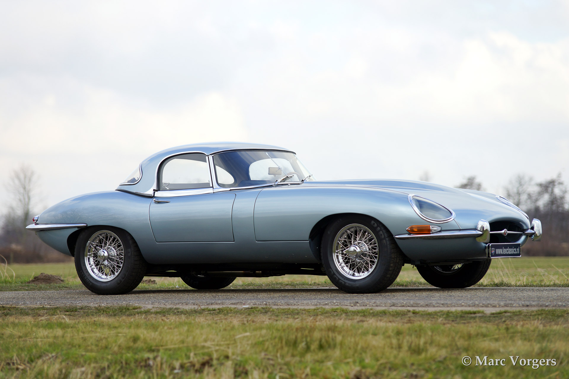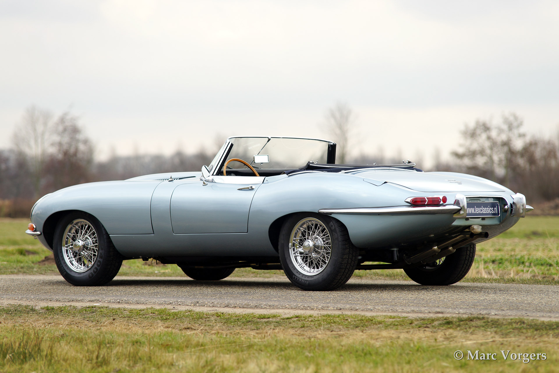 Jaguar E-type 4.2 Litre OTS (roadster) serie 1, bouwjaar 1965. Kleur 'Opalescent Silver Blue'. Blauw lederen interieur met blauw tapijt. Blauwe mohair soft top en hard top in carrosseriekleur! De auto is uitgerust met chroom spaakwielen.