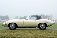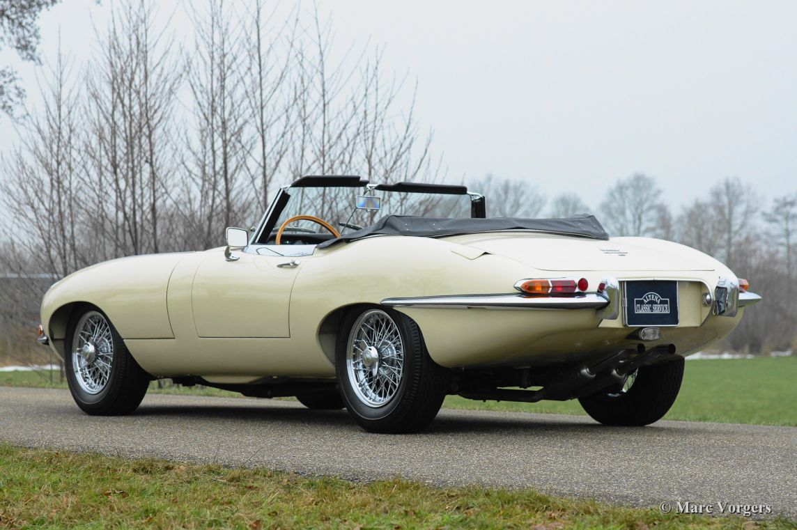 Jaguar E-type 4.2 Litre serie 1.5 OTS (Open Two Seater ook roadster genaamd), bouwjaar 1968. Kleur crème wit met een zwart lederen interieur. Deze geweldige Jaguar E-type OTS werd uitvoerig gerestaureerd. Deze E-type toont alle originele serie 1.5 details zoals de twee Stormberg carburateurs onder de motorkap volgend US specificatie.