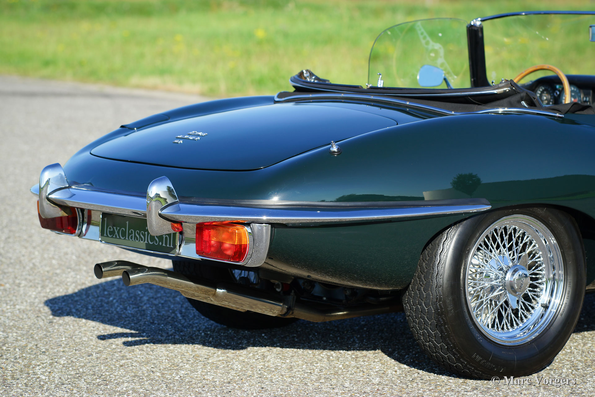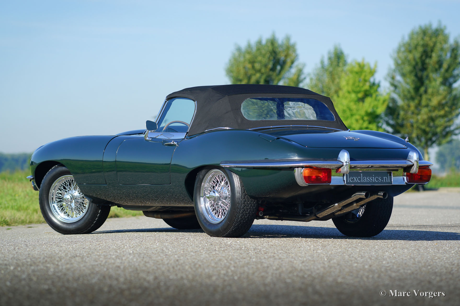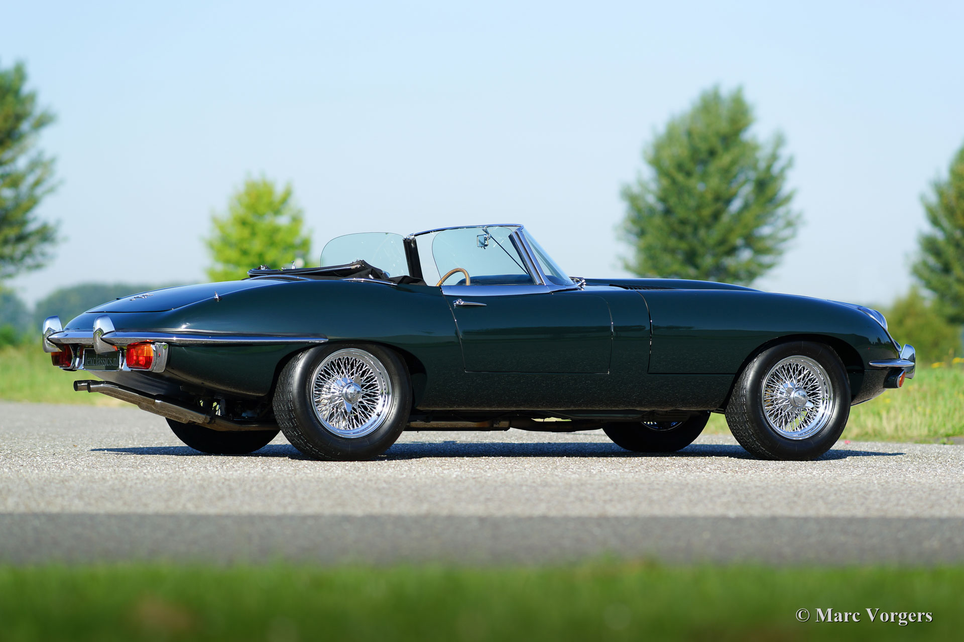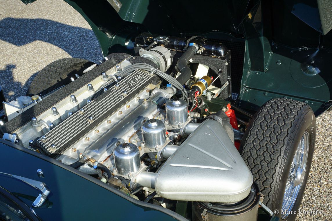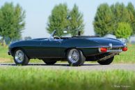 Jaguar E-type 4.2 Litre OTS serie 2, jaar 1970. Kleur British Racing Green met een zwartleren interieur en zwart tapijt. Zwarte mohair soft-top. Deze machtige Jaguar E-type 4.2 Litre Open Two Seater (OTS, ook wel roadster genoemd), werd in het verleden uitvoerig en ‘body-off’ gerestaureerd. In recente jaren is de auto door Lex Classics voorzien van perfecte nieuwe lak. Foto’s van deze deelrestauratie zijn aanwezig. Deze prachtige Jaguar E-type is 25 jaar lang gekoesterd door een liefhebber en de auto verkeert daardoor in excellente staat! De Jaguar is uitgerust met brede chroom spaakwielen, chroom ‘knock-off’ vleugelmoeren, een tripmaster en radio met antenne. Een prachtige E-type en een voortreffelijke rijdersauto in excellente staat!