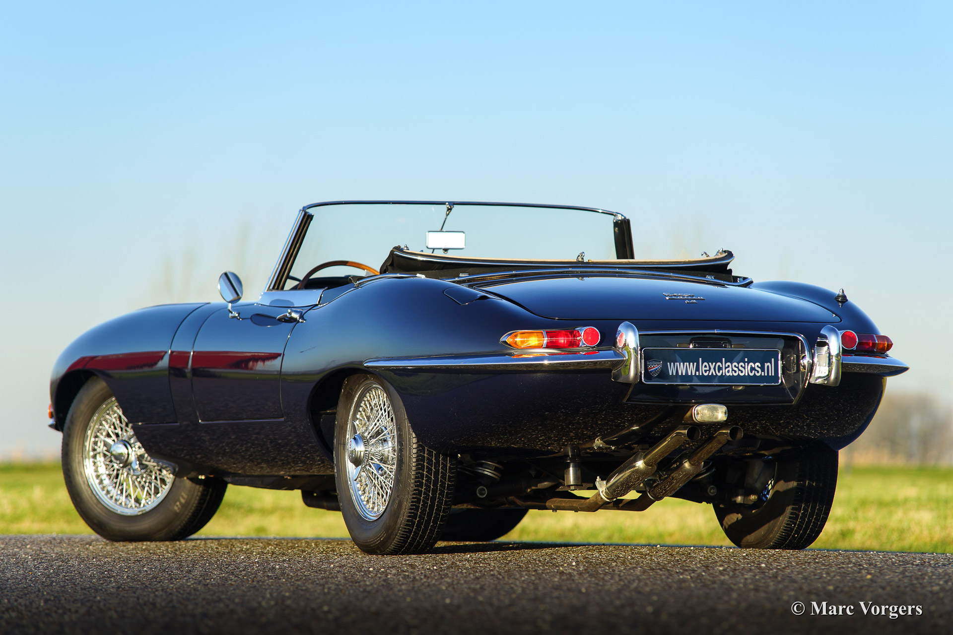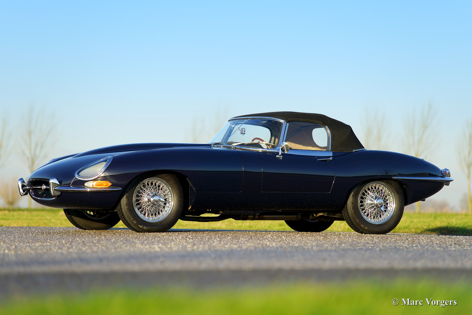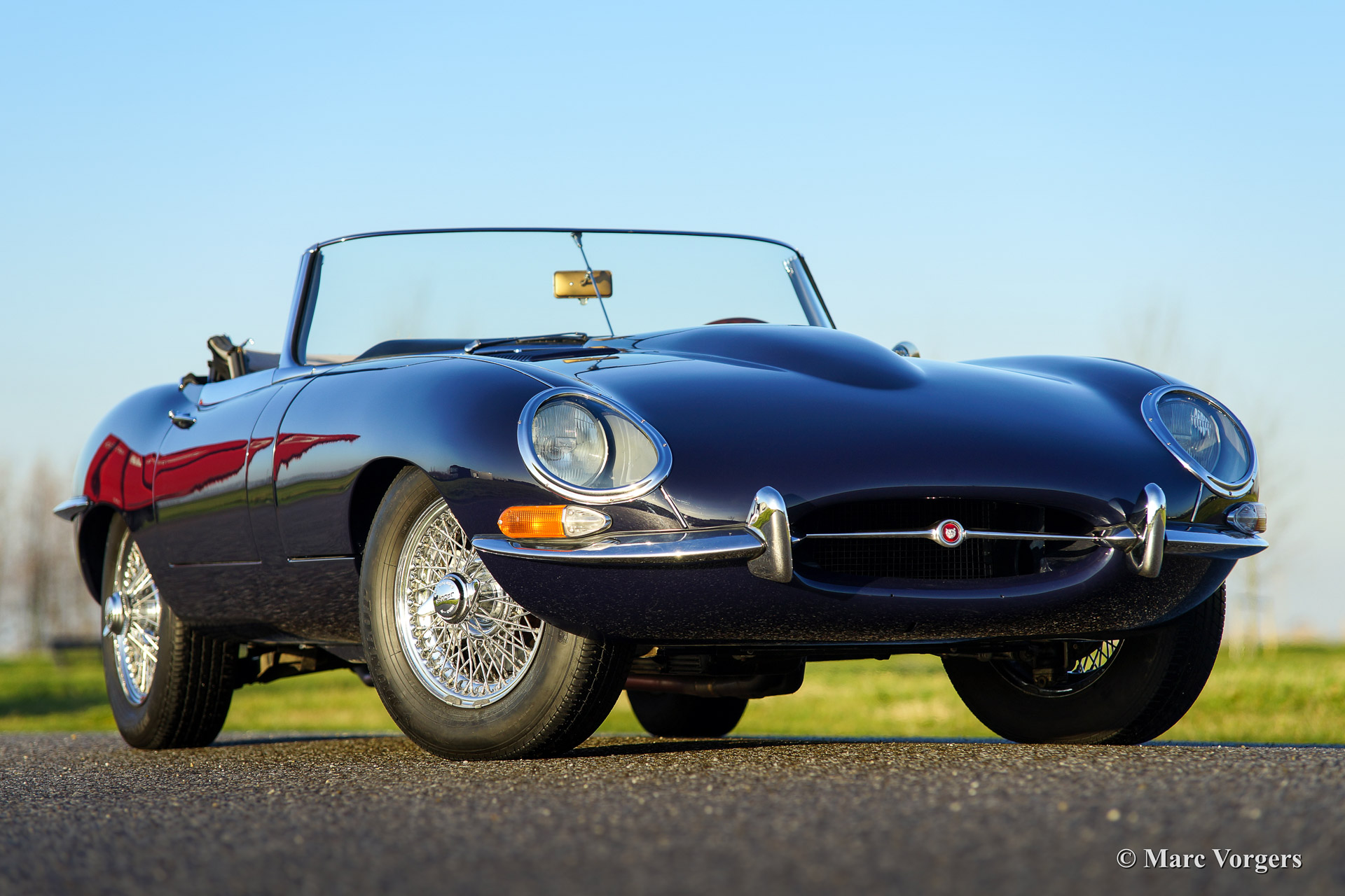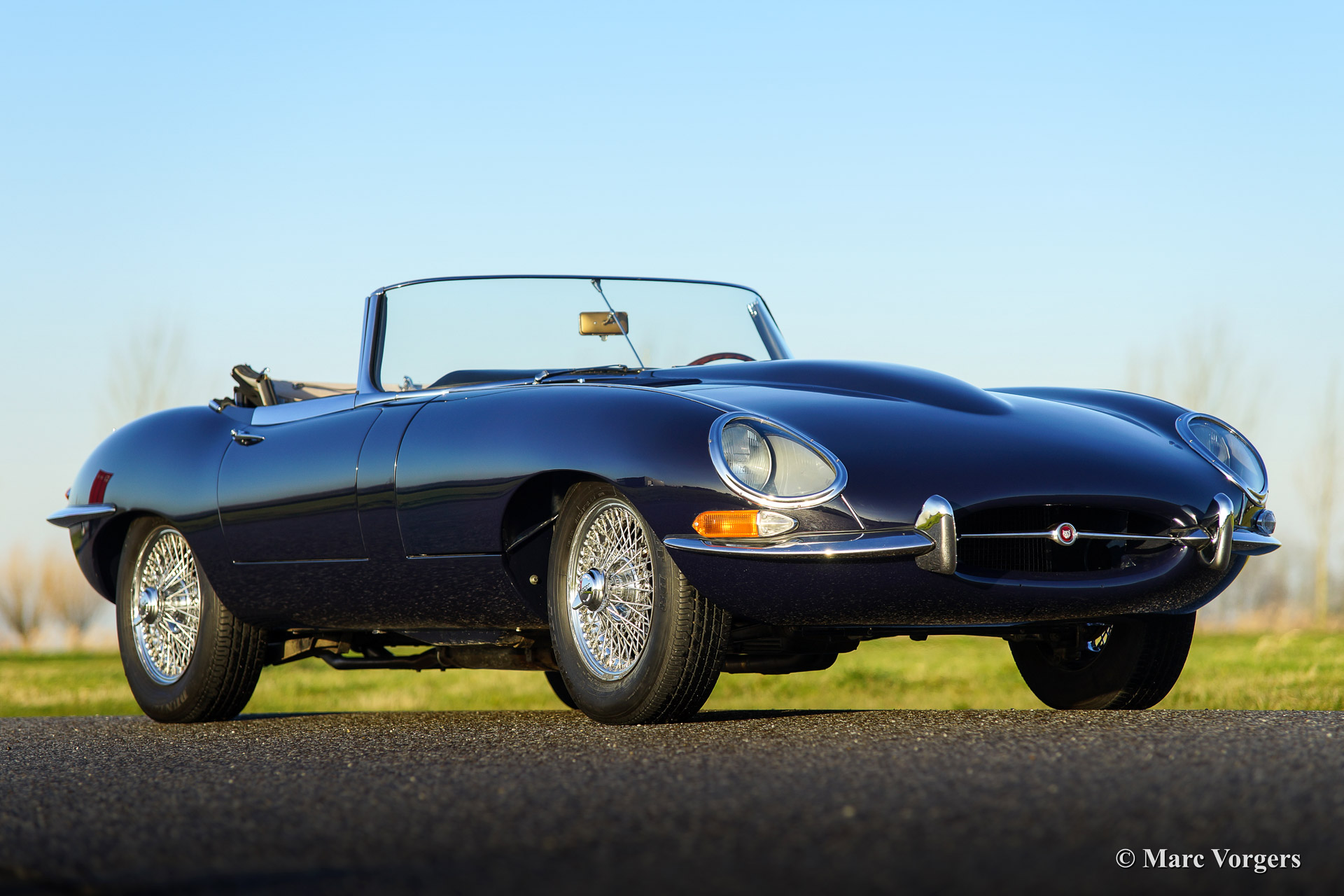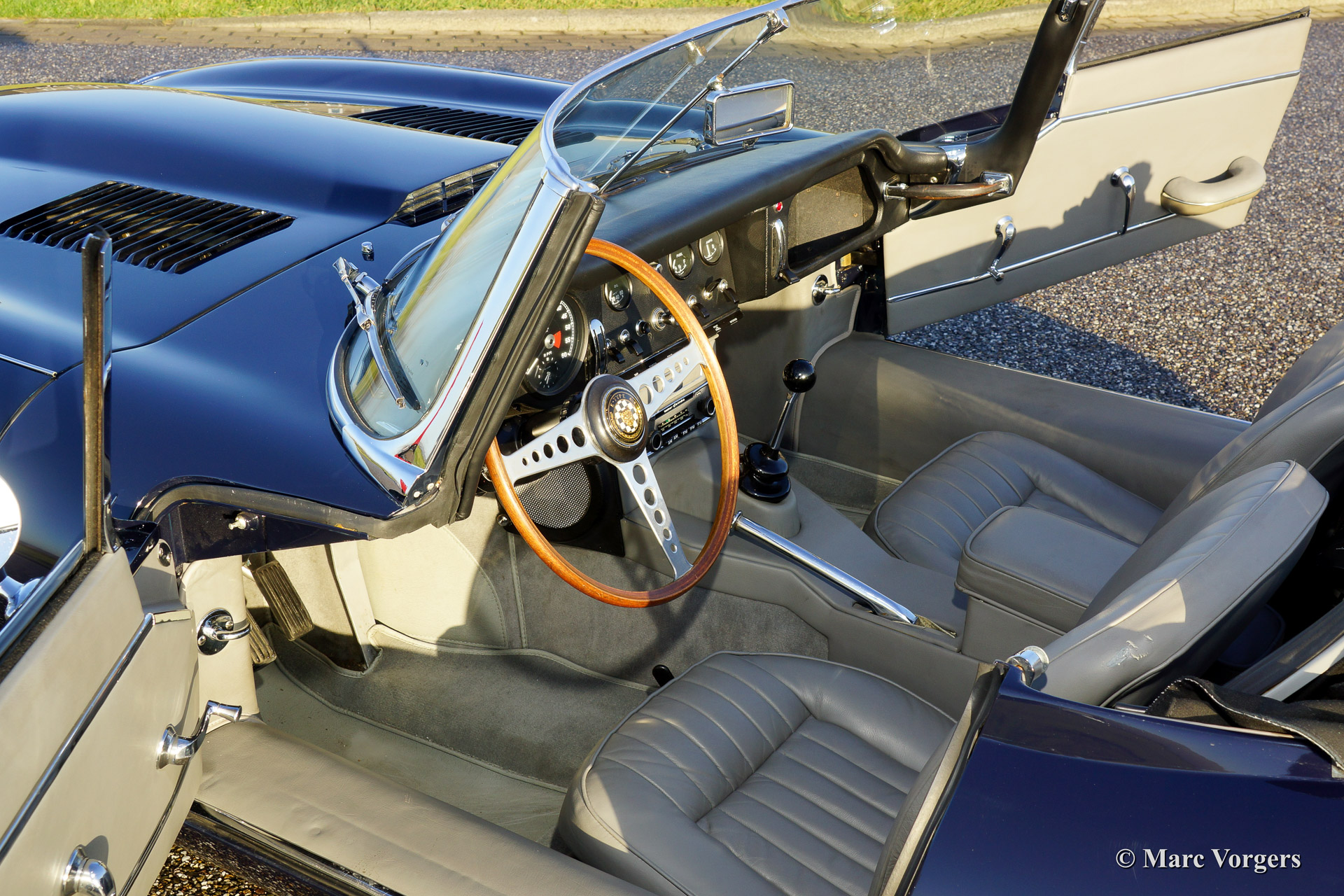 Jaguar E-type 4.2 Litre OTS (roadster) serie 1, bouwjaar 1965. Kleur donkerblauw met een grijs lederen interieur en grijs tapijt. Blauwe mohair soft top. uitvoerig gerestaureerd in het jaar 2007. Deze E-Type 4.2 Litre roadster is voorzien van chroom spaakwielen, stuurbekrachtiging, elektrische Kenlow fan, wisselstroom dynamo, RVS uitlaat en 123 elektronische ontsteking.