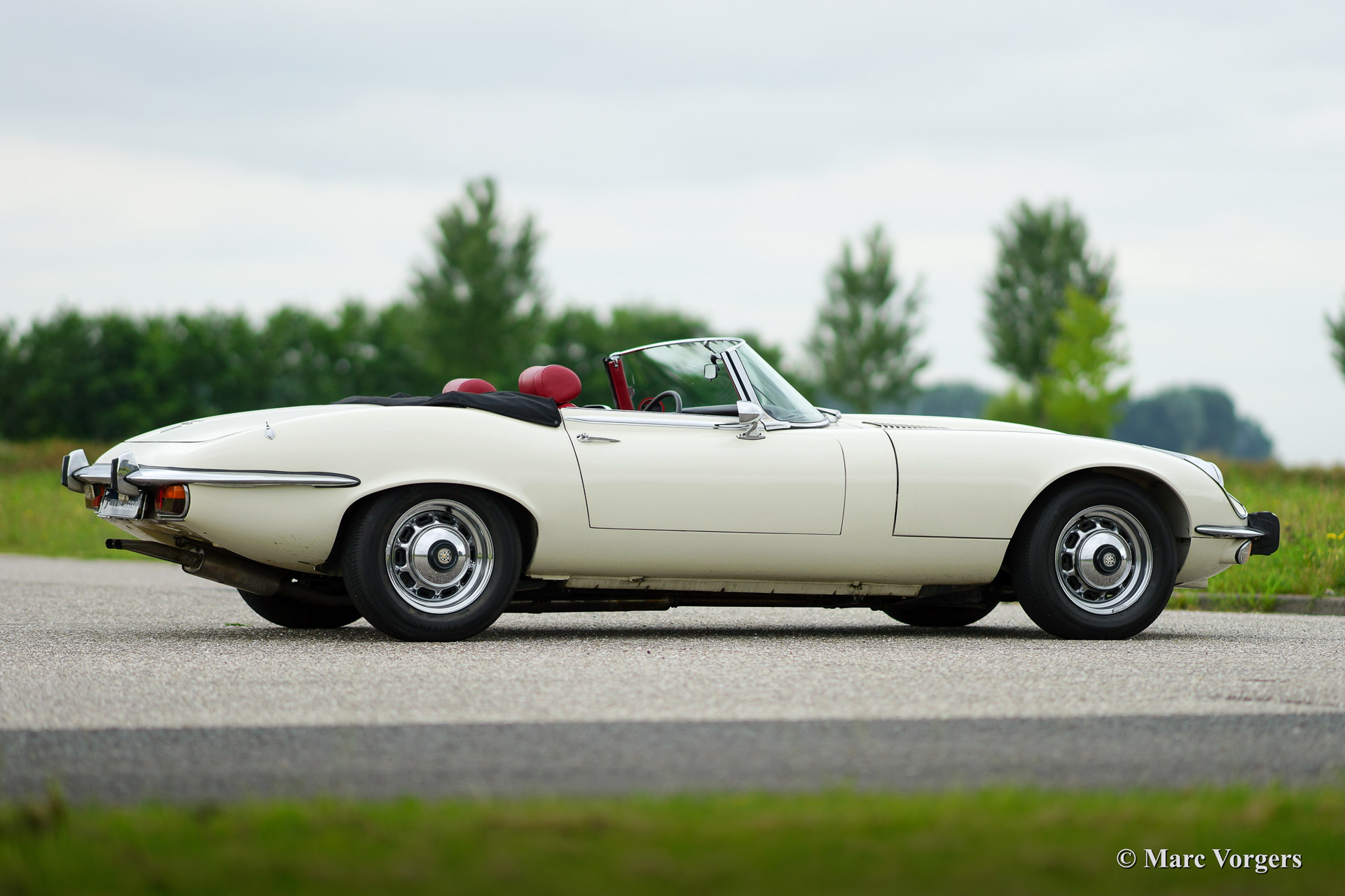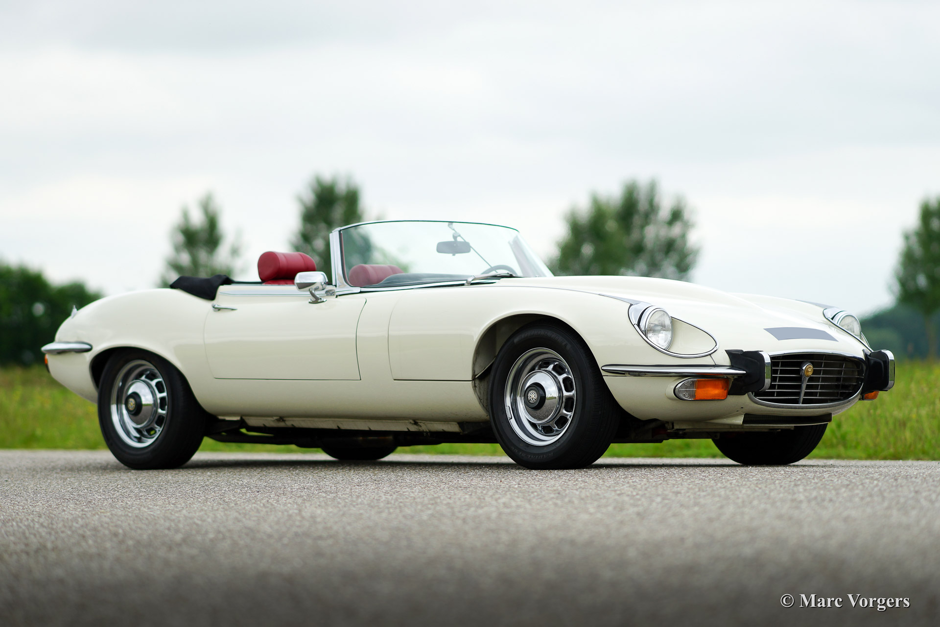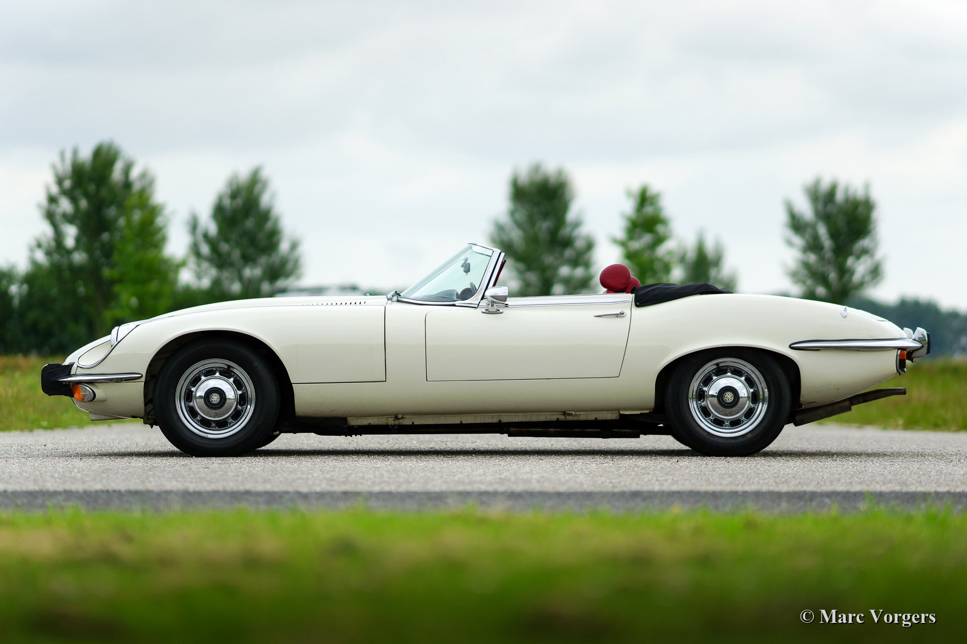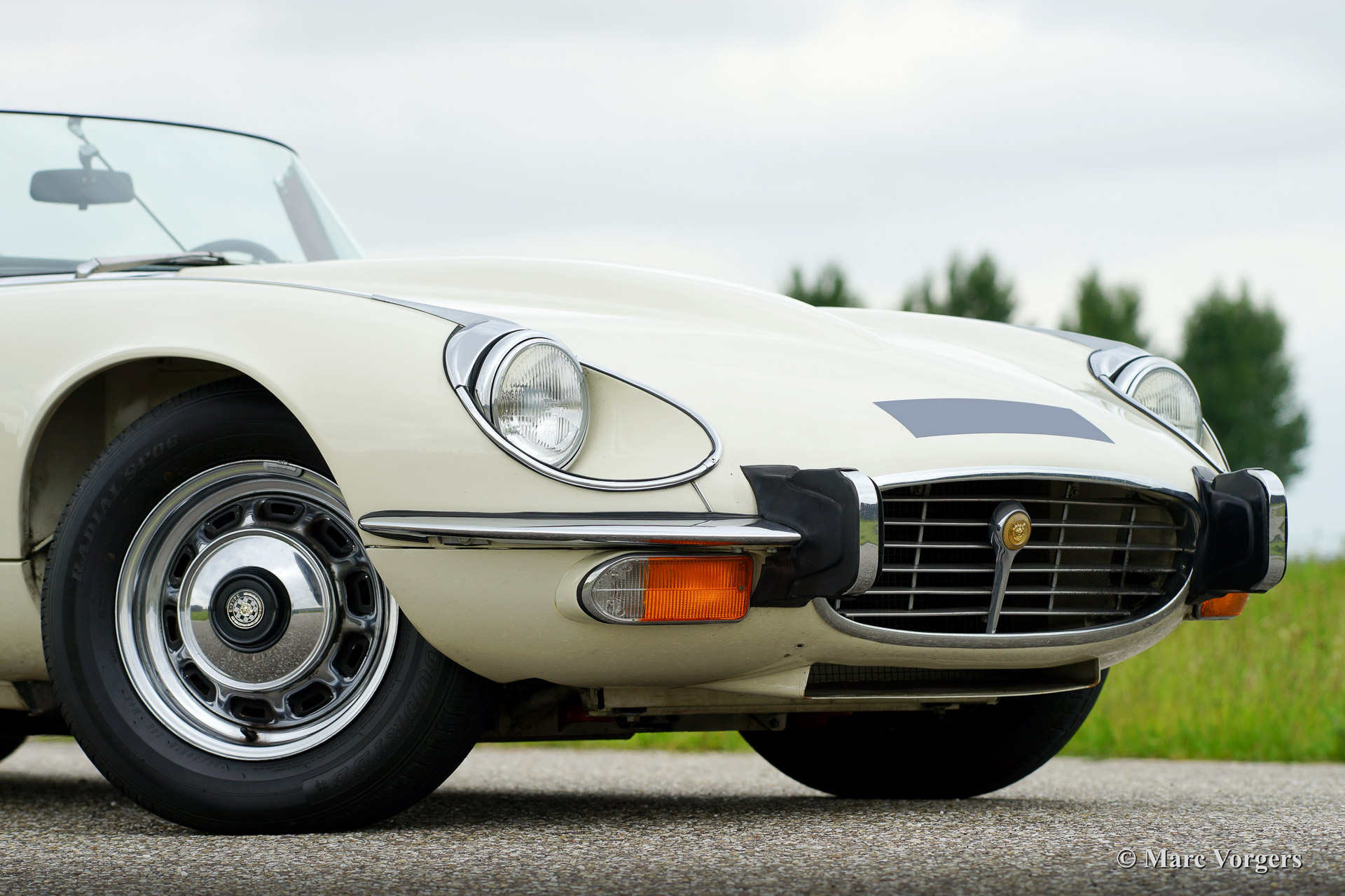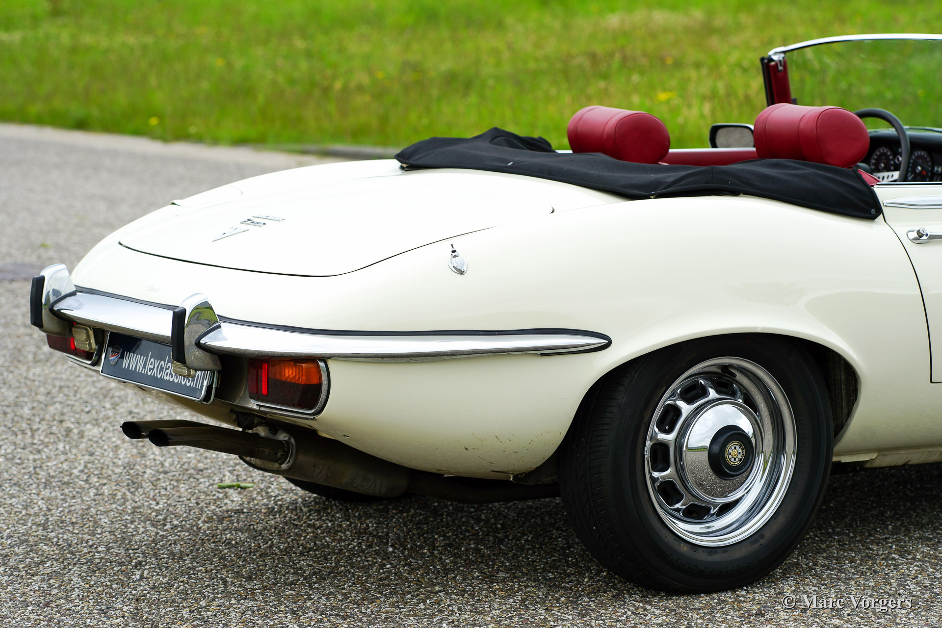 Jaguar E-type V12 convertible, bouwjaar 1973. Chassisnummer UD1s75045BW, motornummer 7S12108LA. Kleur 'Old English White' met een rood lederen interieur, rood tapijt en een zwarte soft top. Deze indrukwekkende Jaguar E-type V12 werd in 1993 van uit Amerika naar België geïmporteerd. In 1994 kwam de auto naar Nederland. Van 1994 tot en met het jaar 2000 werd de automobiel gerestaureerd door de bekende Jaguar specialist Kolvenbach. Deze fraaie E-type V12 verkeert in excellente staat! De auto is voorzien van de originele chroom 'disk wheels' met wieldoppen, airconditioning, stuurbekrachtiging, 'high torque' startmotor, RVS uitlaat, alarm systeem en een klassieke radio. Een zeer fraaie E-type V12!