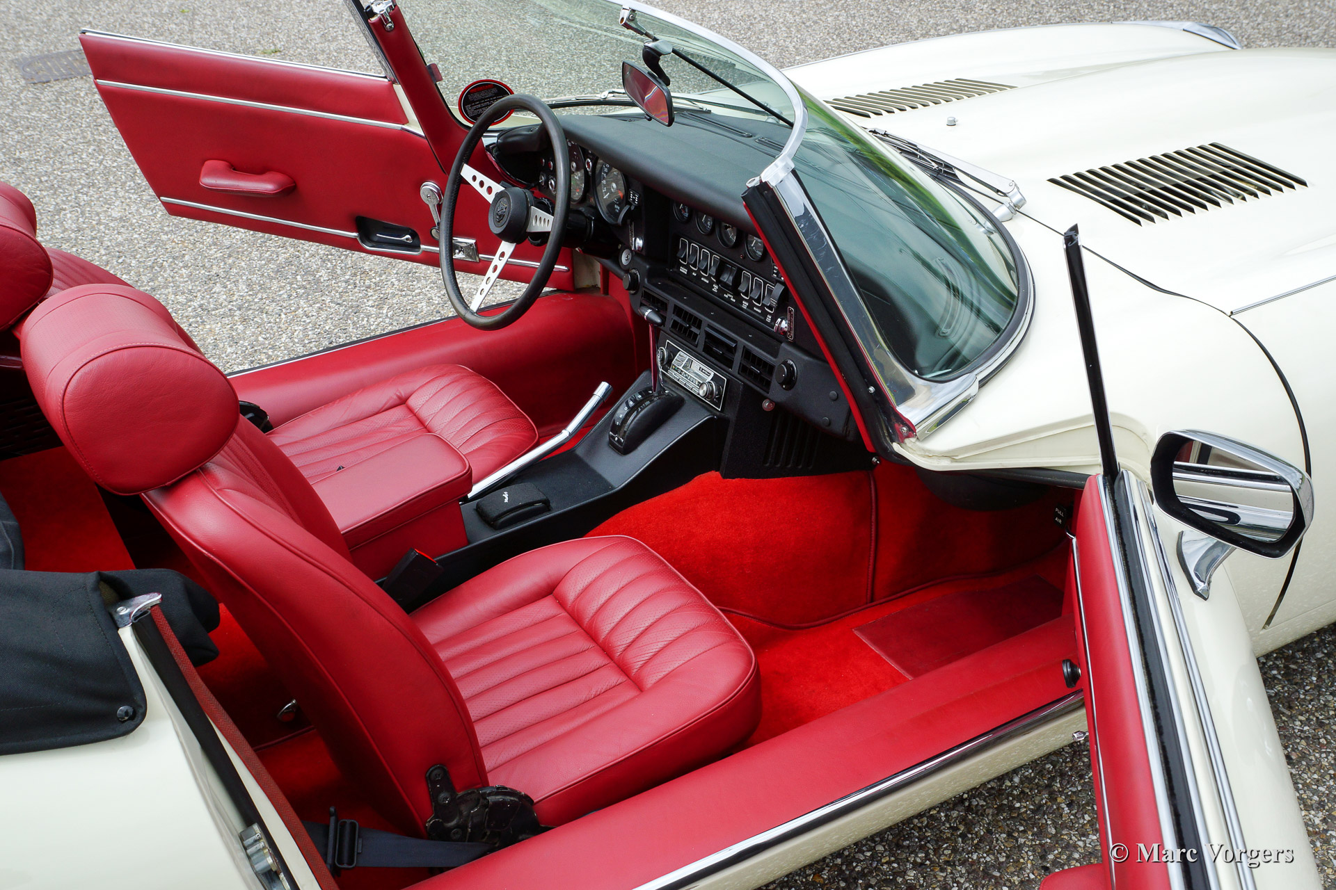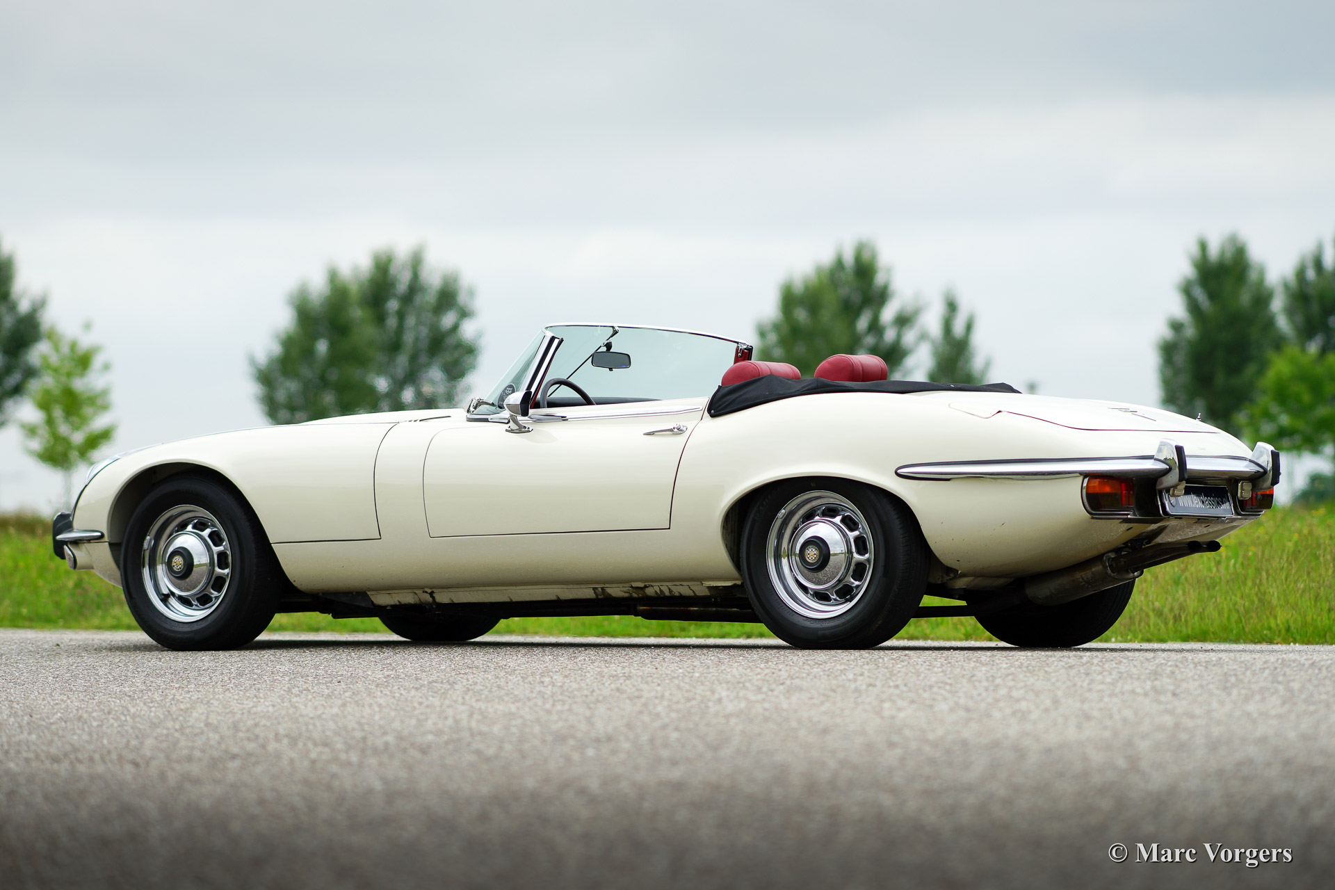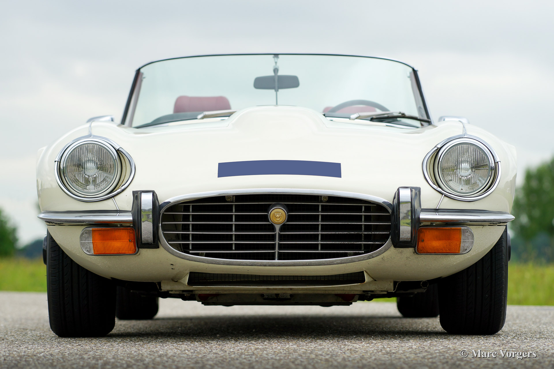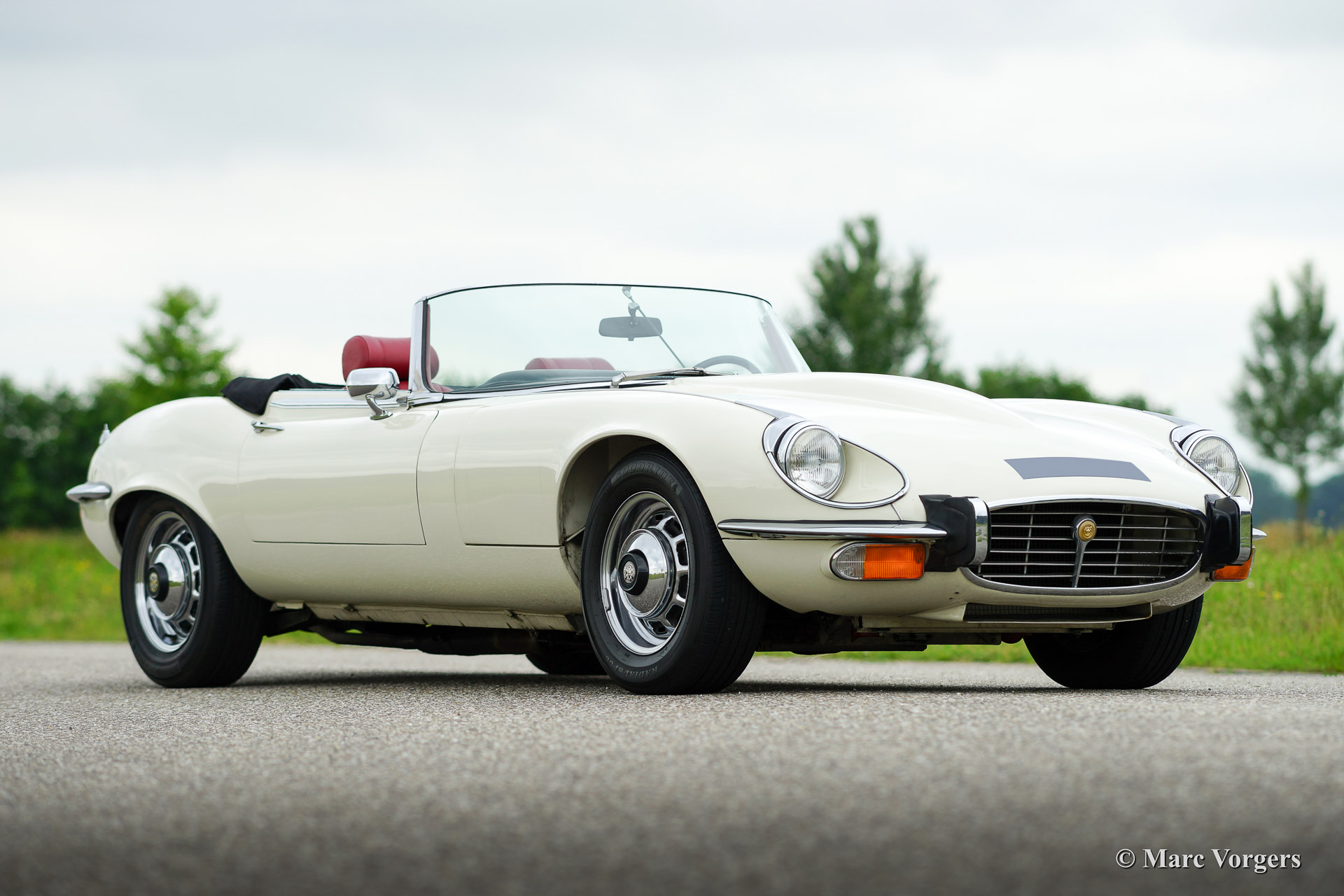 Jaguar E-type V12 convertible, bouwjaar 1973. Chassisnummer UD1s75045BW, motornummer 7S12108LA. Kleur 'Old English White' met een rood lederen interieur, rood tapijt en een zwarte soft top. Deze indrukwekkende Jaguar E-type V12 werd in 1993 van uit Amerika naar België geïmporteerd. In 1994 kwam de auto naar Nederland. Van 1994 tot en met het jaar 2000 werd de automobiel gerestaureerd door de bekende Jaguar specialist Kolvenbach. Deze fraaie E-type V12 verkeert in excellente staat! De auto is voorzien van de originele chroom 'disk wheels' met wieldoppen, airconditioning, stuurbekrachtiging, 'high torque' startmotor, RVS uitlaat, alarm systeem en een klassieke radio. Een zeer fraaie E-type V12!