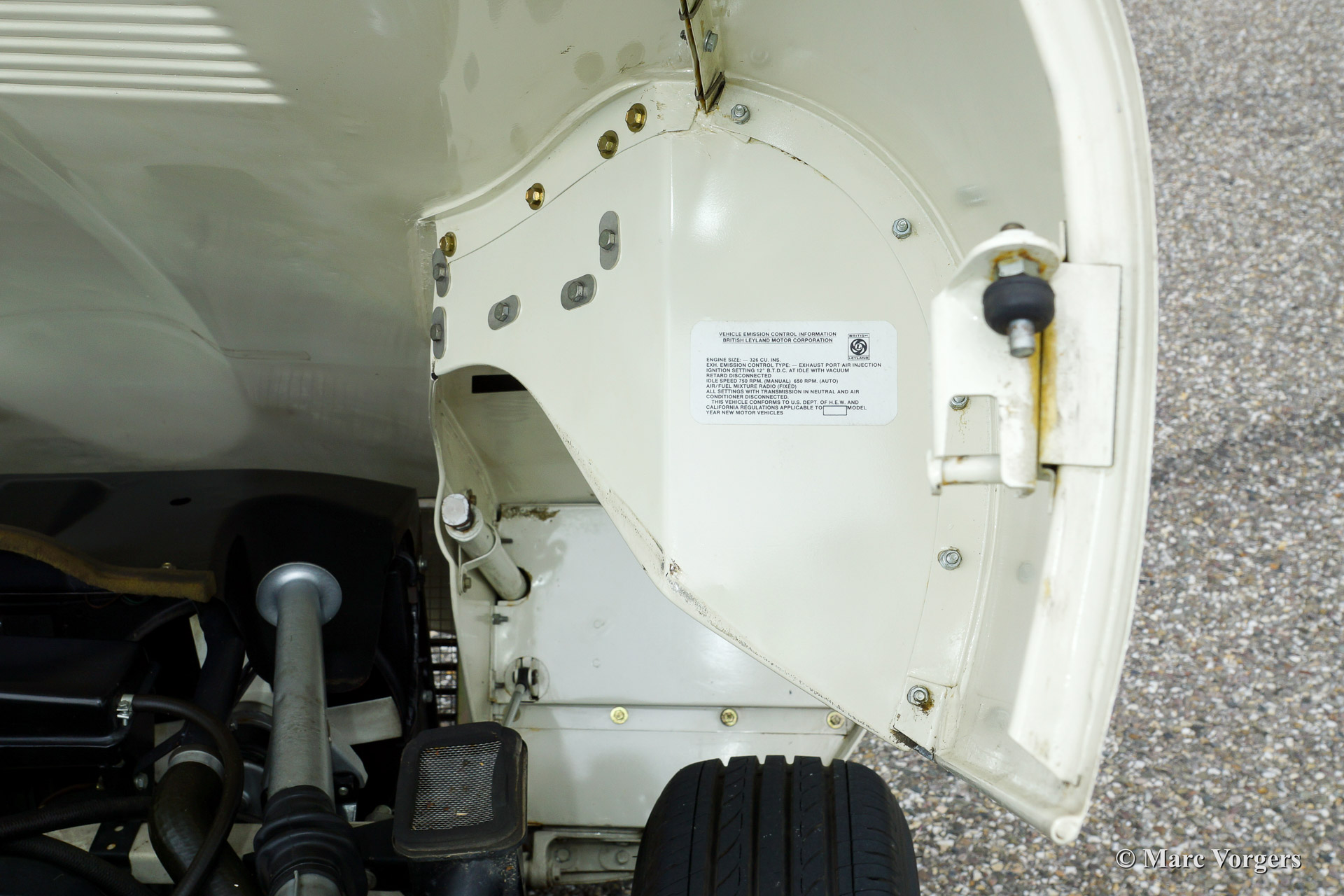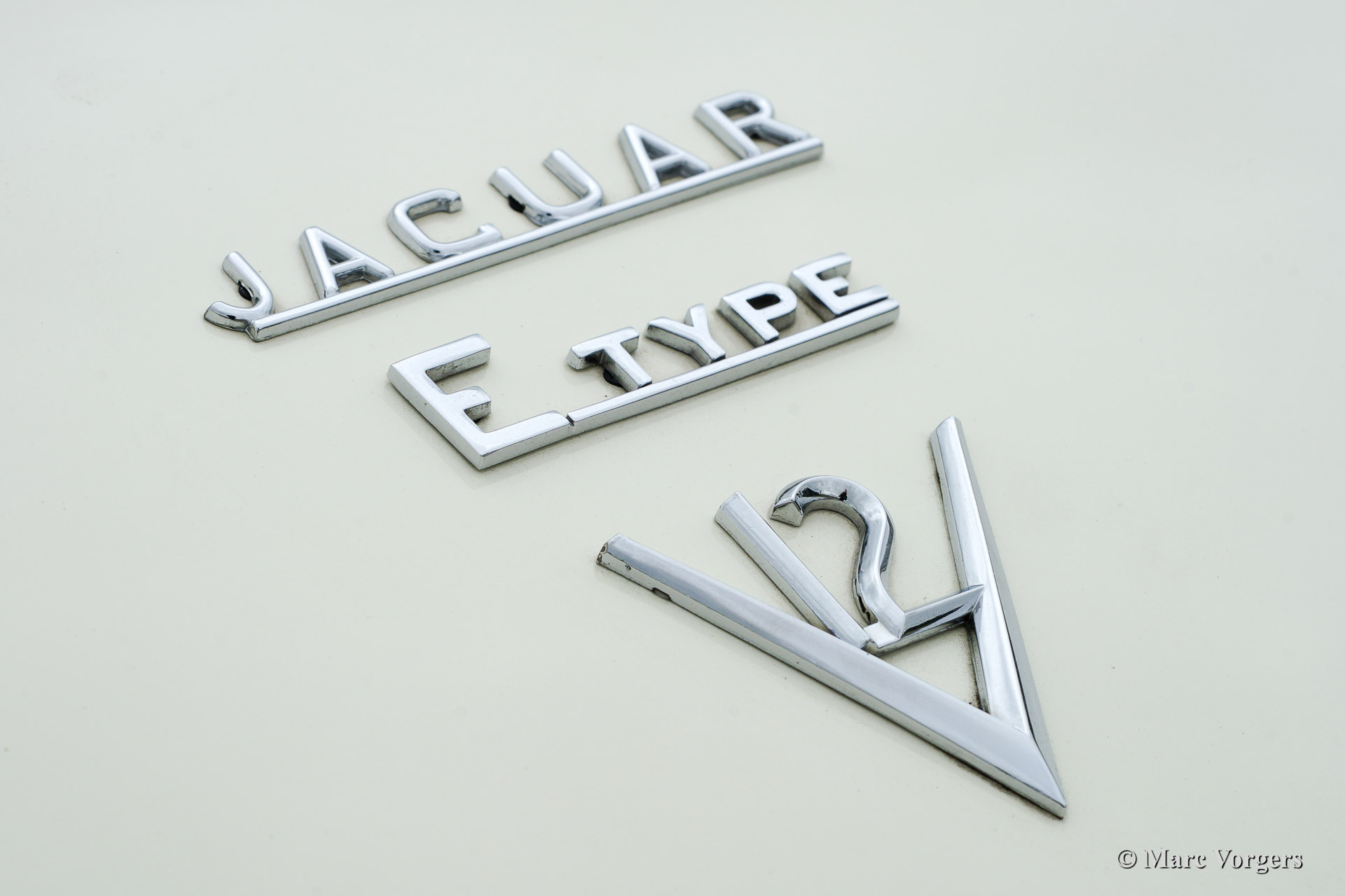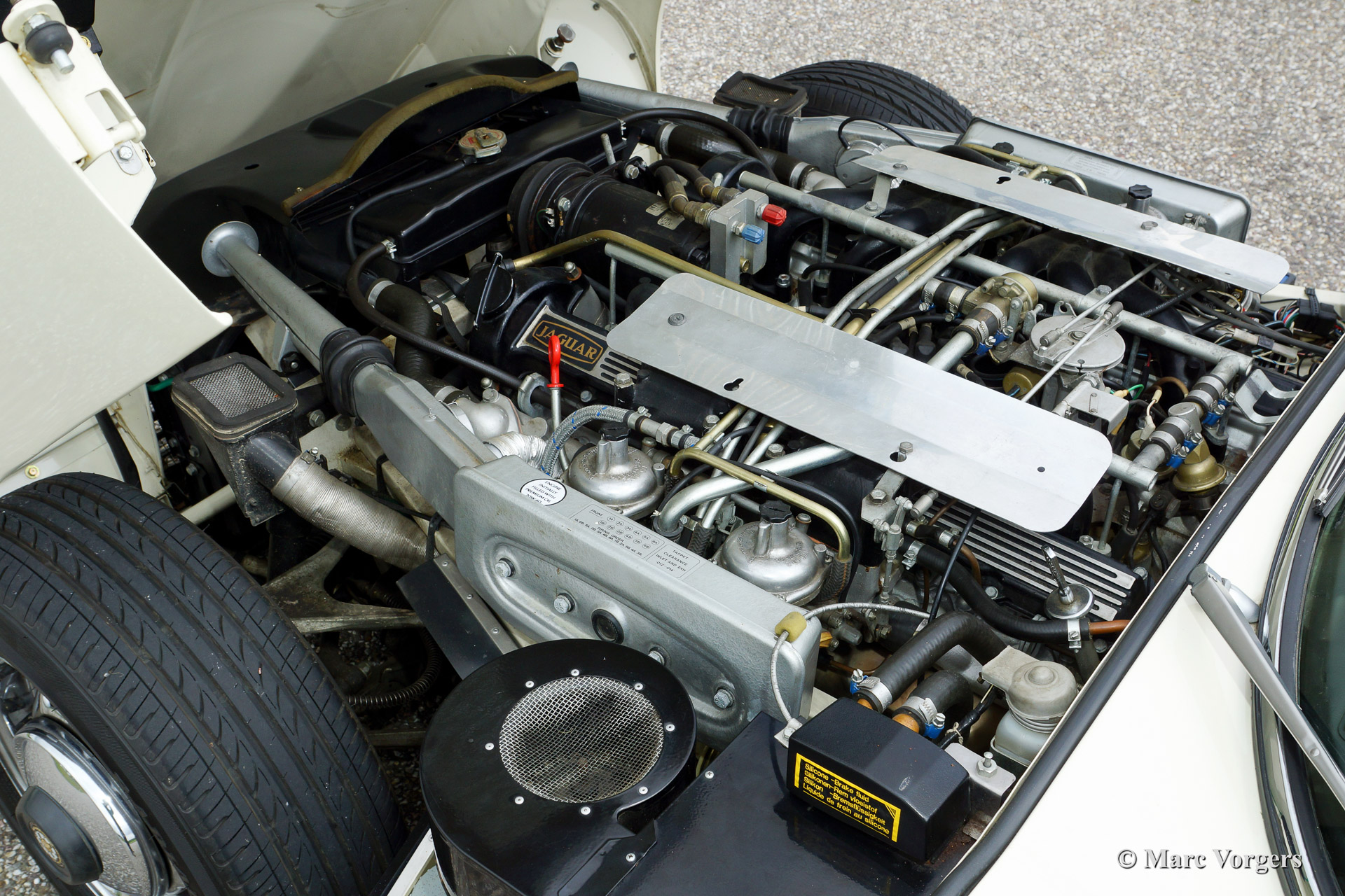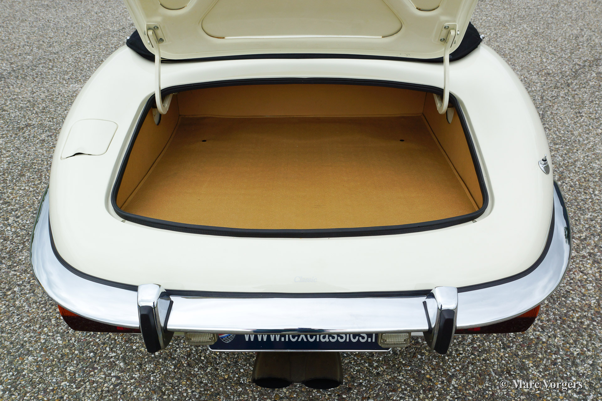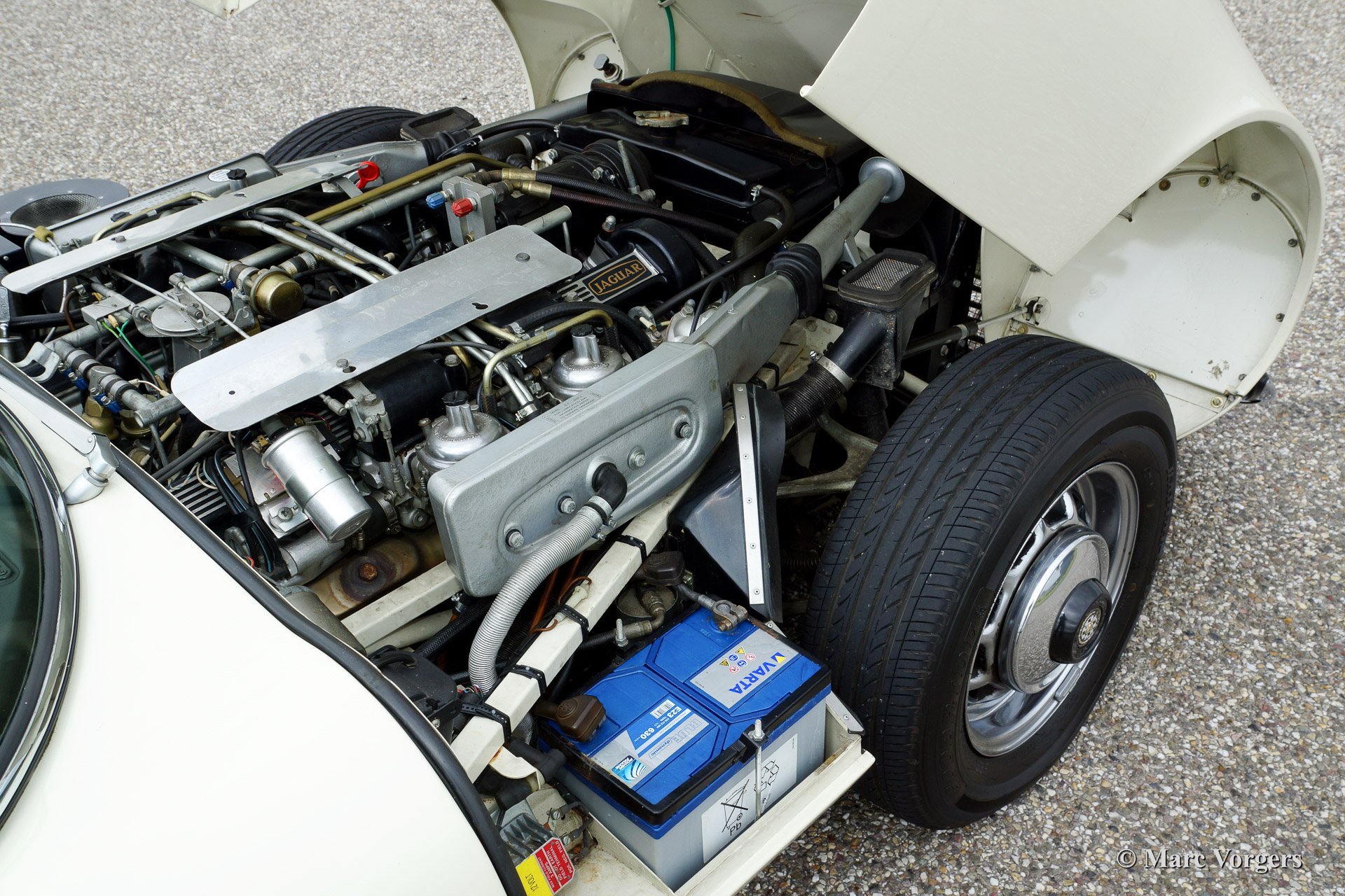 Jaguar E-type V12 convertible, bouwjaar 1973. Chassisnummer UD1s75045BW, motornummer 7S12108LA. Kleur 'Old English White' met een rood lederen interieur, rood tapijt en een zwarte soft top. Deze indrukwekkende Jaguar E-type V12 werd in 1993 van uit Amerika naar België geïmporteerd. In 1994 kwam de auto naar Nederland. Van 1994 tot en met het jaar 2000 werd de automobiel gerestaureerd door de bekende Jaguar specialist Kolvenbach. Deze fraaie E-type V12 verkeert in excellente staat! De auto is voorzien van de originele chroom 'disk wheels' met wieldoppen, airconditioning, stuurbekrachtiging, 'high torque' startmotor, RVS uitlaat, alarm systeem en een klassieke radio. Een zeer fraaie E-type V12!