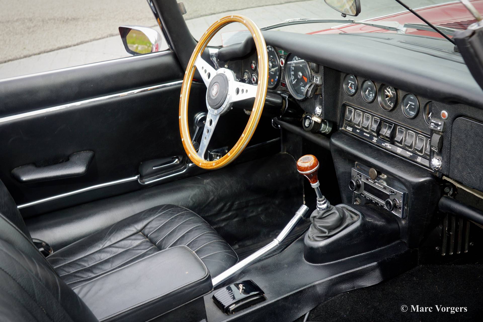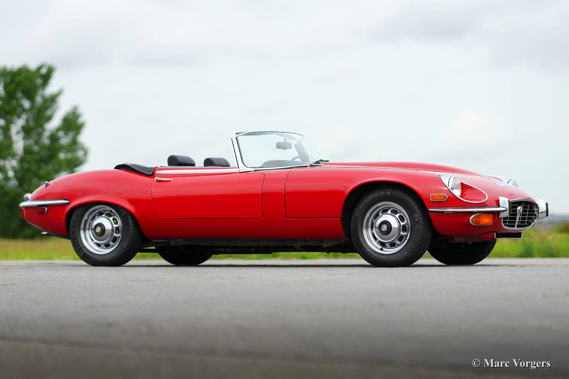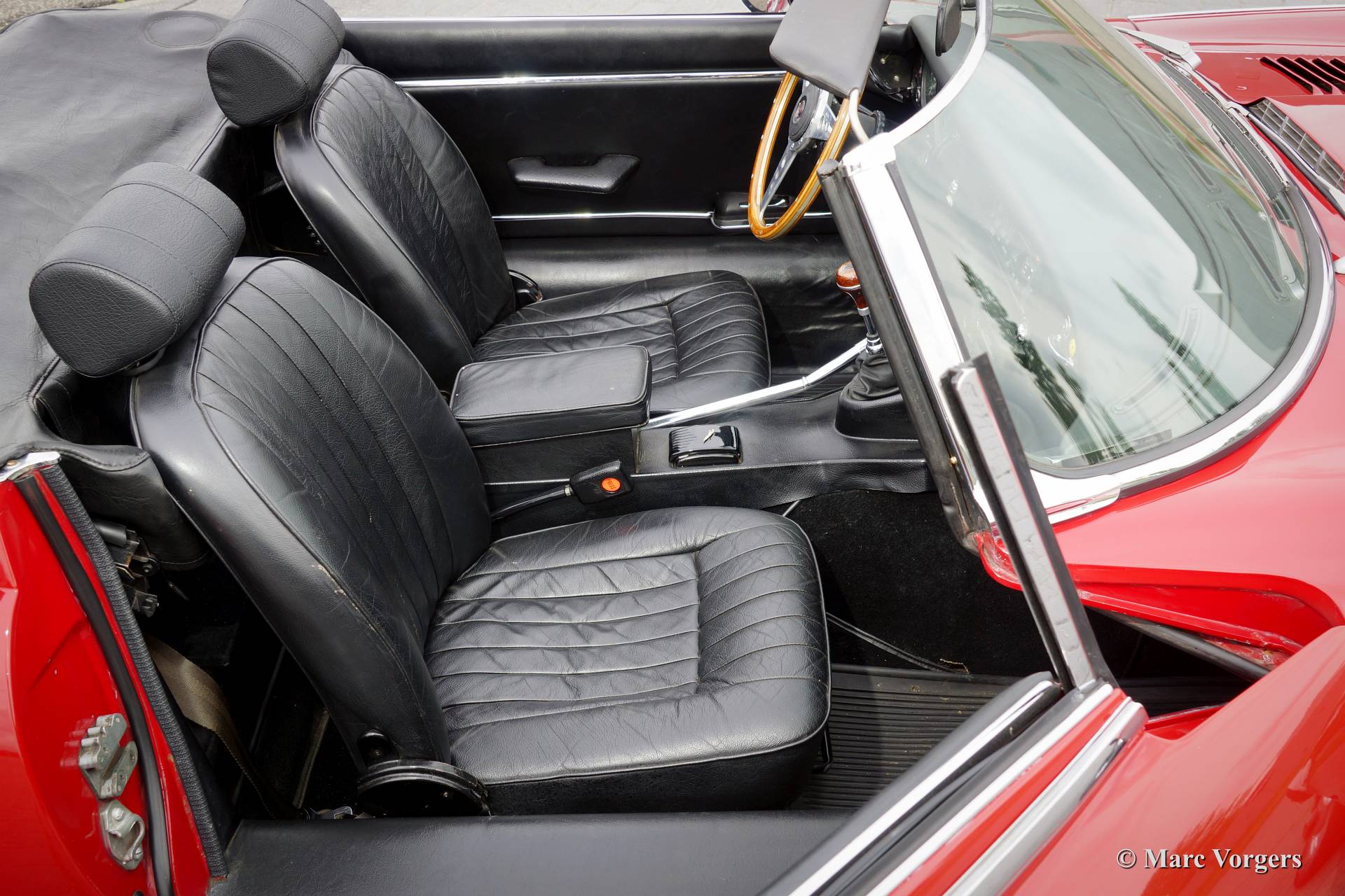 Jaguar E-type V12 roadster, bouwjaar 1973. Kleur rood met een zwart lederen interieur en zwart tapijt. Zwarte soft top. Deze indrukwekkende E-type V12 werd in 1994 vanuit de USA naar Nederland geïmporteerd. De laatste Nederlandse eigenaar heeft de auto vanaf 2007 in zijn bezit. Deze Jaguar E-type is altijd zeer goed onderhouden door een Jaguar specialist, de auto verkeert in zeer goede staat! Deze E-type V12 roadster is nu eens niet voorzien van een automaat, met de handgeschakelde vier-versnellingsbak kunt u het enorme koppel van de V12 volledig naar uw hand zetten!
