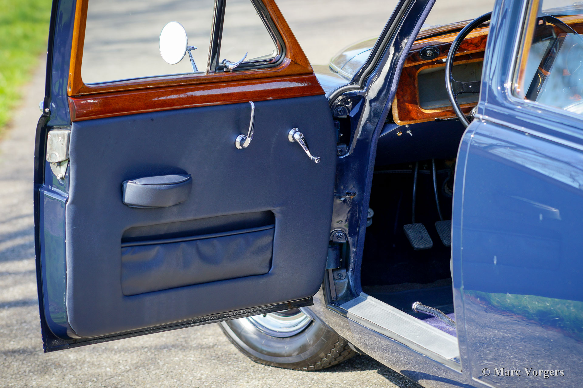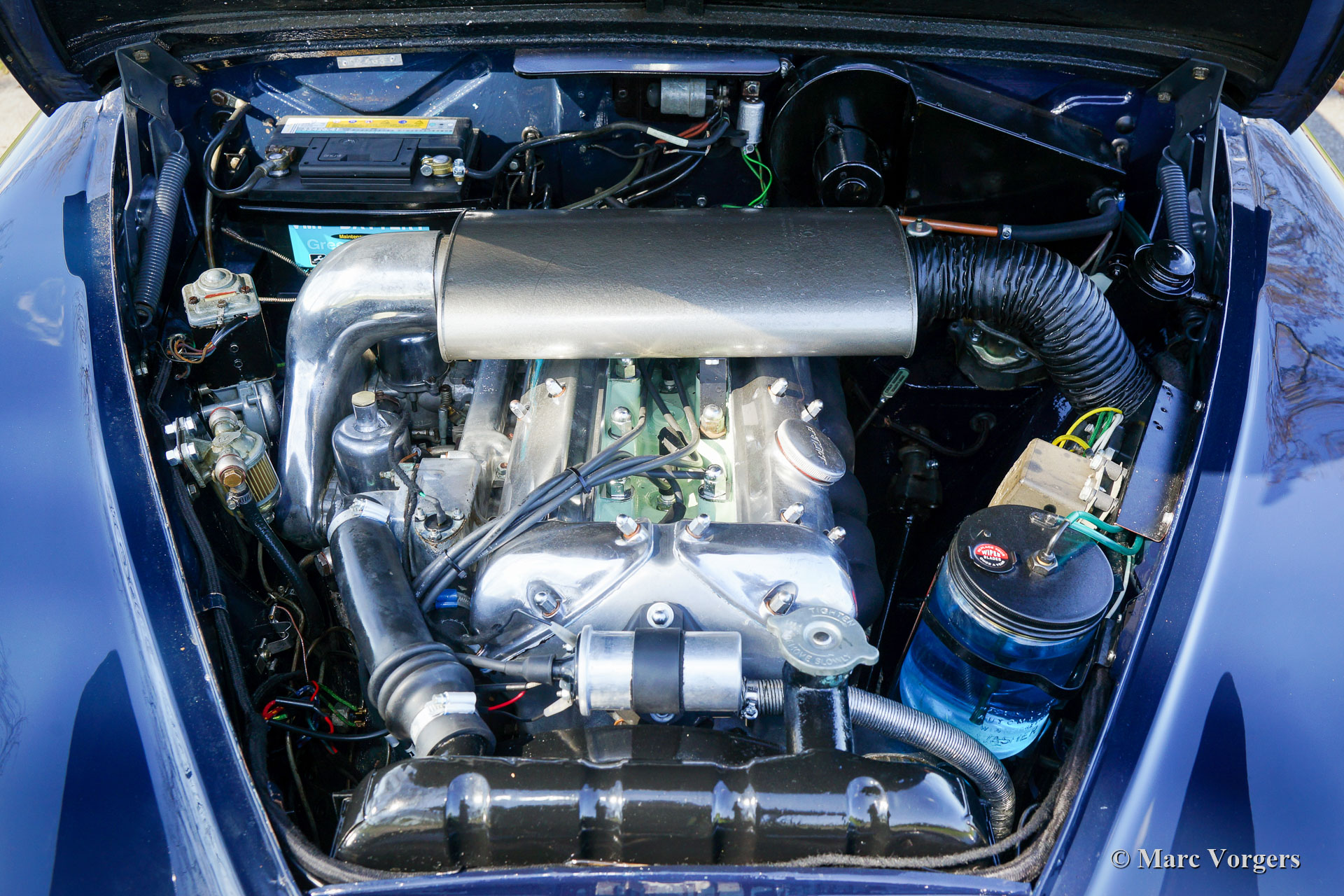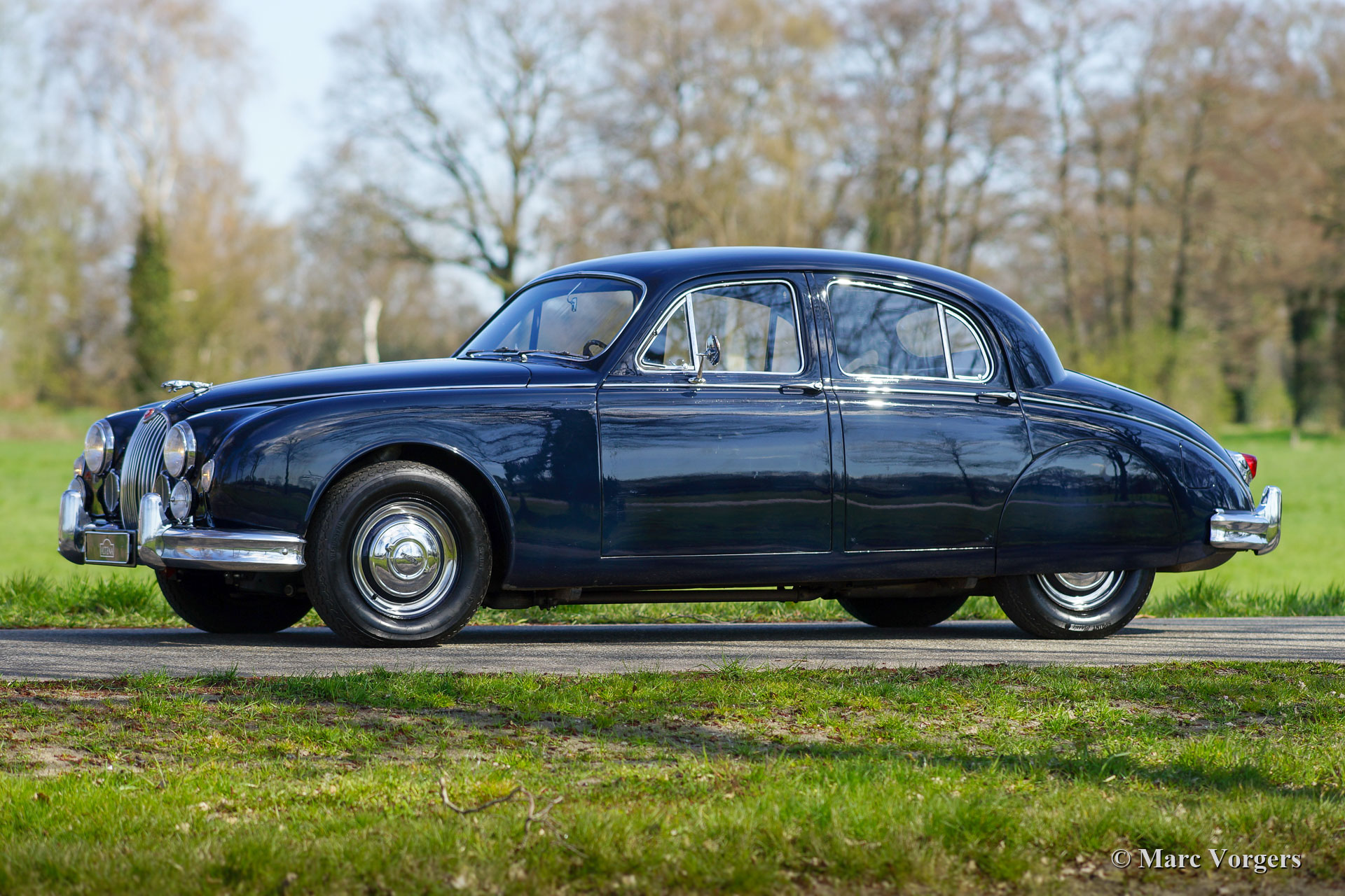 Jaguar Mk I, jaar 1958. Er is een Heritage-certificaat aanwezig, de originele 3,4 liter motor is ingeruild voor een krachtigere 3,8 liter motor. De auto is fabriek origineel voorzien van overdrive. Kleur donkerblauw gecombineerd met een donkerblauw lederen interieur, donkerblauw tapijt en grijze hemelbekleding. Dit is een zeldzame Jaguar Mk I met alle originele details! De Jaguar is nieuw verkocht in de VS. In 1996 is de auto vanuit Californië in Nederland geïmporteerd en in 2002 geregistreerd voor gebruik op de weg. In 2018 is de Jaguar verkocht aan de tweede Nederlandse eigenaar. In de periode 2018-2020 heeft de auto veel mechanische aandacht gekregen; veel onderdelen zijn vernieuwd en de auto is technisch helemaal up-to-date. Facturen van alle verbeteringen zijn aanwezig. Deze Jaguar Mk I verkeert in een zeer goede conditie met lichte sporen van eerder gebruik (vooral kleine lakbeschadigingen). Het hout, leer en andere interieurbekleding is prachtig en in uitstekende staat. De motorruimte is schoon en mooi gedetailleerd. De Jaguar is voorzien van een RVS uitlaat, Lucas SFT 576 mistlampen en Vredestein Sprint Classic banden. Deze Jaguar Mk I rijdt en stuurt voortreffelijk; dit is een fantastische rijdersauto! De 3,8 liter motor is krachtig, de handgeschakelde vierversnellingsbak schakelt nauwkeurig en de schijfremmen op alle vier de wielen vertragen de auto op indrukwekkende wijze. De sportieve prestaties, gecombineerd met de geweldige looks en het comfortabele interieur doen recht aan het klassieke Jaguar-motto: Grace, Pace and Space.