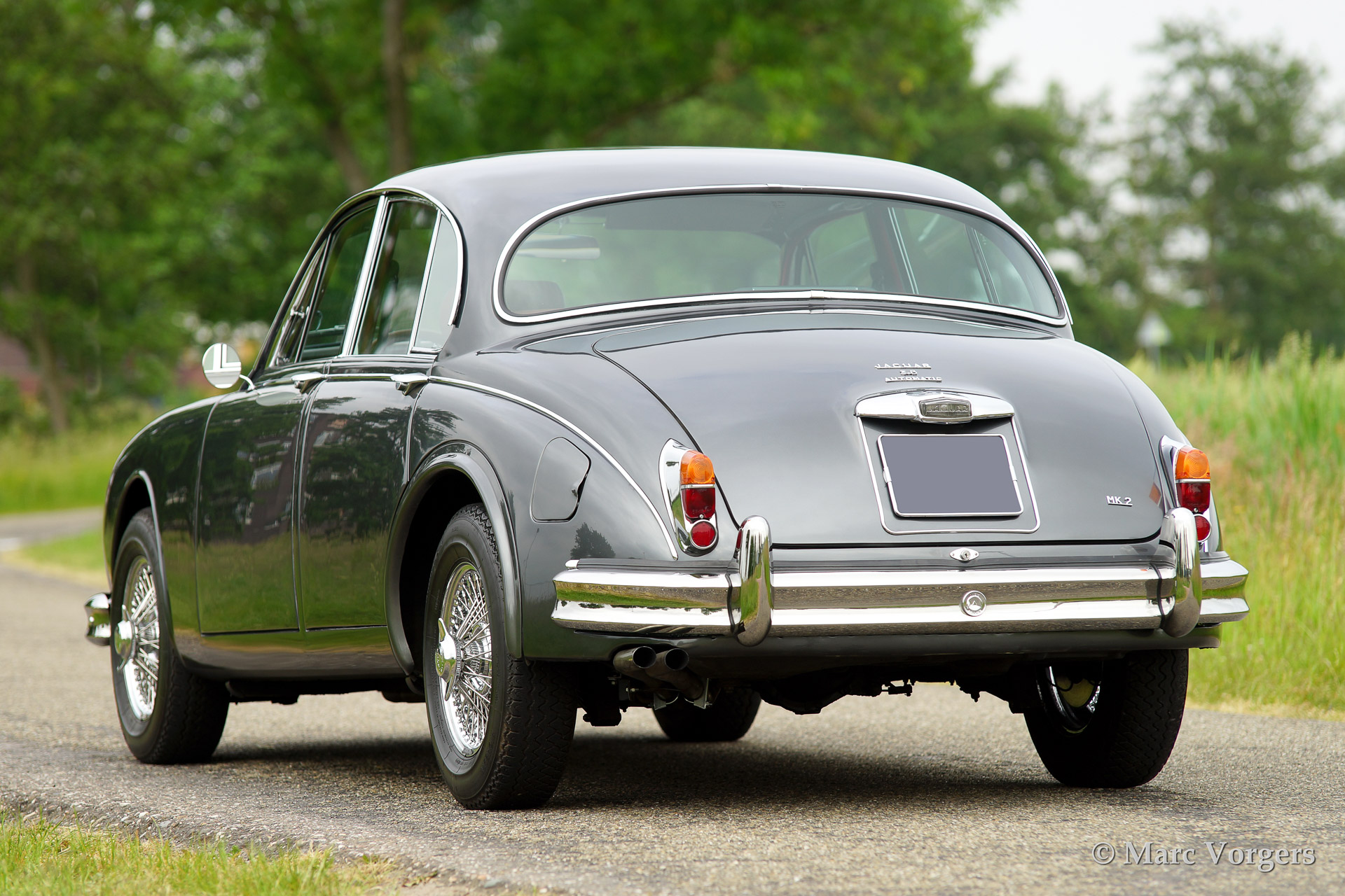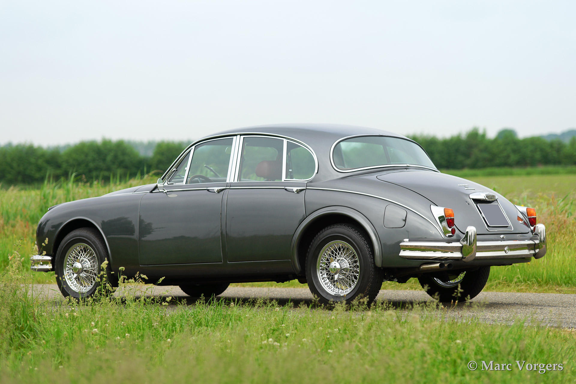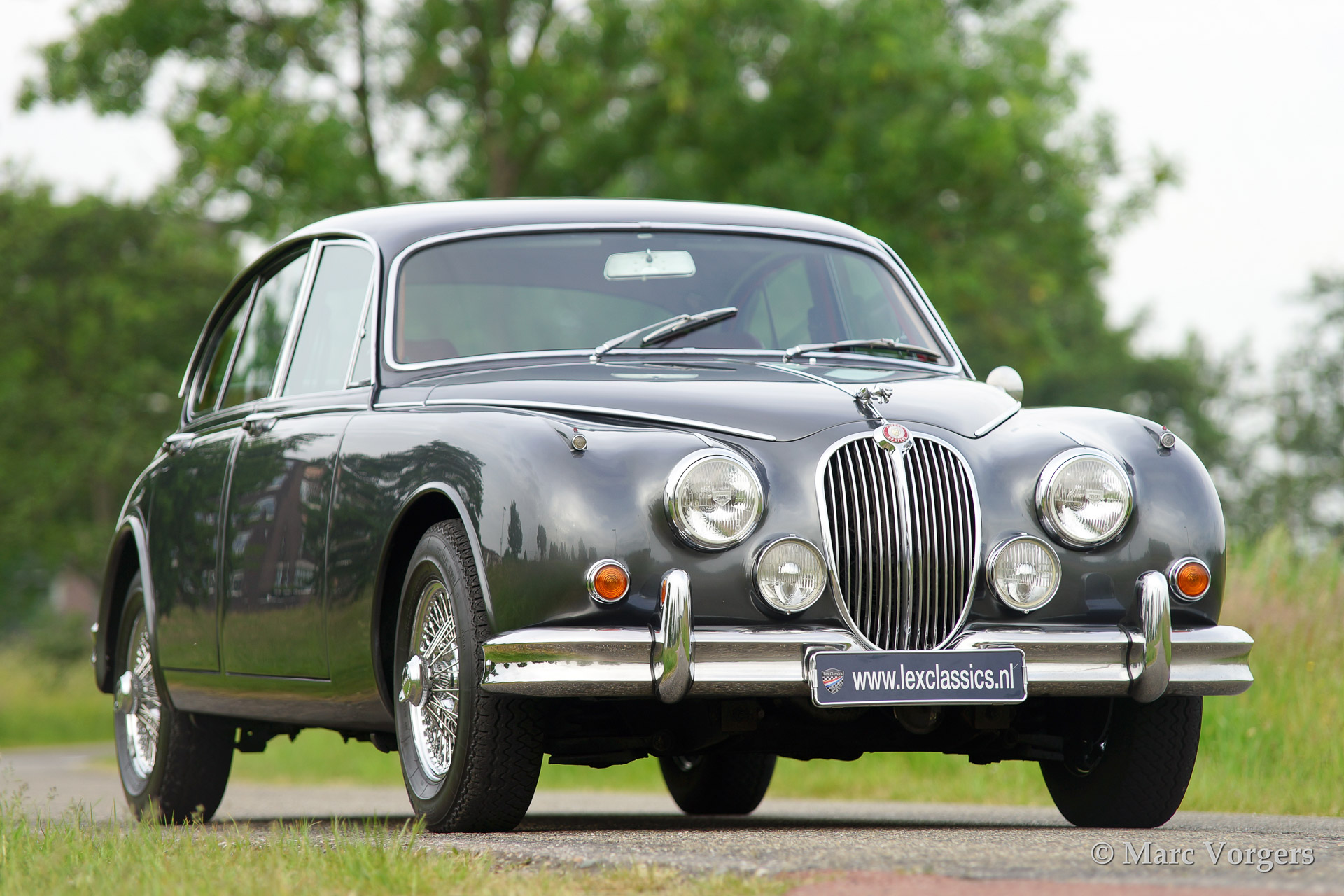 Jaguar Mk II 3.8 Litre, bouwjaar 1961. Kleur'Gun Metal' grey metallic met een rood lederen interieur. Deze prachtige Jaguar Mk II werd uitvoerig en professioneel gerestaureerd waarbij enige technische modificaties werden doorgevoerd (hoge capaciteit radiator, geventileerde schijfremmen etc.) De auto is voorzien van chroom spaakwielen met Michelin XVS banden, een automatische versnellingsbak en een vierspaaks stuur met houten rand.