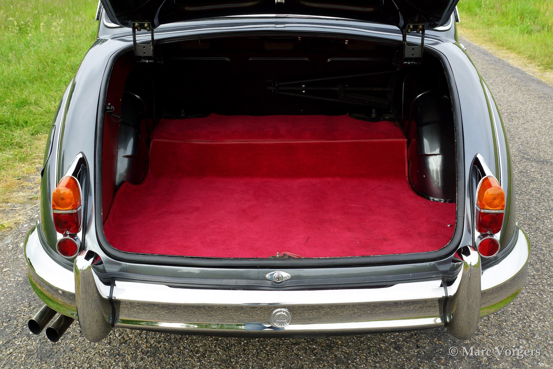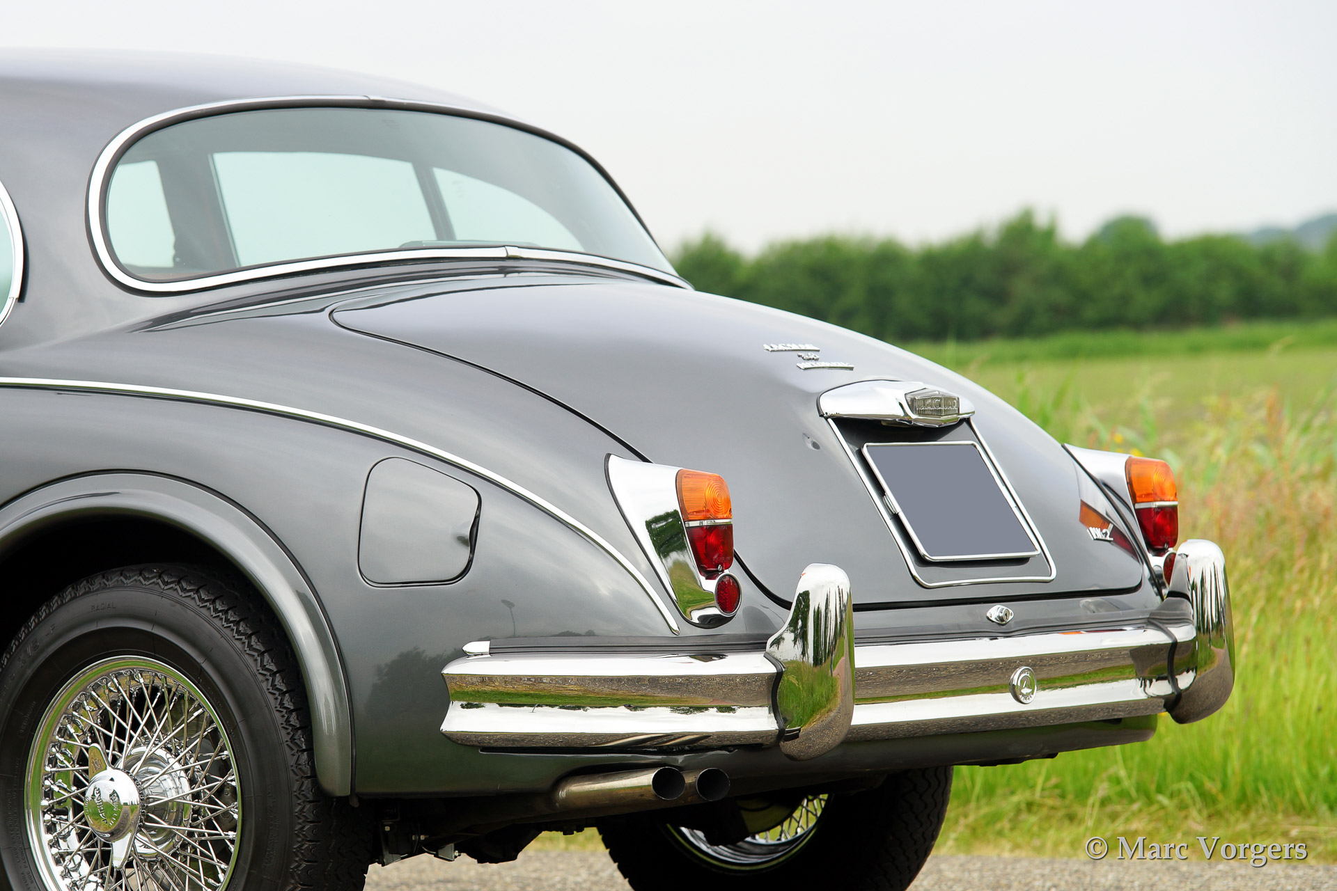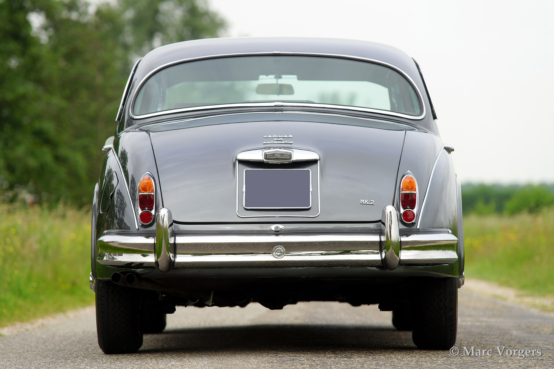 Jaguar Mk II 3.8 Litre, bouwjaar 1961. Kleur'Gun Metal' grey metallic met een rood lederen interieur. Deze prachtige Jaguar Mk II werd uitvoerig en professioneel gerestaureerd waarbij enige technische modificaties werden doorgevoerd (hoge capaciteit radiator, geventileerde schijfremmen etc.) De auto is voorzien van chroom spaakwielen met Michelin XVS banden, een automatische versnellingsbak en een vierspaaks stuur met houten rand.