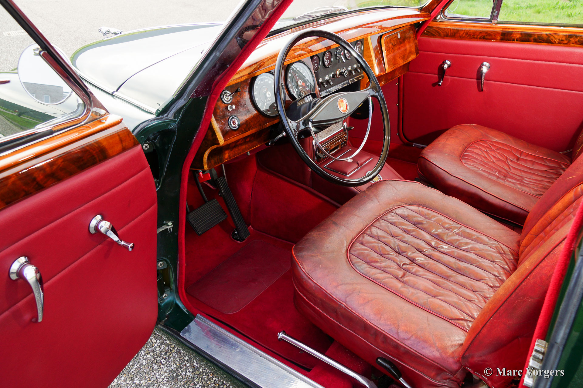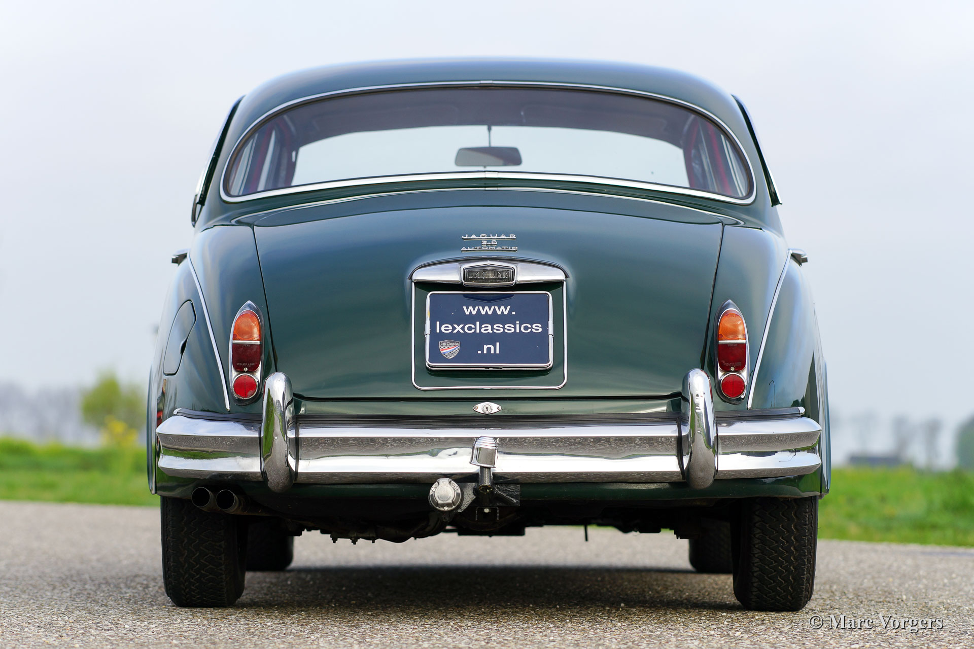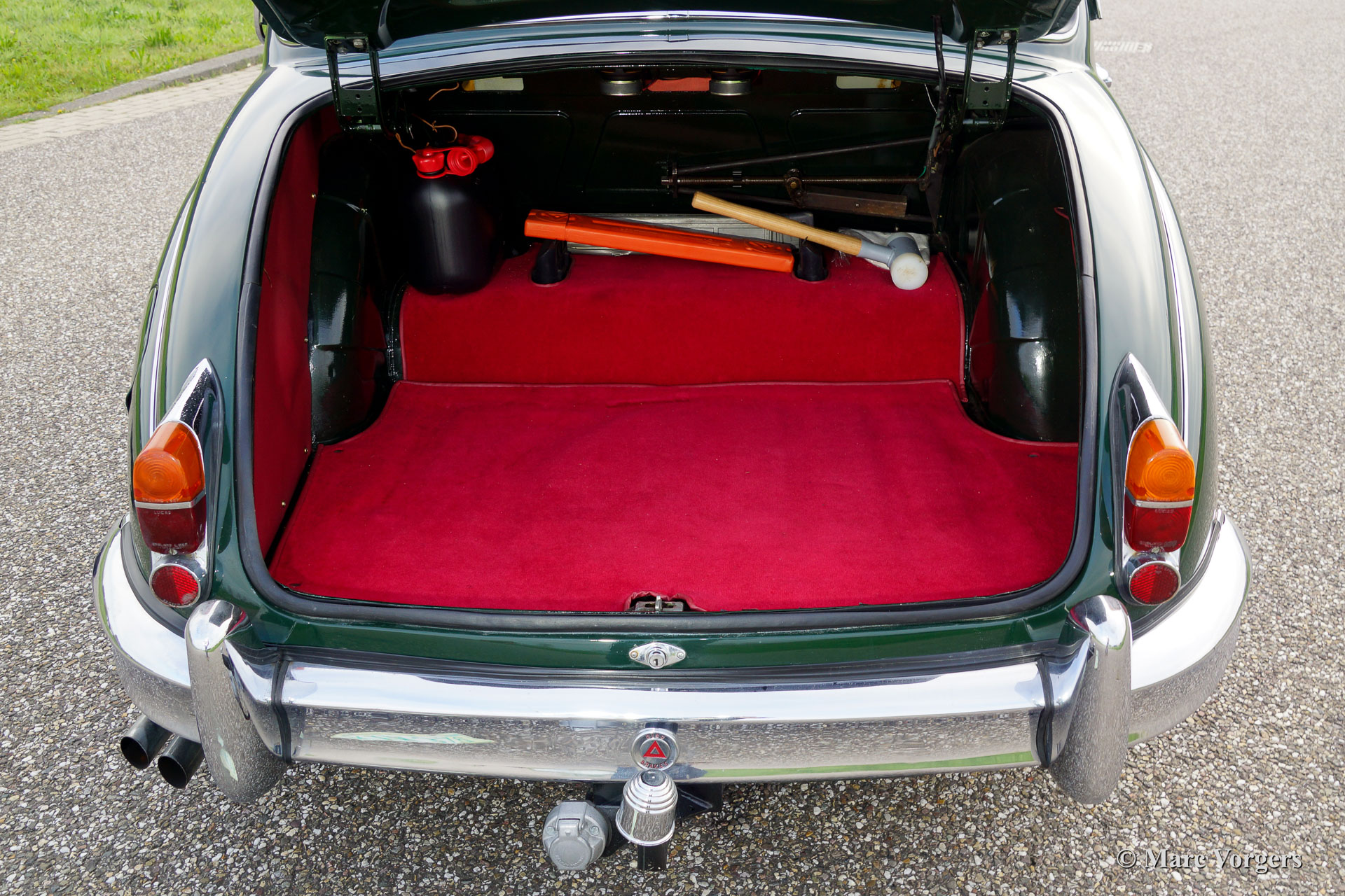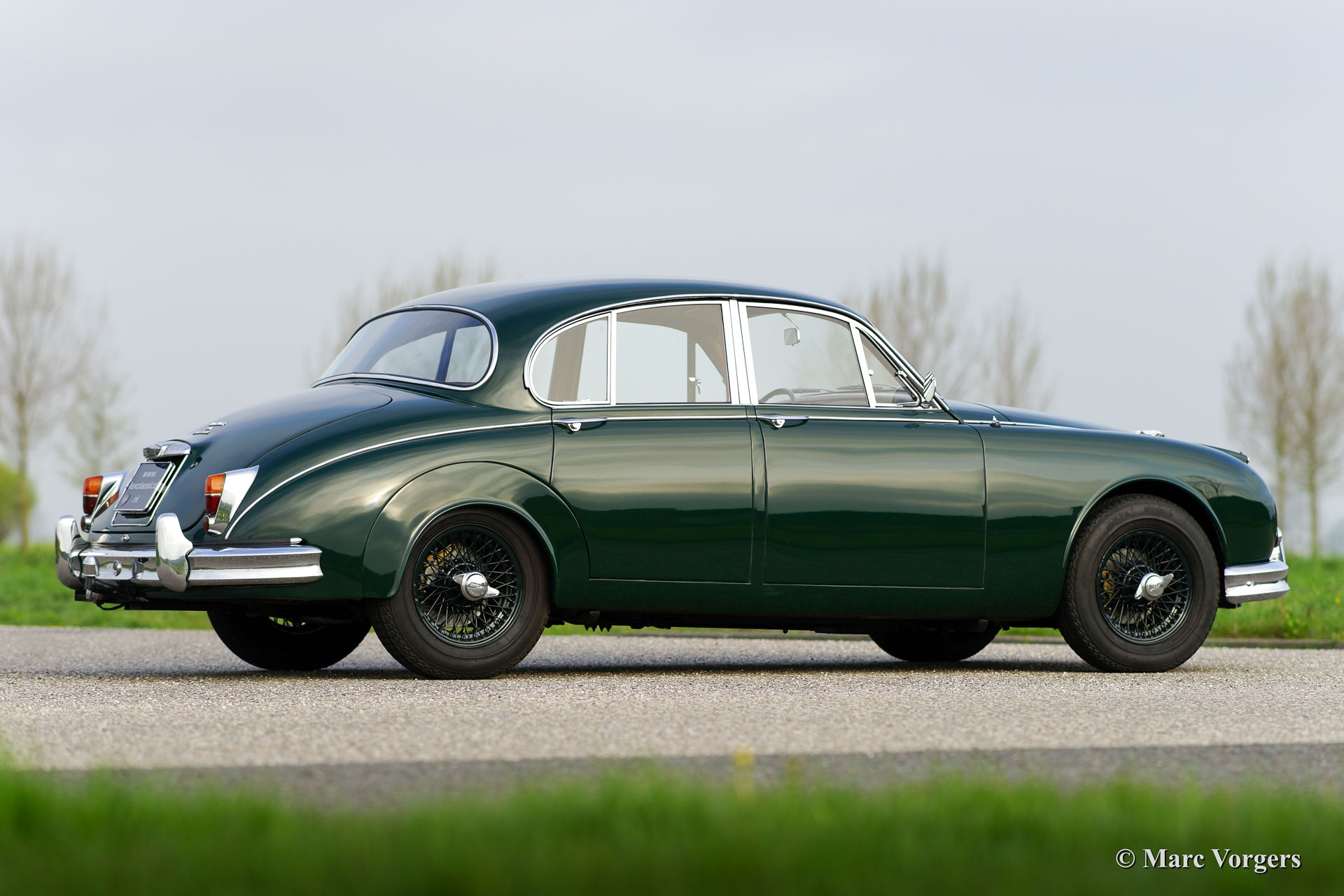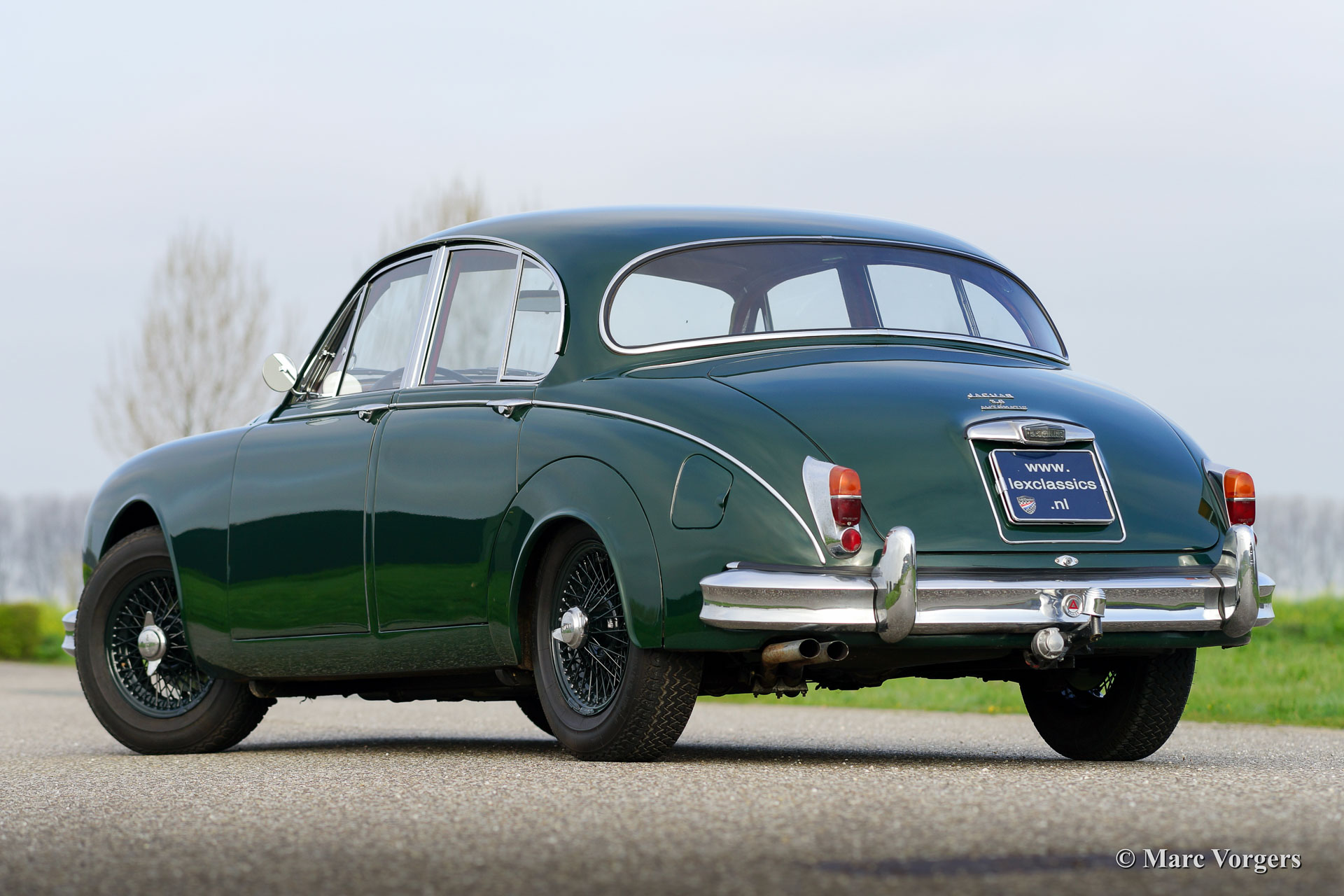 Jaguar Mk II 3.8 Litre, bouwjaar 1961. Chassisnummer: P217284BW. Kleur British Racing Green met een rood lederen interieur en rood tapijt. Deze stijlvolle Jaguar Mk II 3.8 Litre werd in 1992 geïmporteerd vanuit Amerika. Aansluitend werd de auto uitvoerig ‘body off’ gerestaureerd waarbij het originele interieur teruggeplaatst werd. De restauratie werd afgerond in 1998. Een uitgebreide reportage van de restauratie is aanwezig. De auto is uitgerust met een automatische versnellingsbak, groen gelakte spaakwielen, chroom ‘knock off’ wielmoeren, 2 buitenspiegels, een elektrische Kenlow koelventilator, aluminium kleppendeksel, Philips radio/cd-speler, RVS uitlaat, 123 elektronische ontsteking, Koni schokdempers, modern stuurhuis, stuurbekrachtiging (XJ6) en een trekhaak. Deze fraaie Jaguar verkeert in zeer goede staat en de auto rijdt voortreffelijk.