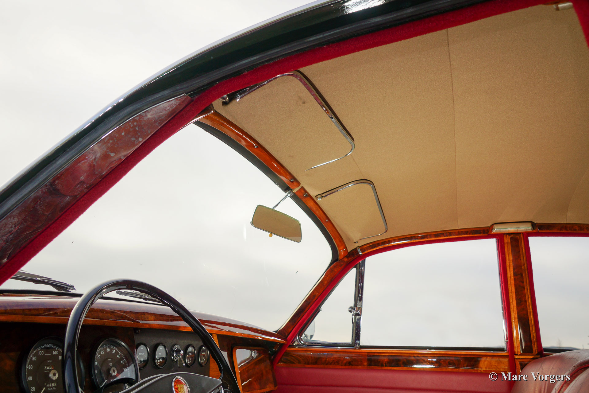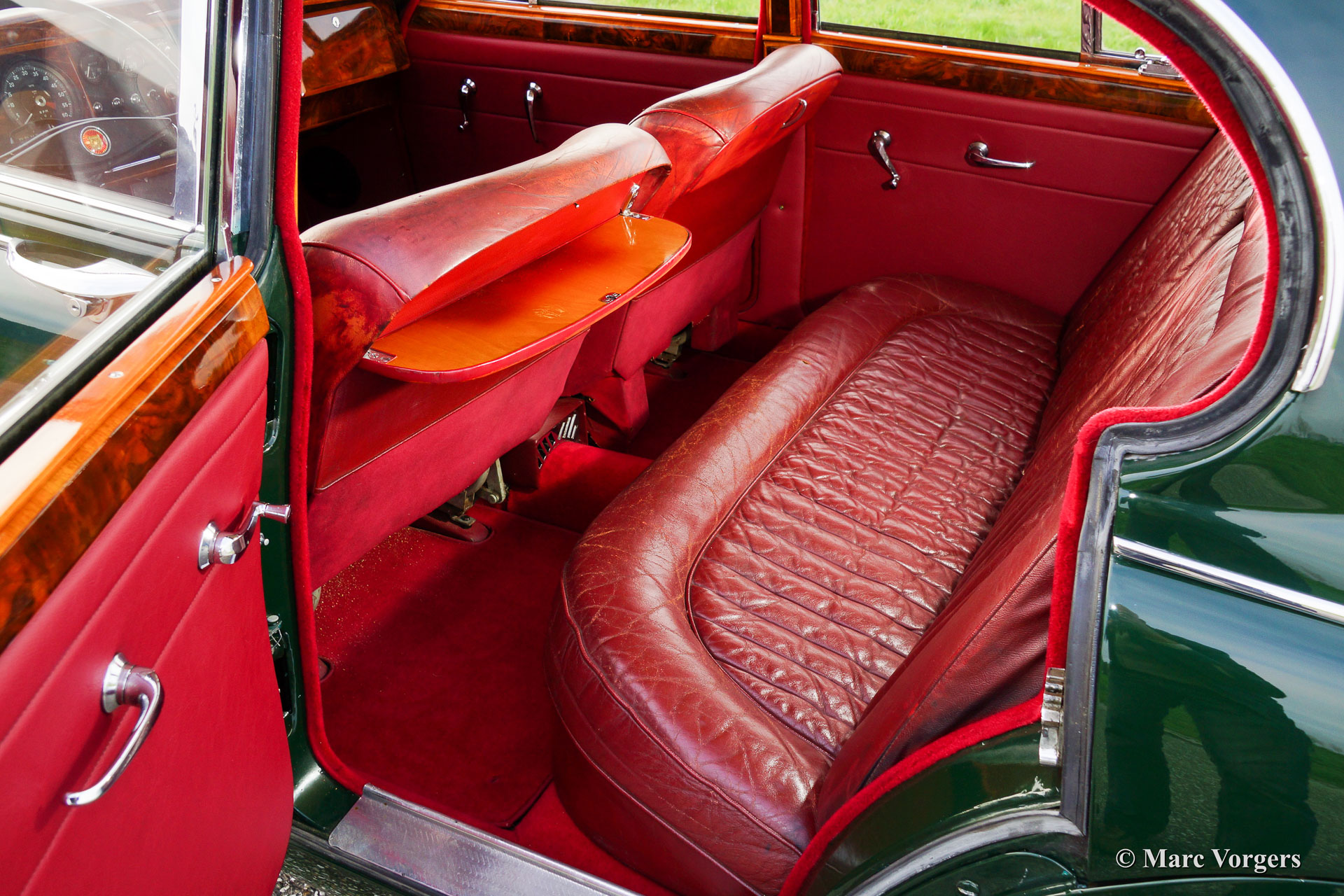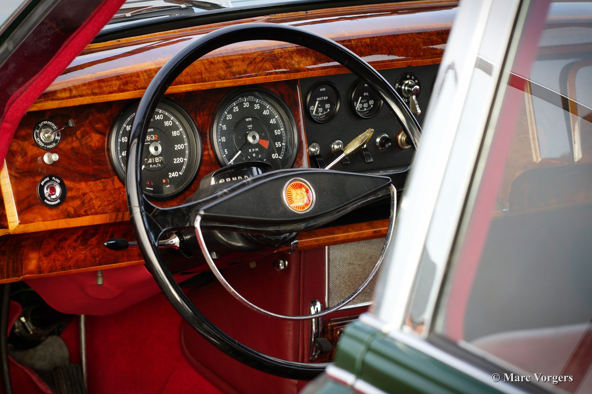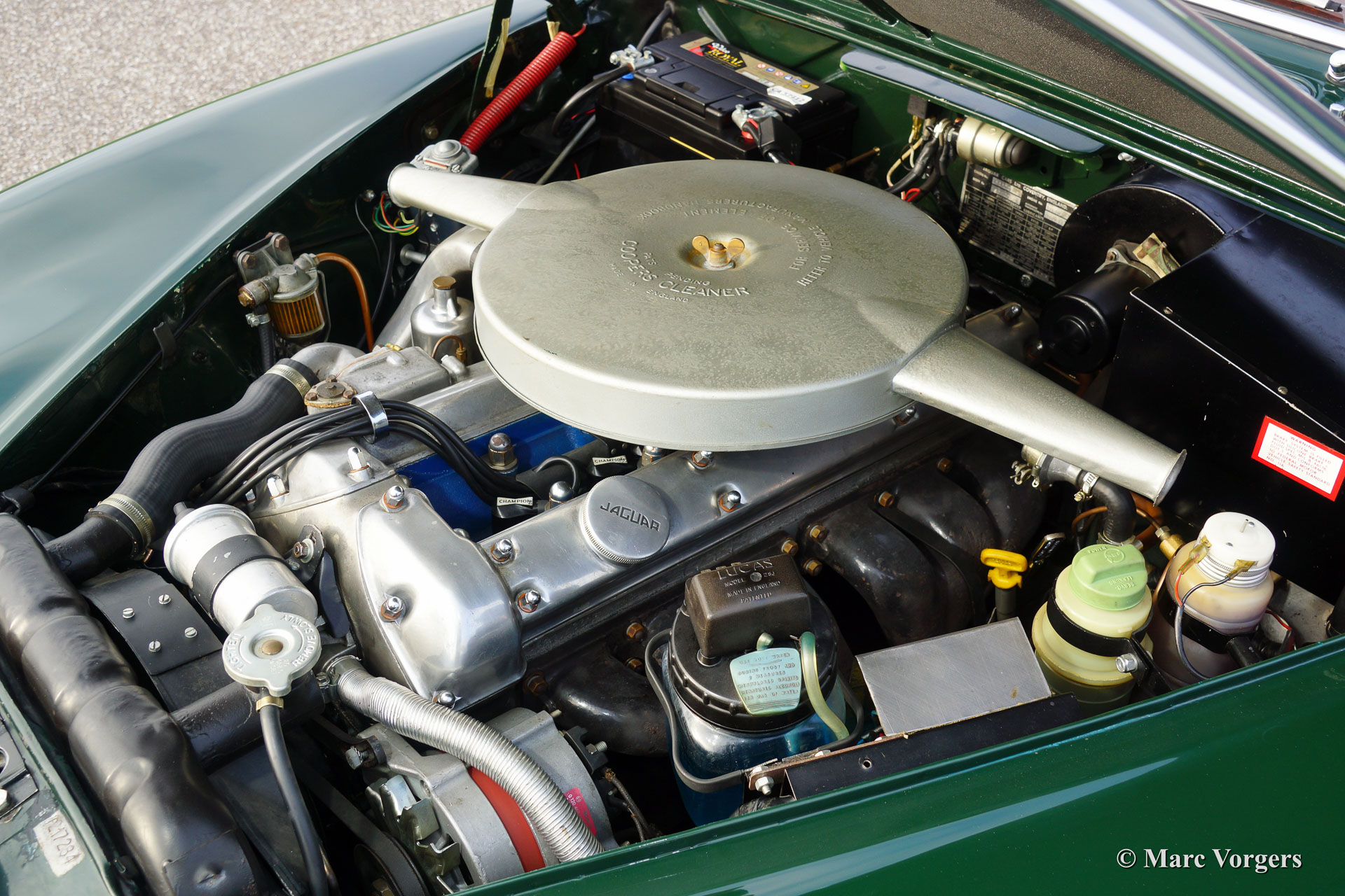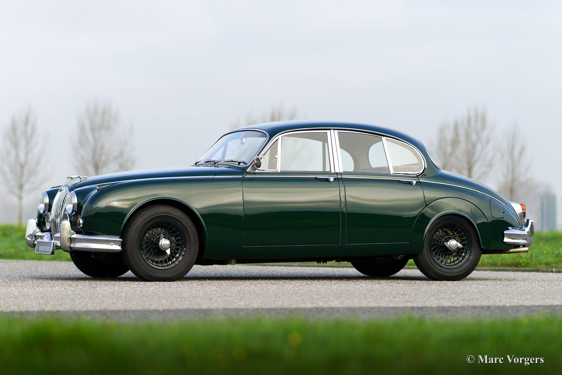 Jaguar Mk II 3.8 Litre, bouwjaar 1961. Chassisnummer: P217284BW. Kleur British Racing Green met een rood lederen interieur en rood tapijt. Deze stijlvolle Jaguar Mk II 3.8 Litre werd in 1992 geïmporteerd vanuit Amerika. Aansluitend werd de auto uitvoerig ‘body off’ gerestaureerd waarbij het originele interieur teruggeplaatst werd. De restauratie werd afgerond in 1998. Een uitgebreide reportage van de restauratie is aanwezig. De auto is uitgerust met een automatische versnellingsbak, groen gelakte spaakwielen, chroom ‘knock off’ wielmoeren, 2 buitenspiegels, een elektrische Kenlow koelventilator, aluminium kleppendeksel, Philips radio/cd-speler, RVS uitlaat, 123 elektronische ontsteking, Koni schokdempers, modern stuurhuis, stuurbekrachtiging (XJ6) en een trekhaak. Deze fraaie Jaguar verkeert in zeer goede staat en de auto rijdt voortreffelijk.