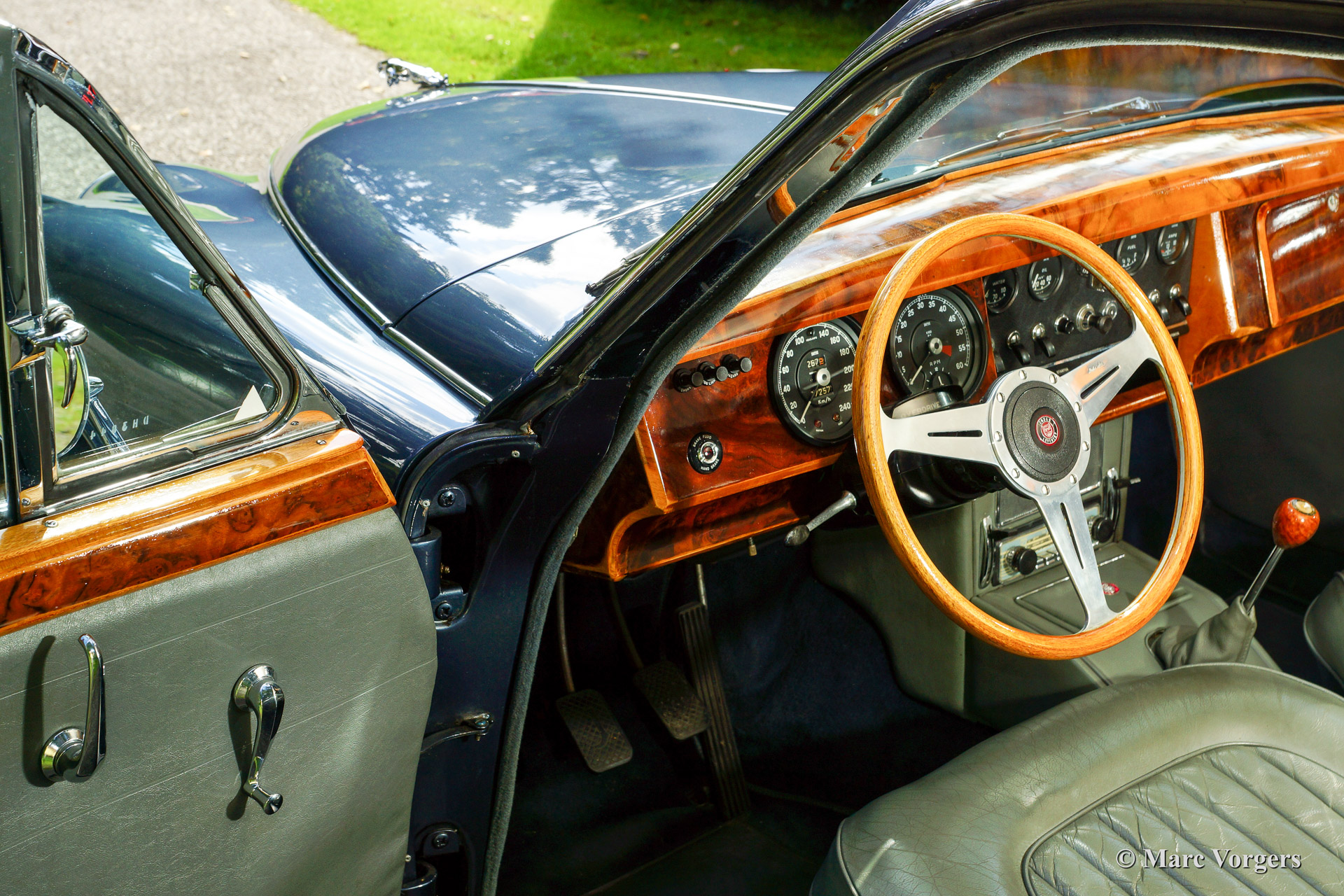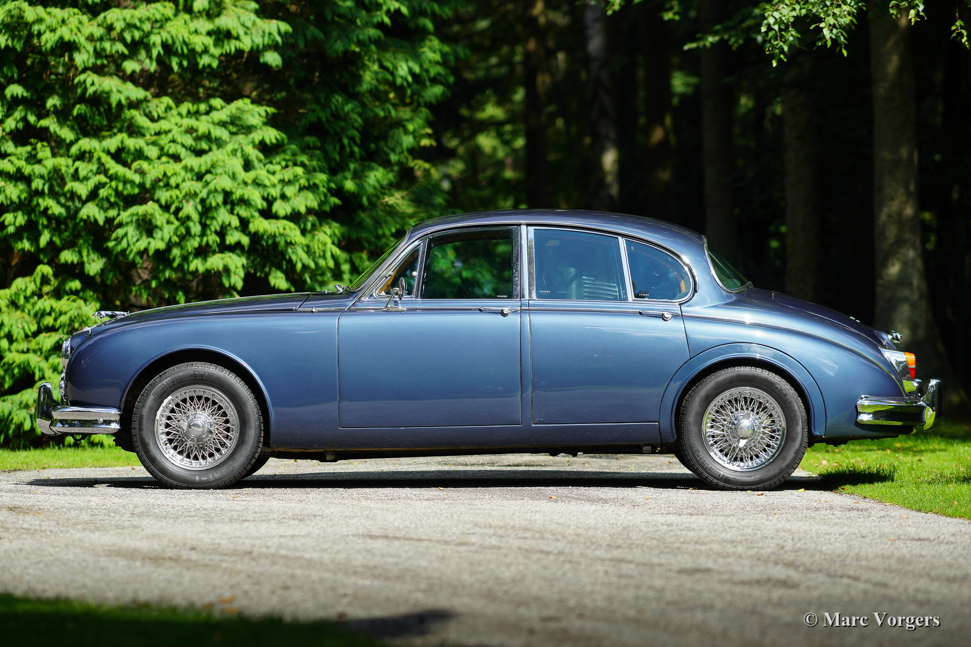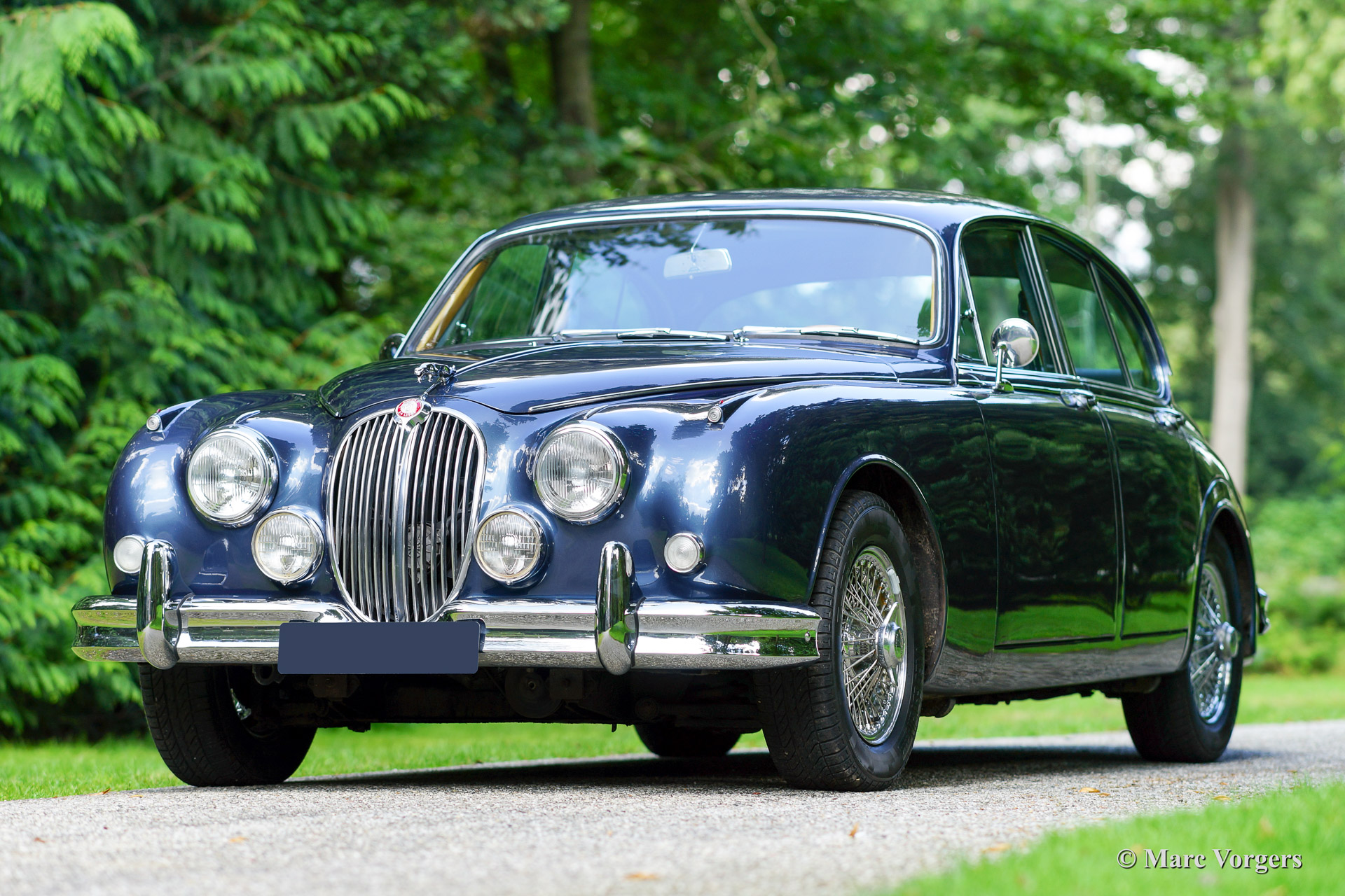 Jaguar Mk II 3.8 Litre, year 1965 first registration 1966. Colour dark blue metallic with a grey leather interior and dark blue carpet. This beautiful Jaguar Mk II was sold new in Beverly Hills, California, USA. The automobile was imported to the Netherlands in 1993. In the late 1990'ies the car was extensively restored and overhauled. Invoices and photo's of this restoration are present. The car shows some minimal 'bubbling' in the lower halves of two doors otherwise we would rate this car excellent. This Jaguar was serviced meticulously every year which is proven by garage bills. This Jaguar MK II sports chrome wire spoke wheels, a steering wheel with wooden rim, period radio, overdrive and power steering. A Heritage certificate is also present. This is the top-of-the line Jaguar Mk II featuring the powerful 3.8 Litre engine mated with manual gearbox and overdrive!