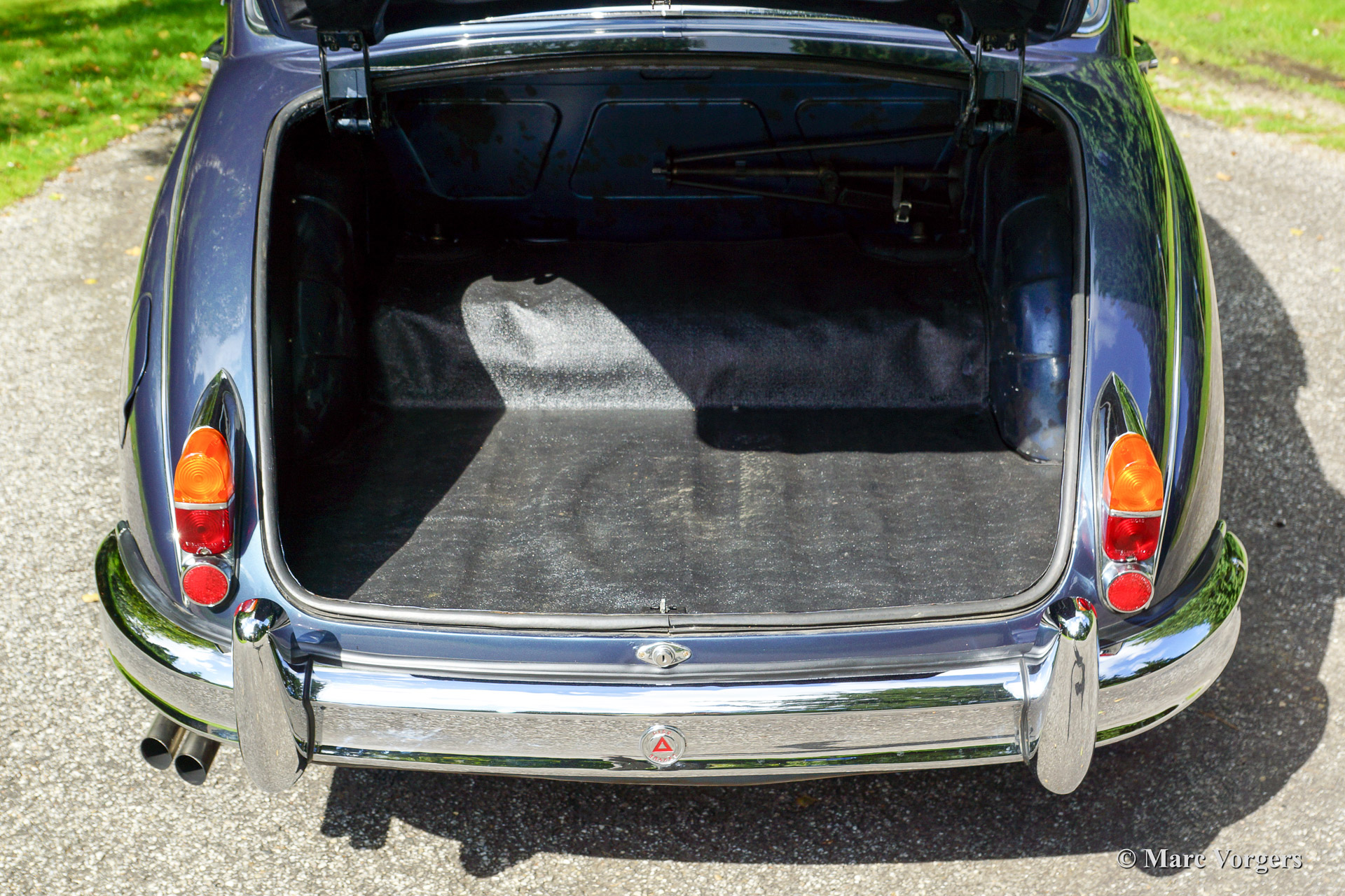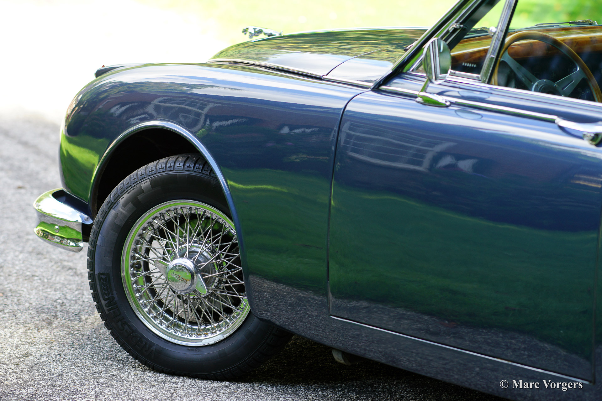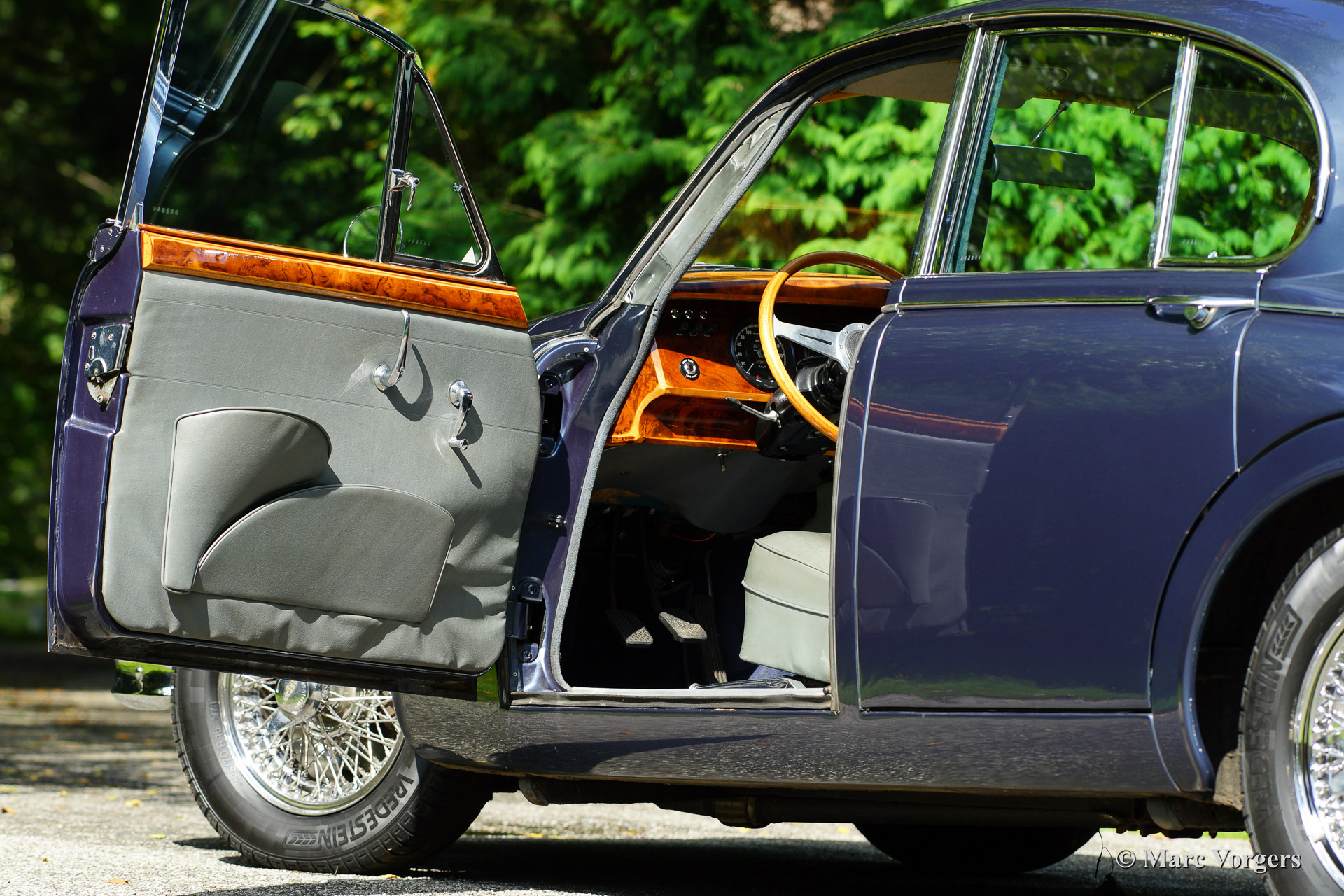 Jaguar Mk II 3.8 Litre, year 1965 first registration 1966. Colour dark blue metallic with a grey leather interior and dark blue carpet. This beautiful Jaguar Mk II was sold new in Beverly Hills, California, USA. The automobile was imported to the Netherlands in 1993. In the late 1990'ies the car was extensively restored and overhauled. Invoices and photo's of this restoration are present. The car shows some minimal 'bubbling' in the lower halves of two doors otherwise we would rate this car excellent. This Jaguar was serviced meticulously every year which is proven by garage bills. This Jaguar MK II sports chrome wire spoke wheels, a steering wheel with wooden rim, period radio, overdrive and power steering. A Heritage certificate is also present. This is the top-of-the line Jaguar Mk II featuring the powerful 3.8 Litre engine mated with manual gearbox and overdrive!