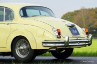 Jaguar Mk II 3.8 liter, jaar 1966. Kleur 'Primrose yellow' met een zwart lederen interieur. Deze prachtige Jaguar Mk II verkeert in excellente tot sublieme staat en de auto rijdt perfect. Verschillende deelrestauraties hebben de auto op hoog niveau gebracht. De motor en de automatische versnellingsbak werden gereviseerd. De carrosserie werd gerestaureerd en prachtig nieuw gespoten. Het interieur is nieuw bekleed met zwart leer en de houten interieurdelen zijn perfect gelakt. Deze Jaguar Mk II is voorzien van de krachtige 3.8 liter XK motor, een soepel schakelende automatische versnellingsbak, chroom spaakwielen 'knock off' wielmoeren, stuurbekrachtiging en een klassieke radio. Verder is de auto voorzien van 'spats' over de achterwielen, de 'leaping cat' op de motorkap en extra lampen aan de voorzijde.