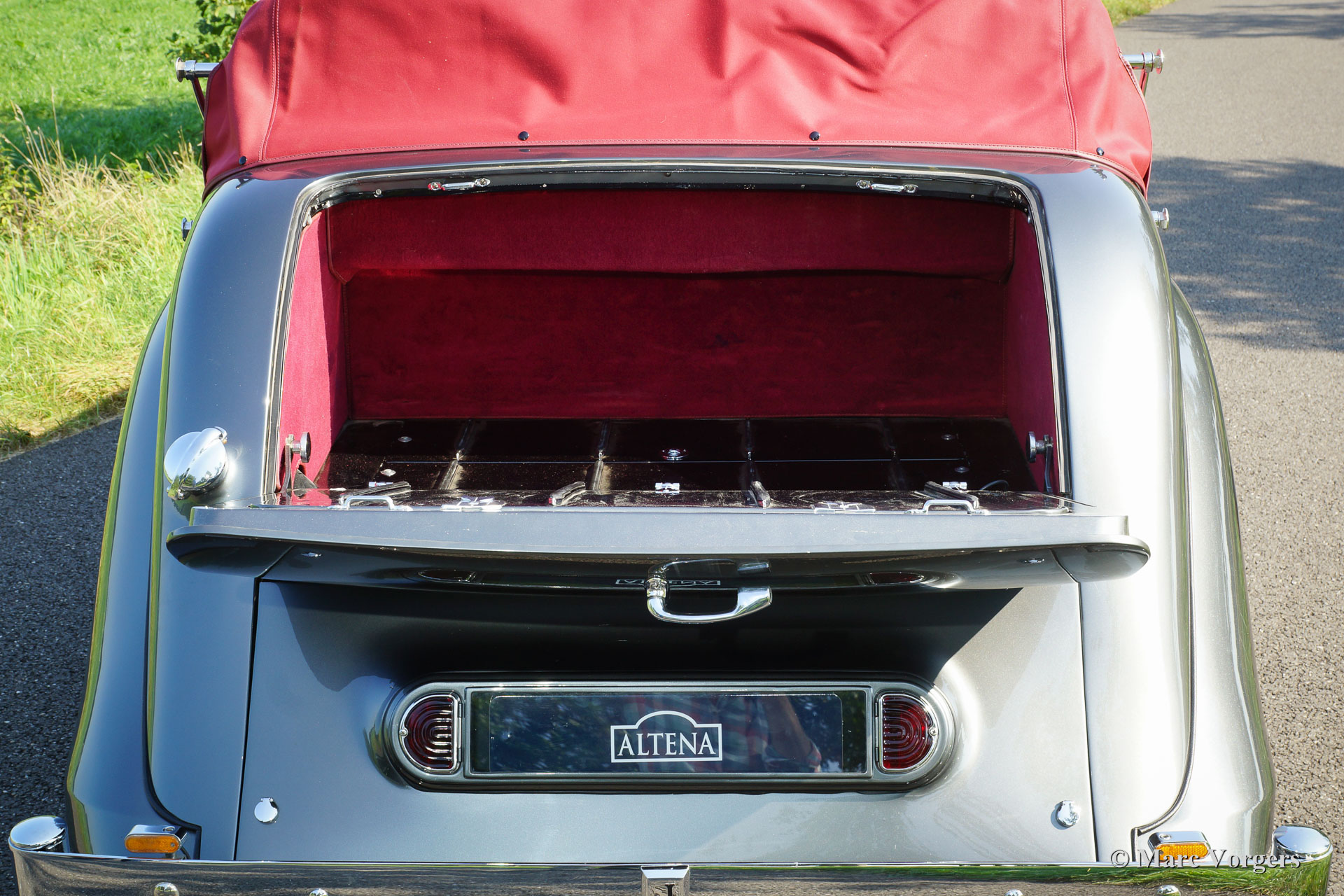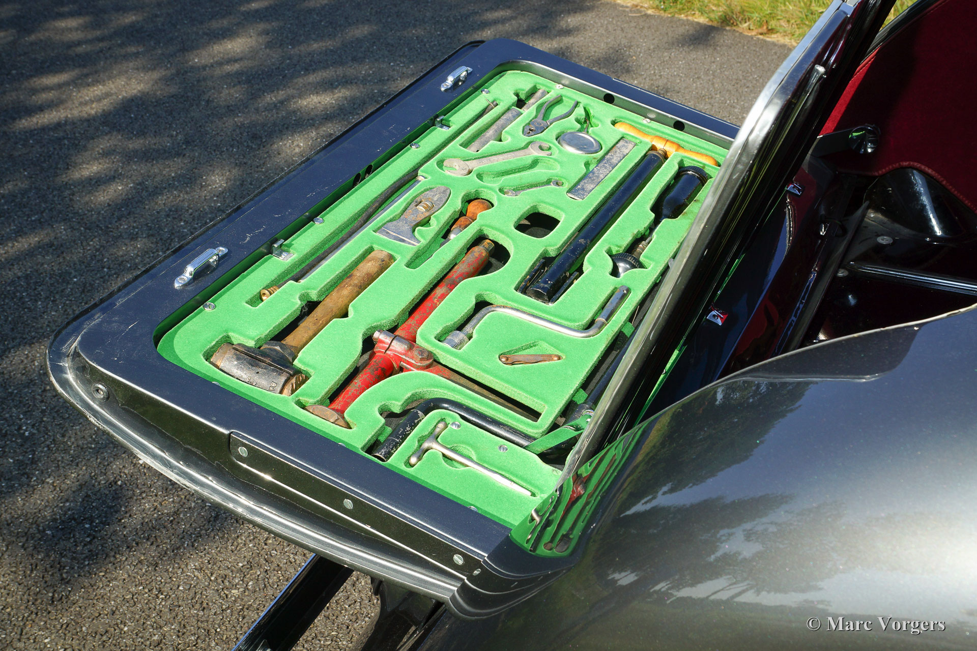 Jaguar Mk IV DHC, jaar 1948. Chassisnummer 6371XX, carrosserienummer C116X, motornummer SL311X. Kleur ‘gun-metal’ grey metallic met een rood leren interieur en rood tapijt. Rode kap en ‘hood-cover’. Deze beeldschone Jaguar Mk IV Drop Head Coupe is in het verleden uitvoerig en zeer fraai gerestaureerd; de automobiel verkeert in sublieme topstaat! Deze Jaguar Mk IV heeft sinds de restauratie slechts 8352 mijl gereden. De auto is uitgerust met prachtige chroom spaakwielen die het plaatje helemaal ‘af’ maken! De originele gereedschap set is aanwezig en op de voorbumper treft u extra mistlampen aan. De cabrioletkap is een zogenaamde ‘three position hood’ die in drie standen kan worden gebruikt; gesloten, halfopen of helemaal open! Dit is een zeer bijzondere Jaguar Mk IV DHC in topconditie!