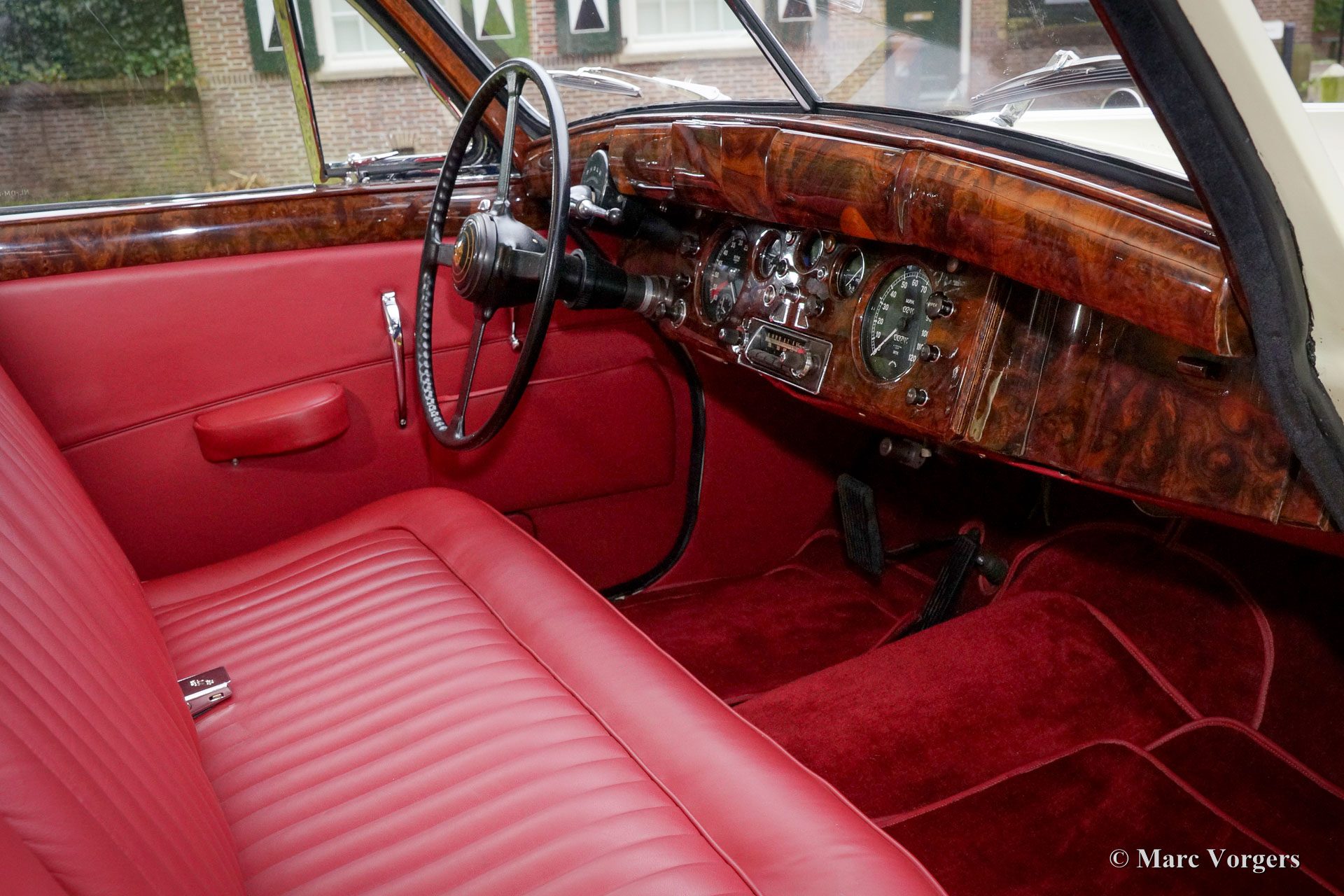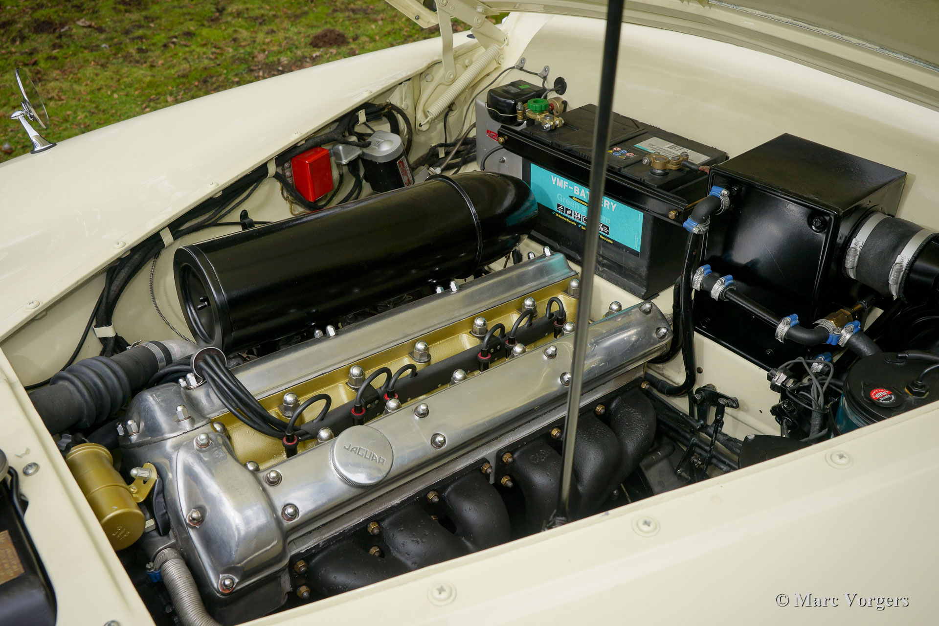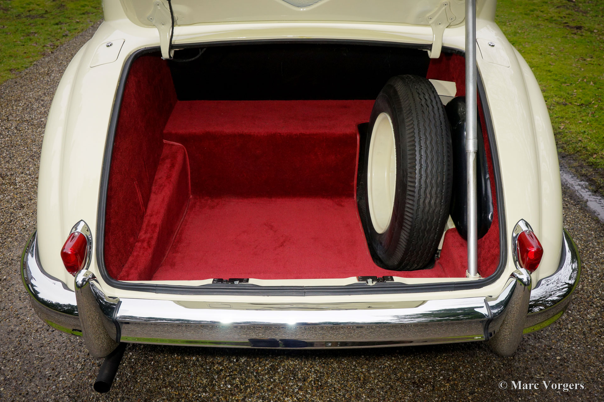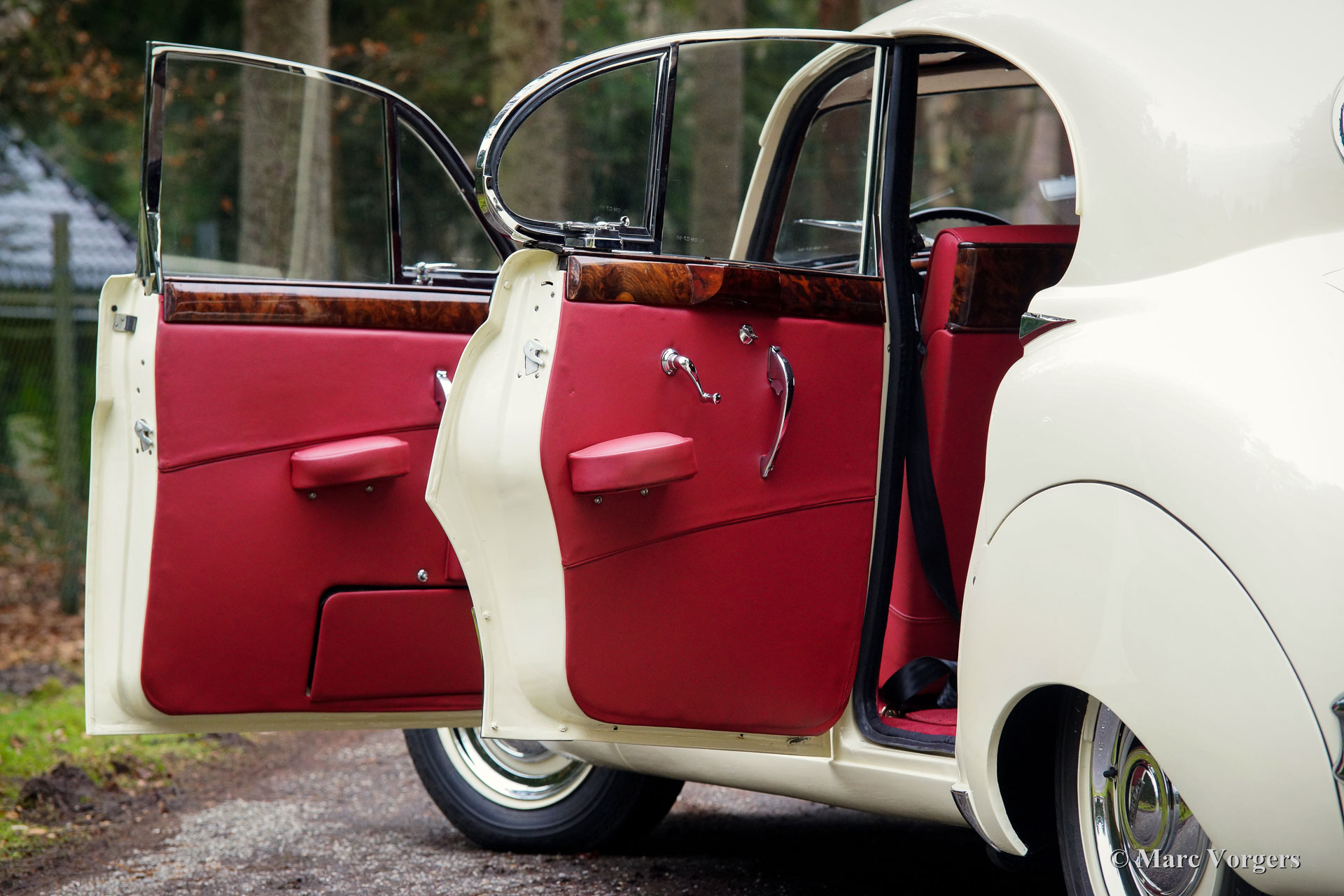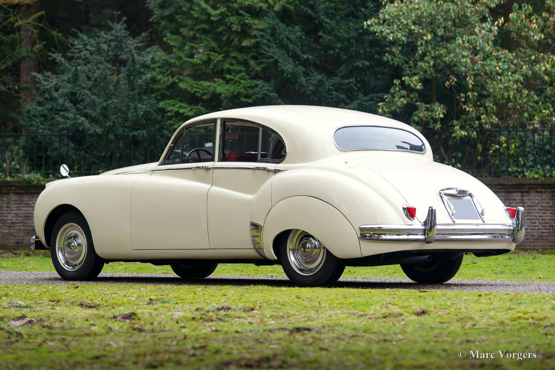 Jaguar Mk VIIM, jaar 1956. Kleur zachtgeel met een rood leren interieur en rood tapijt. Deze indrukwekkende Jaguar Mk VIIM saloon werd nieuw verkocht in Nieuw Zeeland. In 1996 werd de auto in Nederland geïmporteerd. De huidige eigenaar kocht de automobiel in 2011 waarna de Jaguar uitvoerig en perfect werd gerestaureerd naar concoursstaat. Deze Jaguar is geen gewone Mk 7 maar een speciale Mk 7M. De ‘M’ uitvoering is uitgerust met de 190 pk. XK-motor (in plaats van de standaard 160 pk versie). Verder kan de ‘M’ worden herkend aan de mistlampen op de voorbumper, richtingaanwijzers op de voorspatborden, een ‘J’ logo op de koplampglazen, iets andere bumpers en iets grotere achterlichten. Het meest bijzondere aan de Mk VIIM is dat het een echte wolf in schaapskleren is. Het mooiste bewijs hiervoor is de overwinning van de zware Monte Carlo rally in 1965! De grote en luxe automobiel bewees uiterst comfortabel op zeer hoge snelheid te rijden. Zogenaamde ‘sportwagens’ hadden geen kans omdat de inzittenden veel eerder uitgeput raakten!