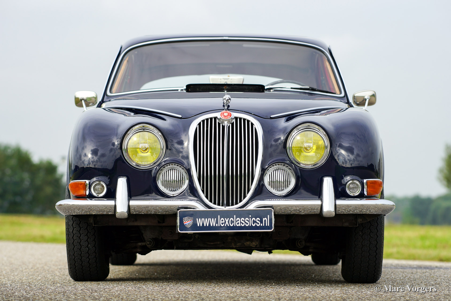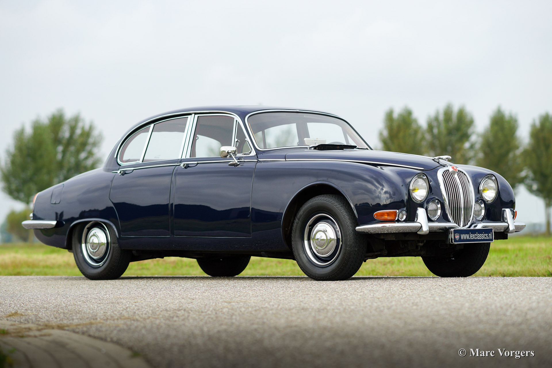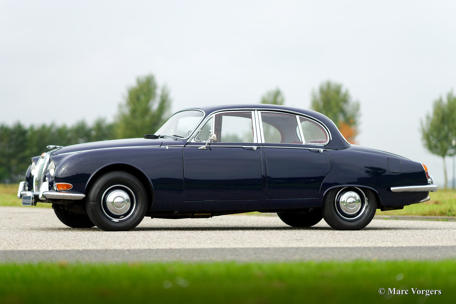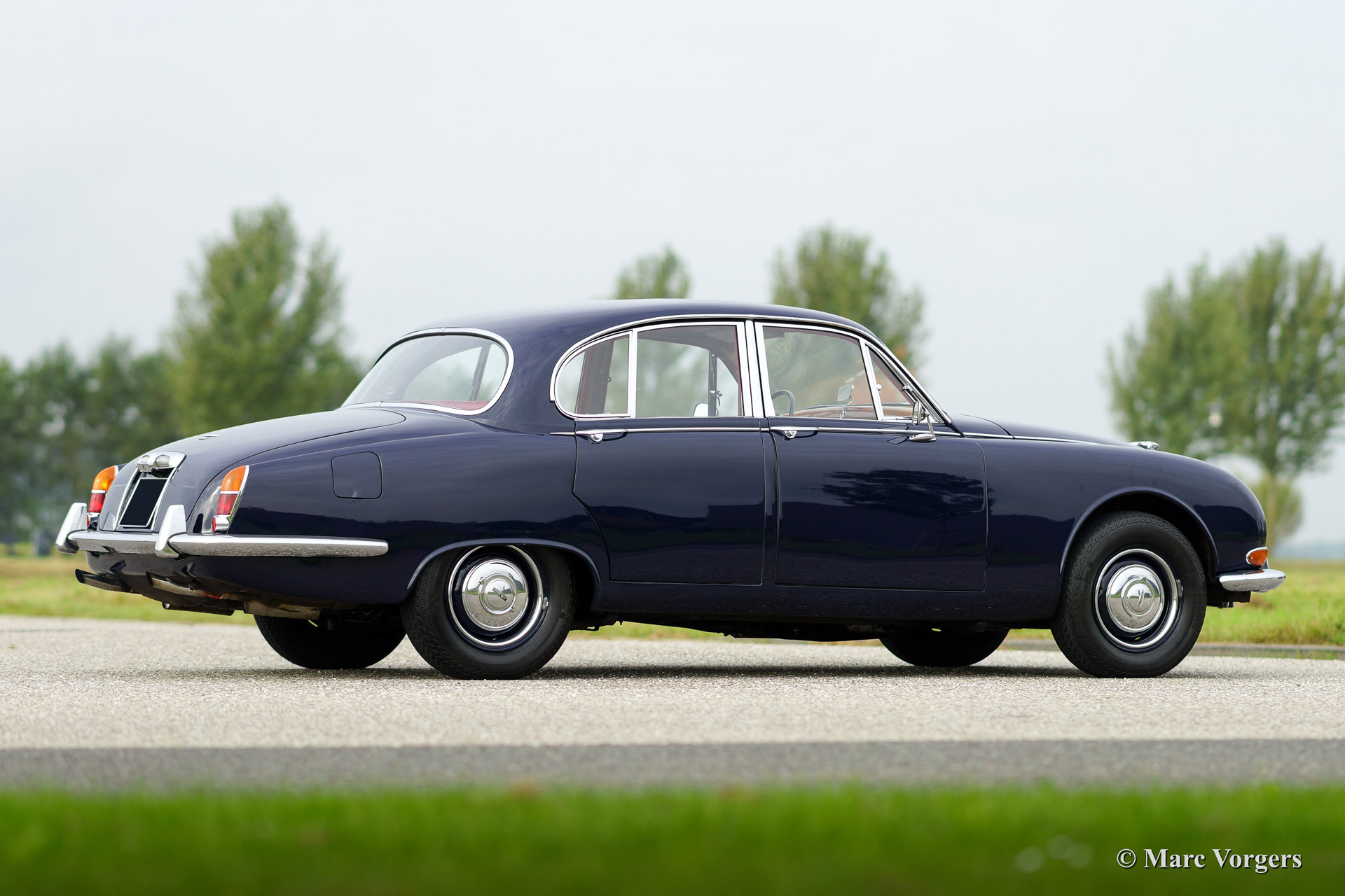 Jaguar S-type 3.4 Litre saloon, year 1965. Chassis number P1B25539BW. Colour dark blue with a red leather interior. The delightful Jaguar S-type is the bigger brother of the Jaguar Mk II. This automobile was extensively restored a few years ago and the car is in superb (excellent+) condition. The automobile was sold new in the Netherlands where it started it's service as the board limousine of the 'Van Gend & Loos' company. The Jaguar features a very plush and luxurious interior, automatic gearbox, radio, two additional driving lamps at front and a factory original sliding roof! Further more the car comes well documented with service invoices and a Heritage certificate.