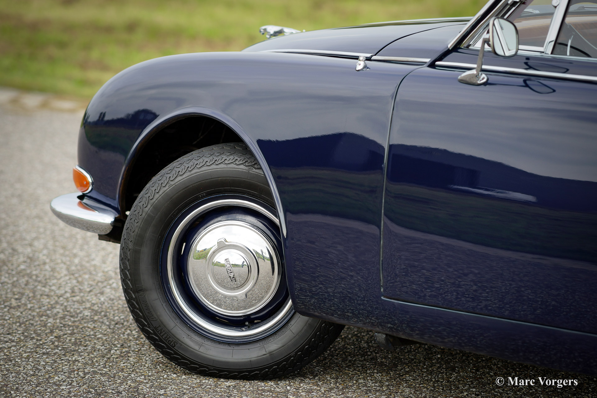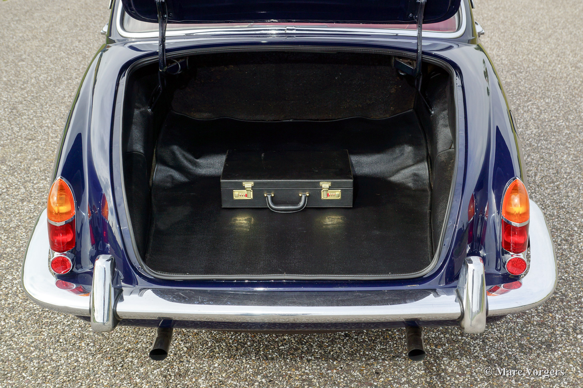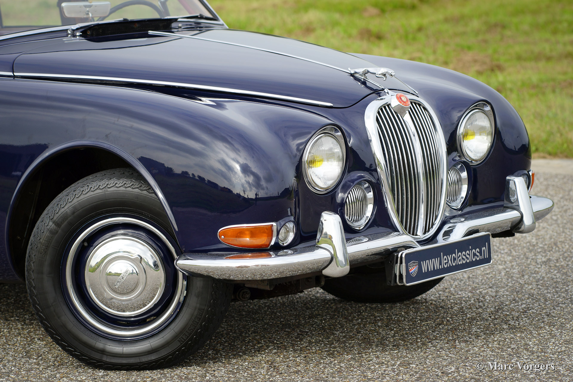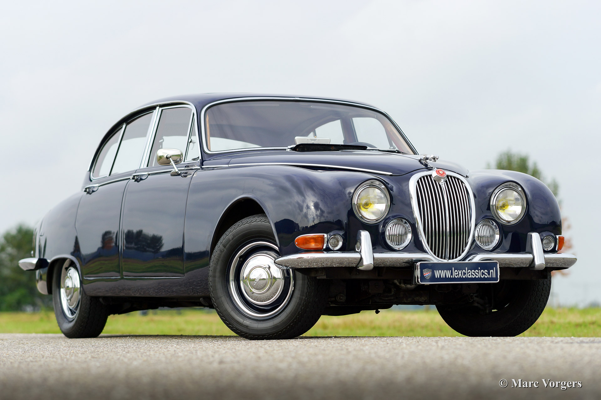 Jaguar S-type 3.4 Litre saloon, year 1965. Chassis number P1B25539BW. Colour dark blue with a red leather interior. The delightful Jaguar S-type is the bigger brother of the Jaguar Mk II. This automobile was extensively restored a few years ago and the car is in superb (excellent+) condition. The automobile was sold new in the Netherlands where it started it's service as the board limousine of the 'Van Gend & Loos' company. The Jaguar features a very plush and luxurious interior, automatic gearbox, radio, two additional driving lamps at front and a factory original sliding roof! Further more the car comes well documented with service invoices and a Heritage certificate.