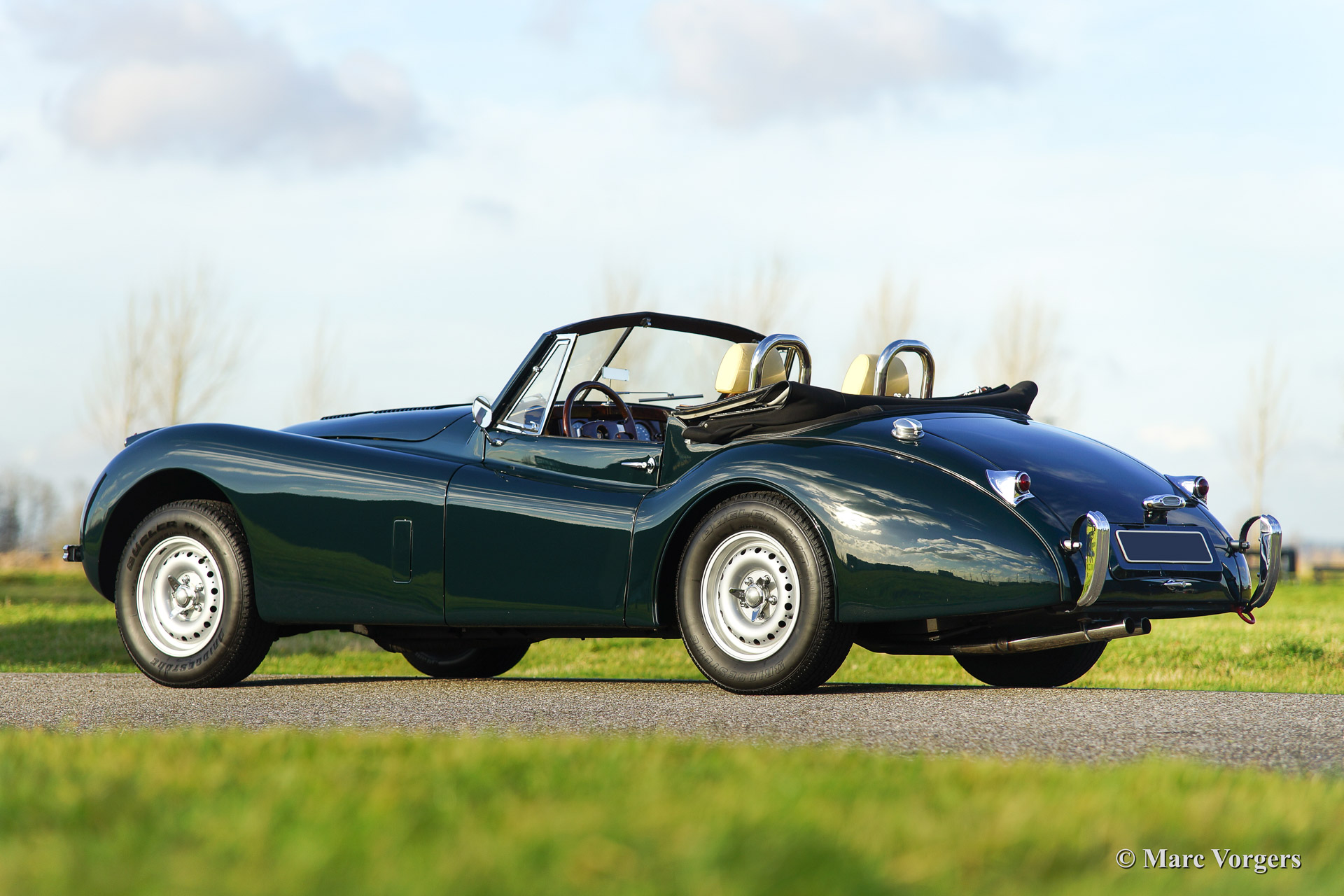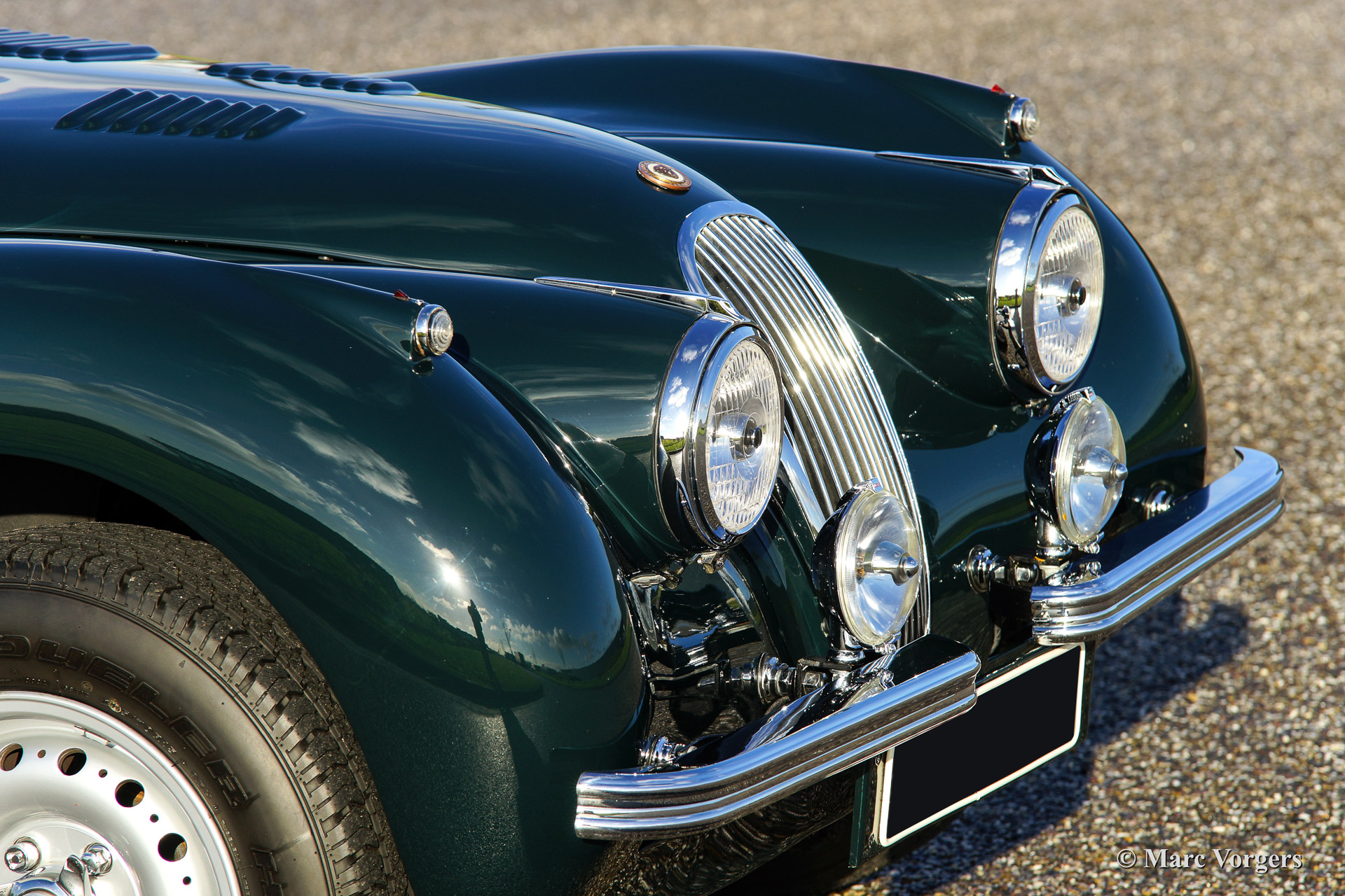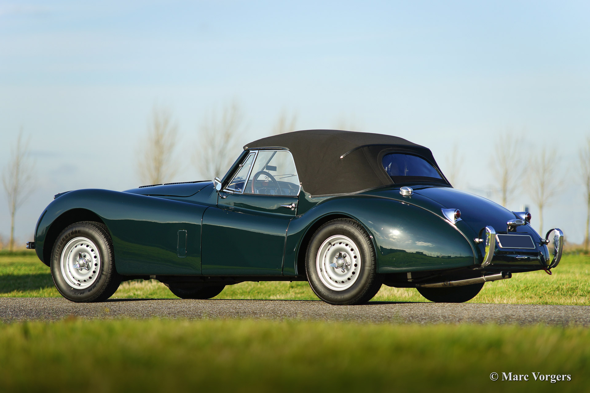 Jaguar XK 120 Drophead Coupe (DHC), bouwjaar 1954. Kleur 'British Racing Green' met een beige lederen interieur afgebiest met bruine 'piping'. Bruin tapijt. Zwarte mohair soft top. Deze XK 120 DHC is nieuw verkocht in Nederland, het originele linnen kenteken is nog aanwezig. De automobile werd uitvoerig gerestaureerd in het jaar 2004. Modificaties/verbeteringen: Special Equipment (C-type) cilinderkop, Getrag 5-versnellingsbak, speciale stoelen, 4 punts gordels, GTI rally twin, louvres in de motorkap voor betere koeling, 123 elektronische ontsteking, 2 inch 'sand-cast' carburateurs, Dunlop lichtmetalen wielen.