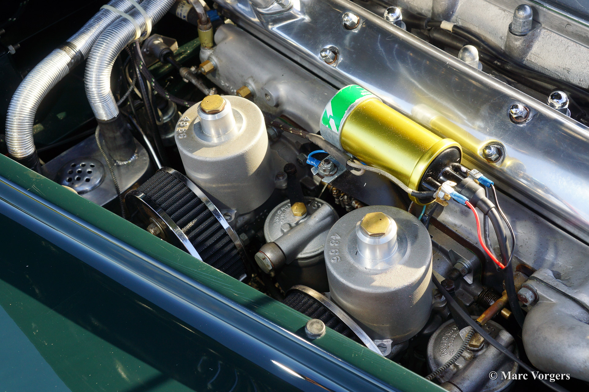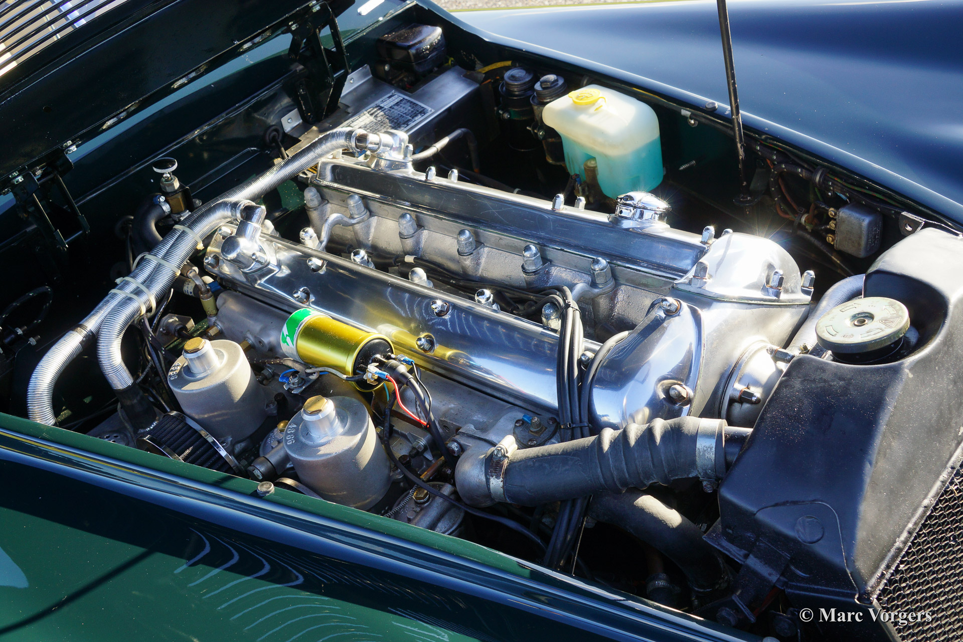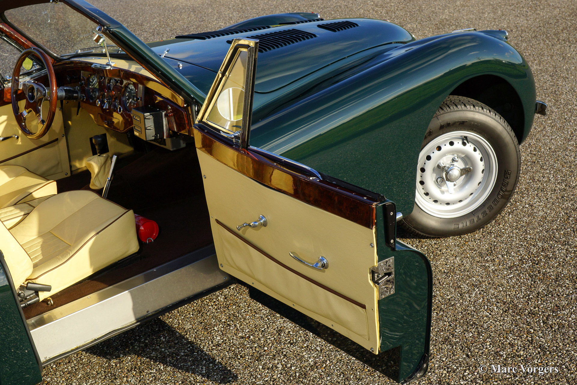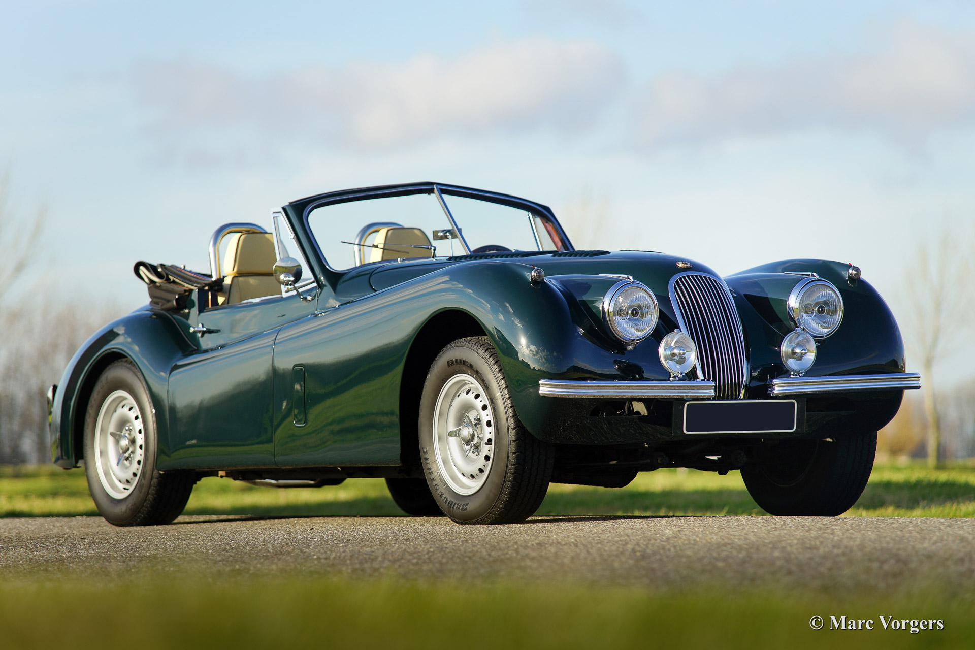Jaguar XK 120 Drophead Coupe (DHC), bouwjaar 1954. Kleur 'British Racing Green' met een beige lederen interieur afgebiest met bruine 'piping'. Bruin tapijt. Zwarte mohair soft top. Deze XK 120 DHC is nieuw verkocht in Nederland, het originele linnen kenteken is nog aanwezig. De automobile werd uitvoerig gerestaureerd in het jaar 2004. Modificaties/verbeteringen: Special Equipment (C-type) cilinderkop, Getrag 5-versnellingsbak, speciale stoelen, 4 punts gordels, GTI rally twin, louvres in de motorkap voor betere koeling, 123 elektronische ontsteking, 2 inch 'sand-cast' carburateurs, Dunlop lichtmetalen wielen.