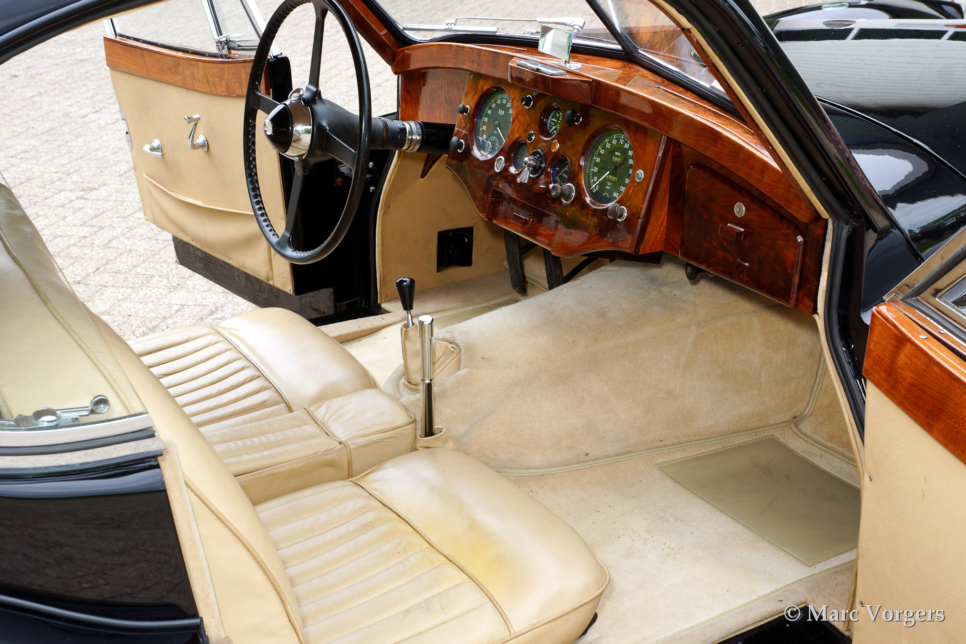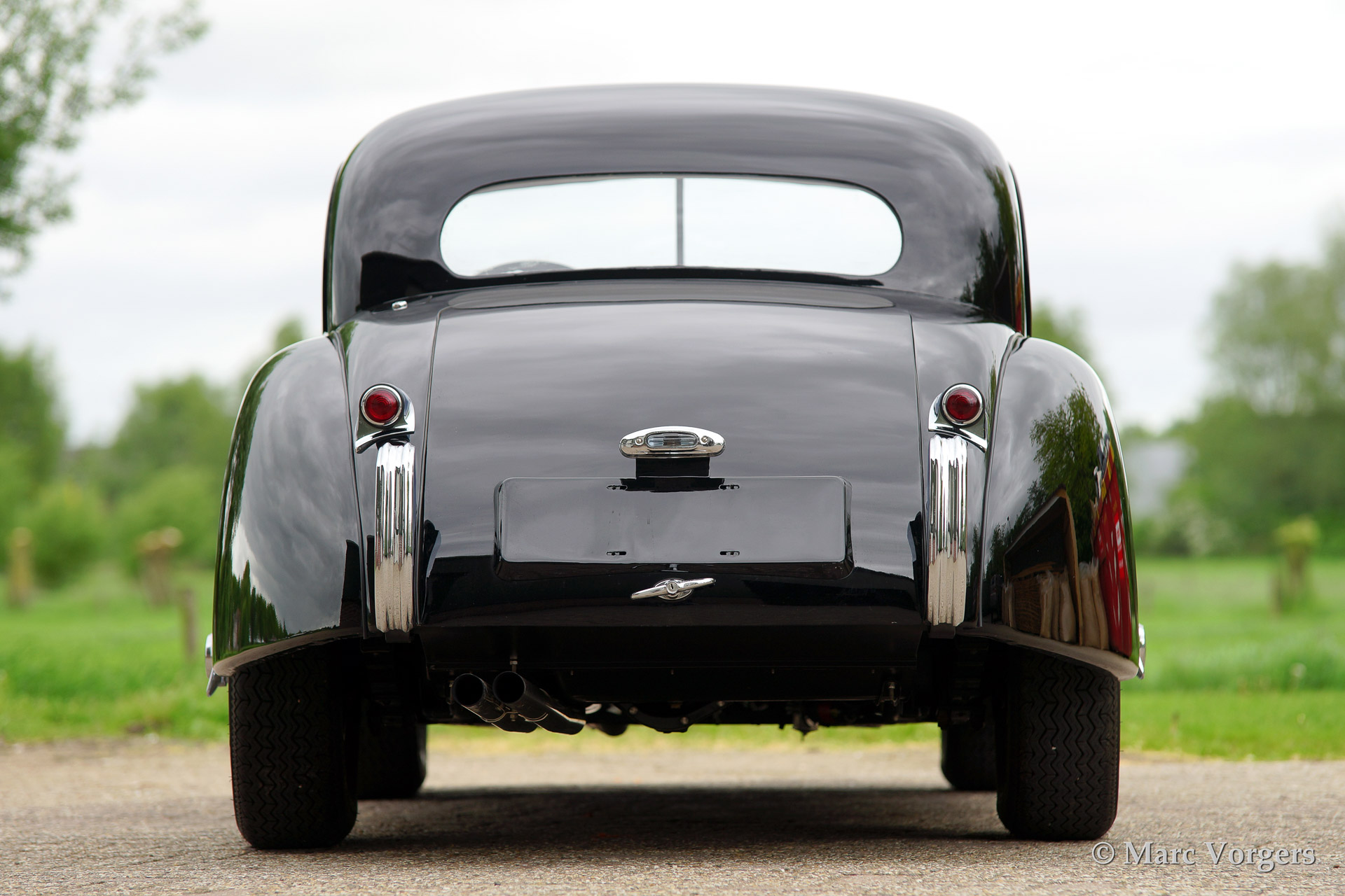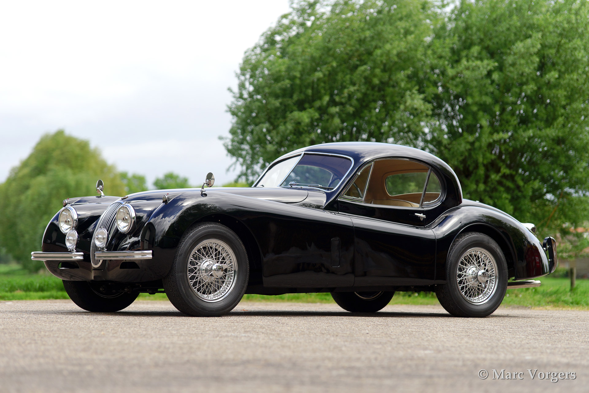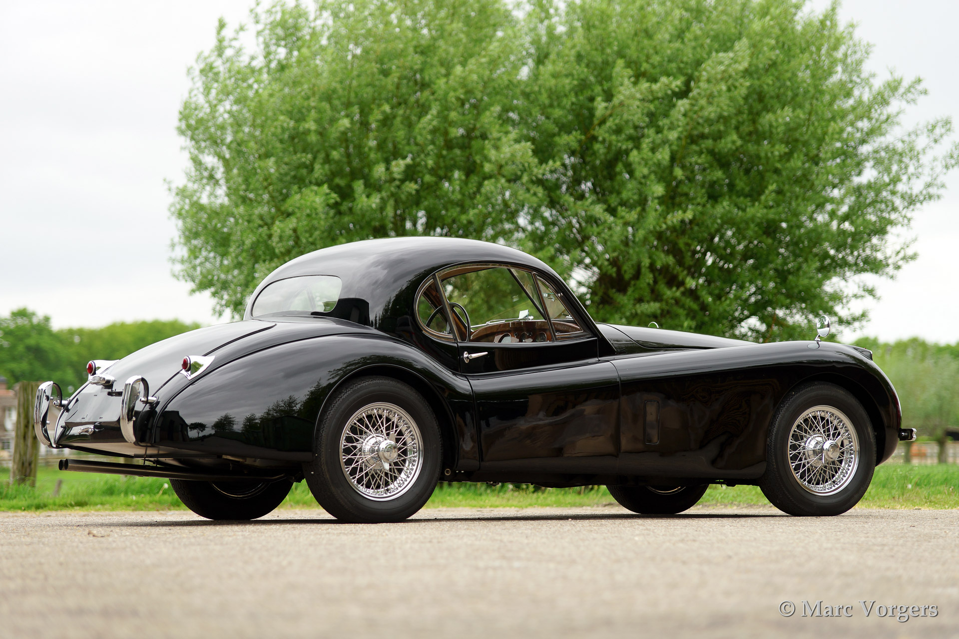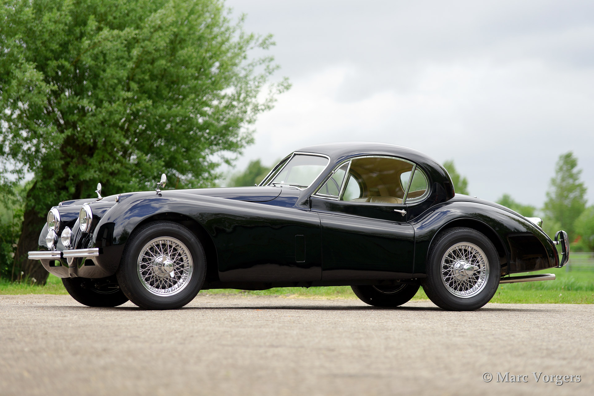 Jaguar XK 120 Fixed Head Coupe (FHC), bouwjaar 1954. Kleur zwart met een beige lederen interieur. Deze prachtige Jaguar XK 120 is voorzien van een handgeschakelde vier versnellingsbak, 16 inch chroom spaakwielen, extra lampen aan de voorzijde - en de koplampen zijn van het fraaie 'tripod' type.