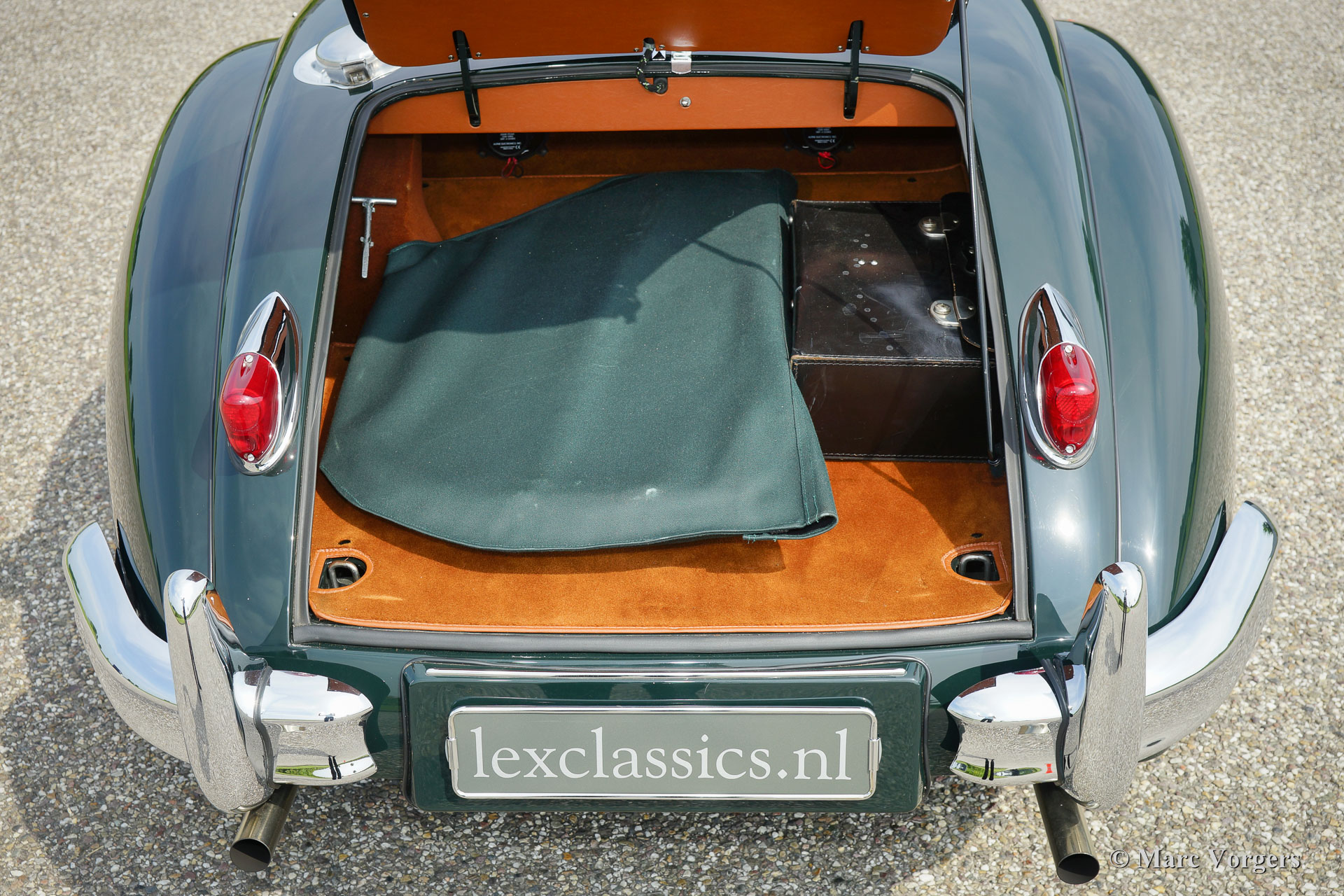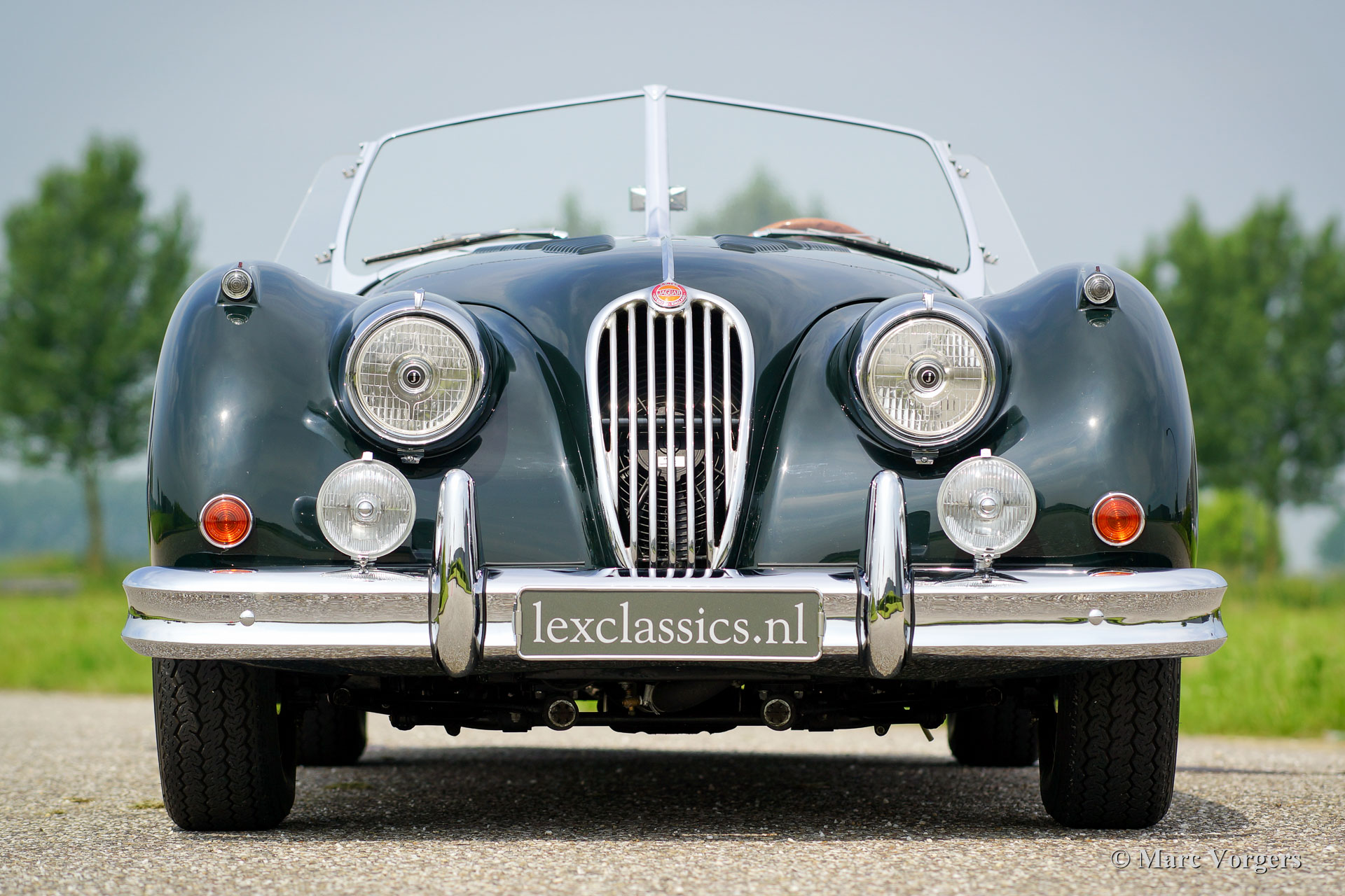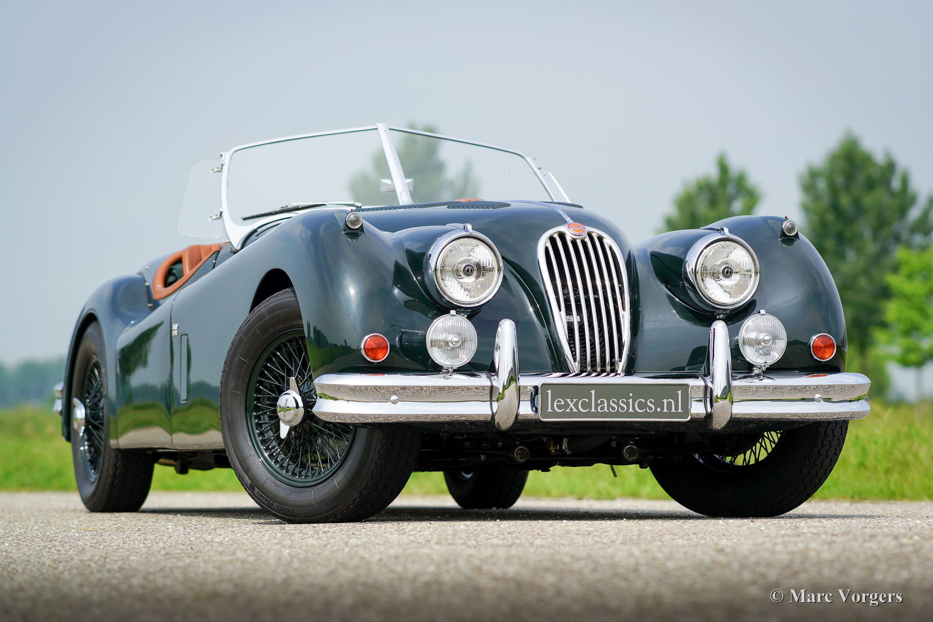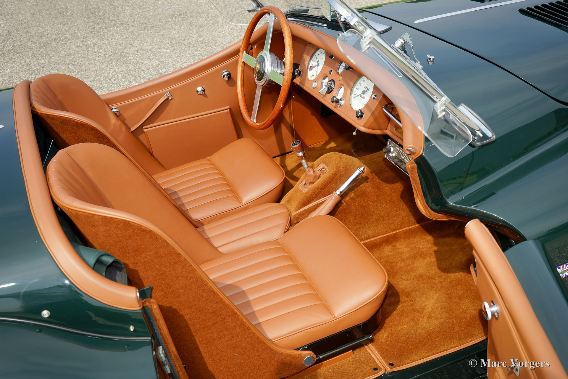 Jaguar XK 140 OTS, jaar 1955. Kleur British Racing Green met een cognac kleurig vol-lederen interieur en bijpassend tapijt. Groene mohair soft-top met originele groen beklede zijramen en een groene mohair tonneaucover. Deze fantastische Jaguar XK 140 Open Two Seater (OTS), ook wel ‘roadster’ genoemd verkeert in sublieme topstaat; concours! De automobiel werd uitvoerig en perfect in Nederland gerestaureerd, gereviseerd en weer opgebouwd, foto´s van deze uitvoerige restauratie zijn aanwezig. Hier en daar werden kleine en fraaie ‘period correcte’ sportieve modificaties aangebracht. Zo is er een bijzonder fraaie ‘quick-filler’ race tankdop aangebracht en ‘louvres’ in de motorkap voor betere koeling van de motorruimte. Het interieur is voorzien van perfect zittende klassieke kuipstoelen, meters met witte wijzerplaten en een prachtige radio. Verder is de auto voorzien van in carrosseriekleur gelakte spaakwielen, een vijfversnellingsbak, Jaguar koplampen, een rvs-uitlaatsysteem, Moto-Lita sportstuur met houten rand, schrijfremmen rondom, gescheiden remsysteem, wind-deflectors aan de voorruit, wisselstroomdynamo en Lucas mistlampen aan de voorzijde. Dit is een van de beste en fijnst rijdende Jaguar XK’s die wij ooit reden; een topexemplaar!
