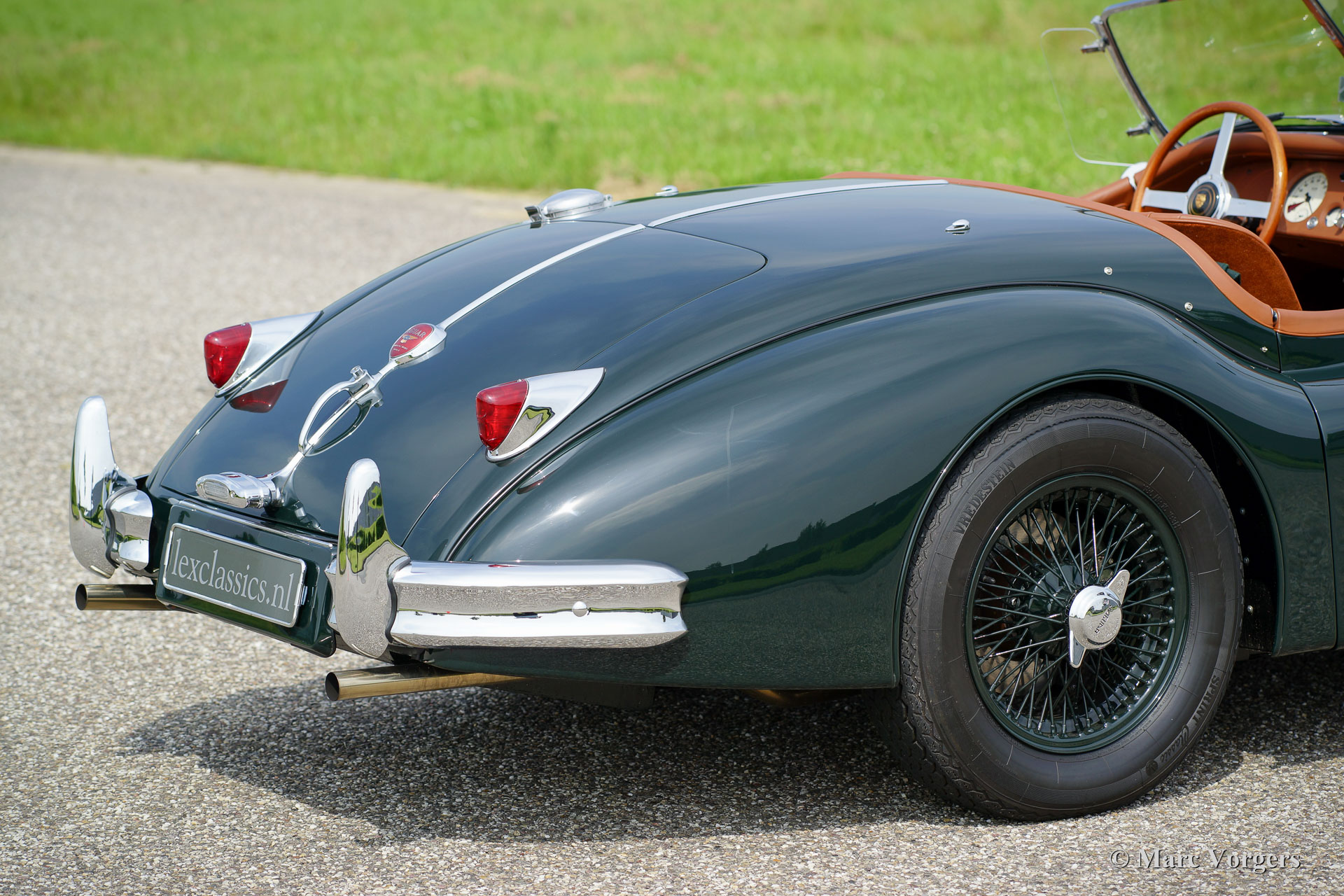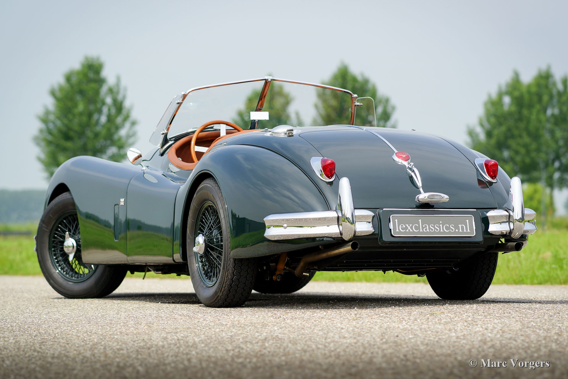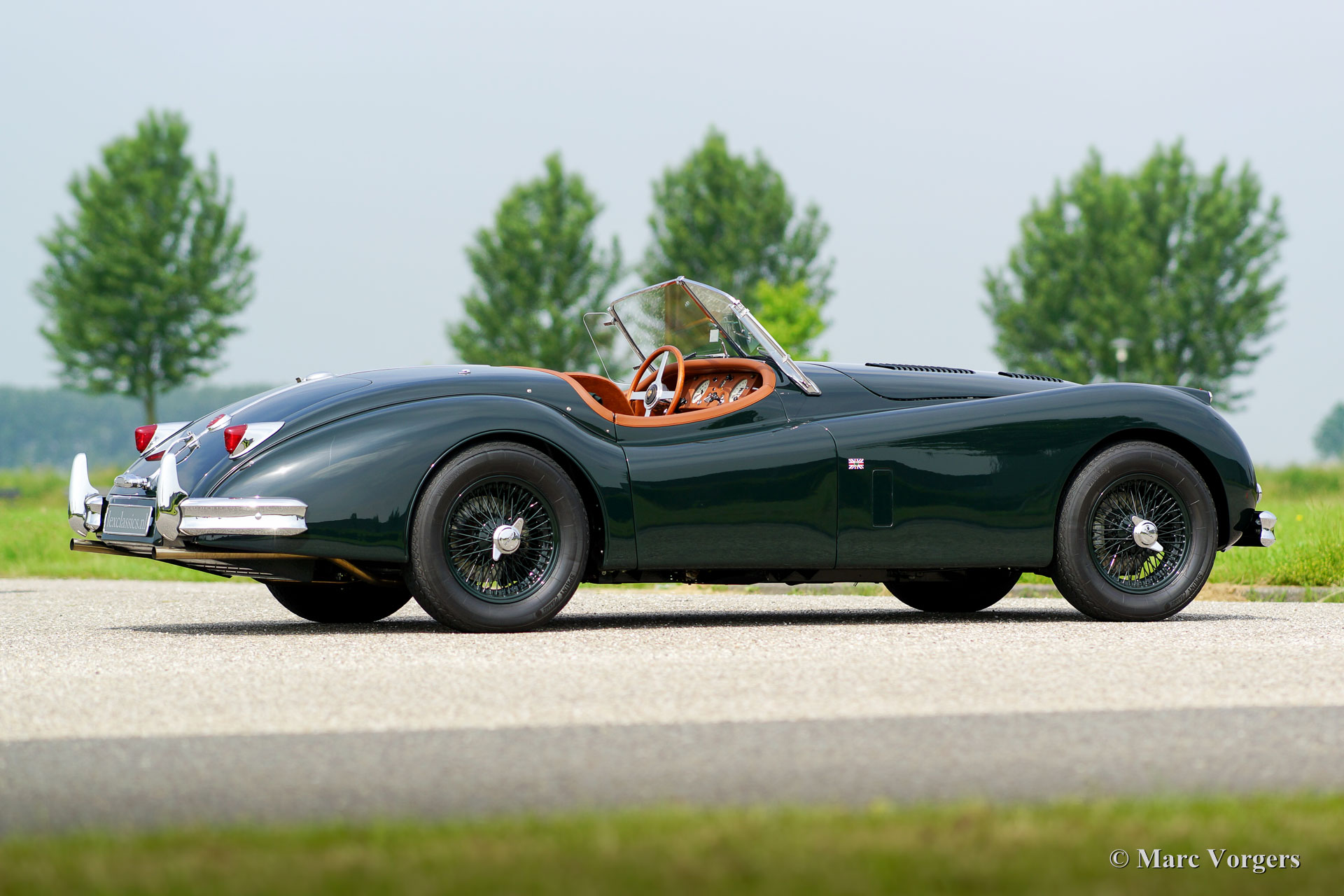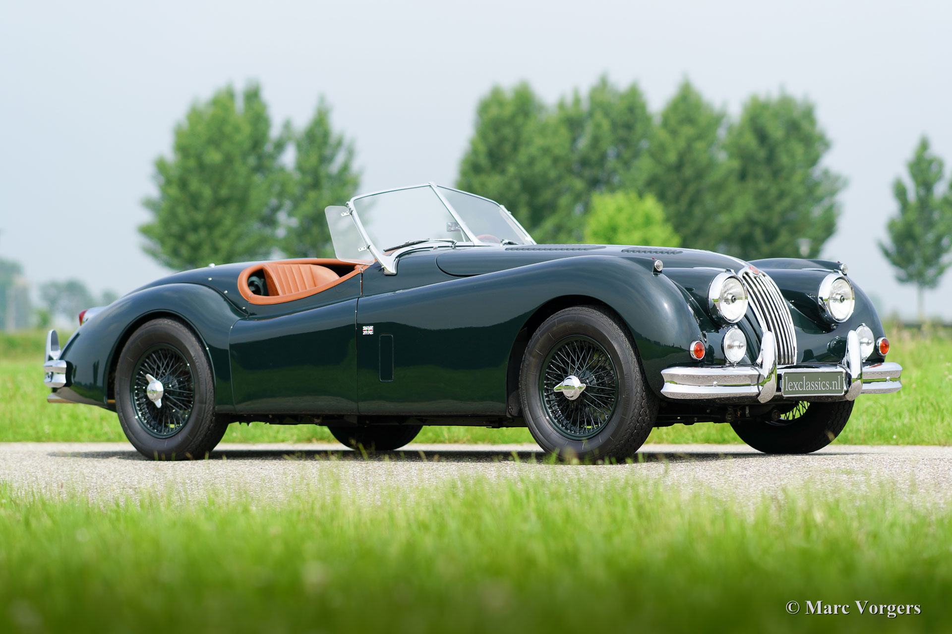 Jaguar XK 140 OTS, jaar 1955. Kleur British Racing Green met een cognac kleurig vol-lederen interieur en bijpassend tapijt. Groene mohair soft-top met originele groen beklede zijramen en een groene mohair tonneaucover. Deze fantastische Jaguar XK 140 Open Two Seater (OTS), ook wel ‘roadster’ genoemd verkeert in sublieme topstaat; concours! De automobiel werd uitvoerig en perfect in Nederland gerestaureerd, gereviseerd en weer opgebouwd, foto´s van deze uitvoerige restauratie zijn aanwezig. Hier en daar werden kleine en fraaie ‘period correcte’ sportieve modificaties aangebracht. Zo is er een bijzonder fraaie ‘quick-filler’ race tankdop aangebracht en ‘louvres’ in de motorkap voor betere koeling van de motorruimte. Het interieur is voorzien van perfect zittende klassieke kuipstoelen, meters met witte wijzerplaten en een prachtige radio. Verder is de auto voorzien van in carrosseriekleur gelakte spaakwielen, een vijfversnellingsbak, Jaguar koplampen, een rvs-uitlaatsysteem, Moto-Lita sportstuur met houten rand, schrijfremmen rondom, gescheiden remsysteem, wind-deflectors aan de voorruit, wisselstroomdynamo en Lucas mistlampen aan de voorzijde. Dit is een van de beste en fijnst rijdende Jaguar XK’s die wij ooit reden; een topexemplaar!