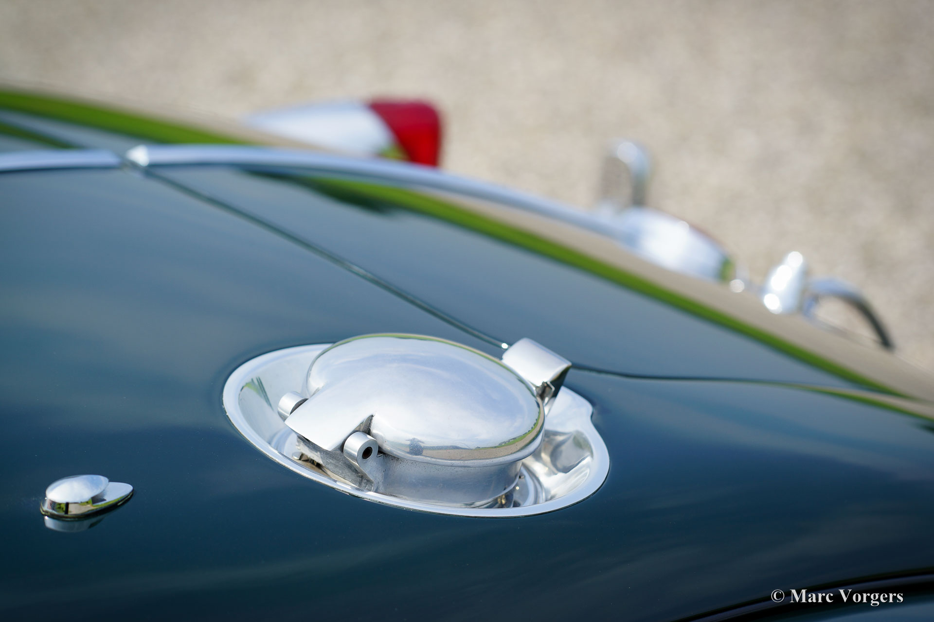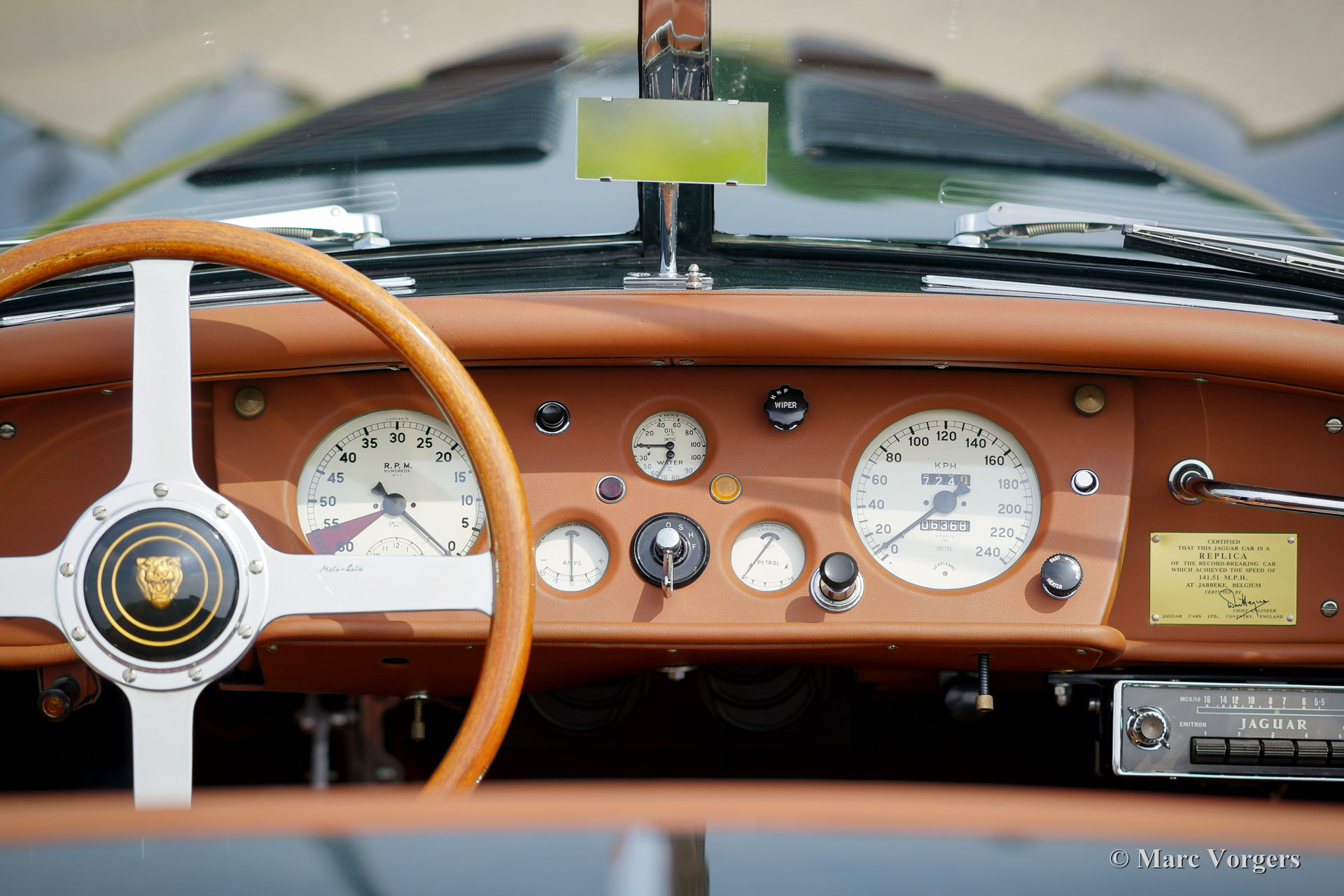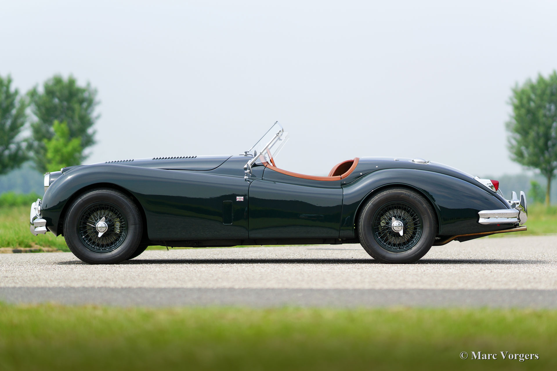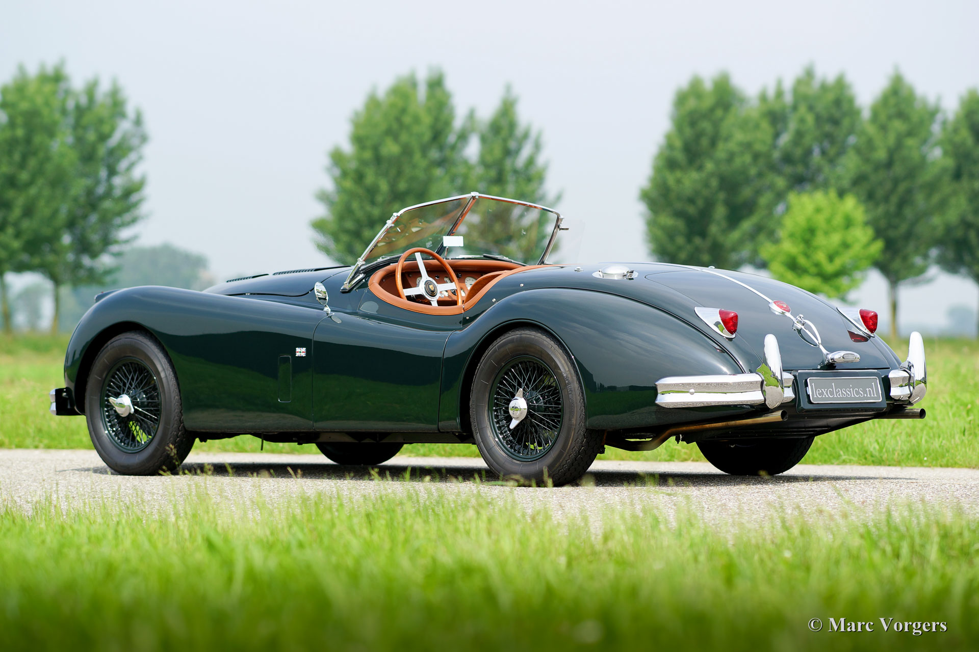 Jaguar XK 140 OTS, jaar 1955. Kleur British Racing Green met een cognac kleurig vol-lederen interieur en bijpassend tapijt. Groene mohair soft-top met originele groen beklede zijramen en een groene mohair tonneaucover. Deze fantastische Jaguar XK 140 Open Two Seater (OTS), ook wel ‘roadster’ genoemd verkeert in sublieme topstaat; concours! De automobiel werd uitvoerig en perfect in Nederland gerestaureerd, gereviseerd en weer opgebouwd, foto´s van deze uitvoerige restauratie zijn aanwezig. Hier en daar werden kleine en fraaie ‘period correcte’ sportieve modificaties aangebracht. Zo is er een bijzonder fraaie ‘quick-filler’ race tankdop aangebracht en ‘louvres’ in de motorkap voor betere koeling van de motorruimte. Het interieur is voorzien van perfect zittende klassieke kuipstoelen, meters met witte wijzerplaten en een prachtige radio. Verder is de auto voorzien van in carrosseriekleur gelakte spaakwielen, een vijfversnellingsbak, Jaguar koplampen, een rvs-uitlaatsysteem, Moto-Lita sportstuur met houten rand, schrijfremmen rondom, gescheiden remsysteem, wind-deflectors aan de voorruit, wisselstroomdynamo en Lucas mistlampen aan de voorzijde. Dit is een van de beste en fijnst rijdende Jaguar XK’s die wij ooit reden; een topexemplaar!