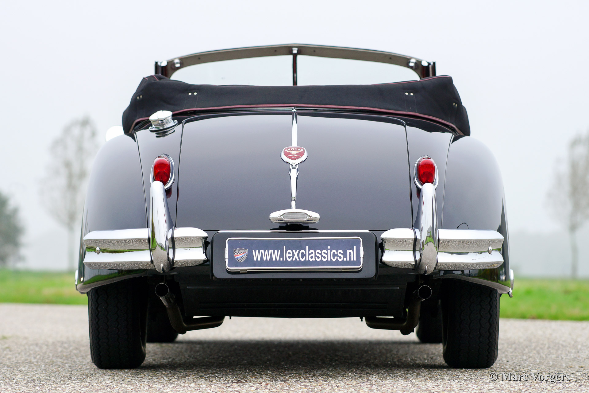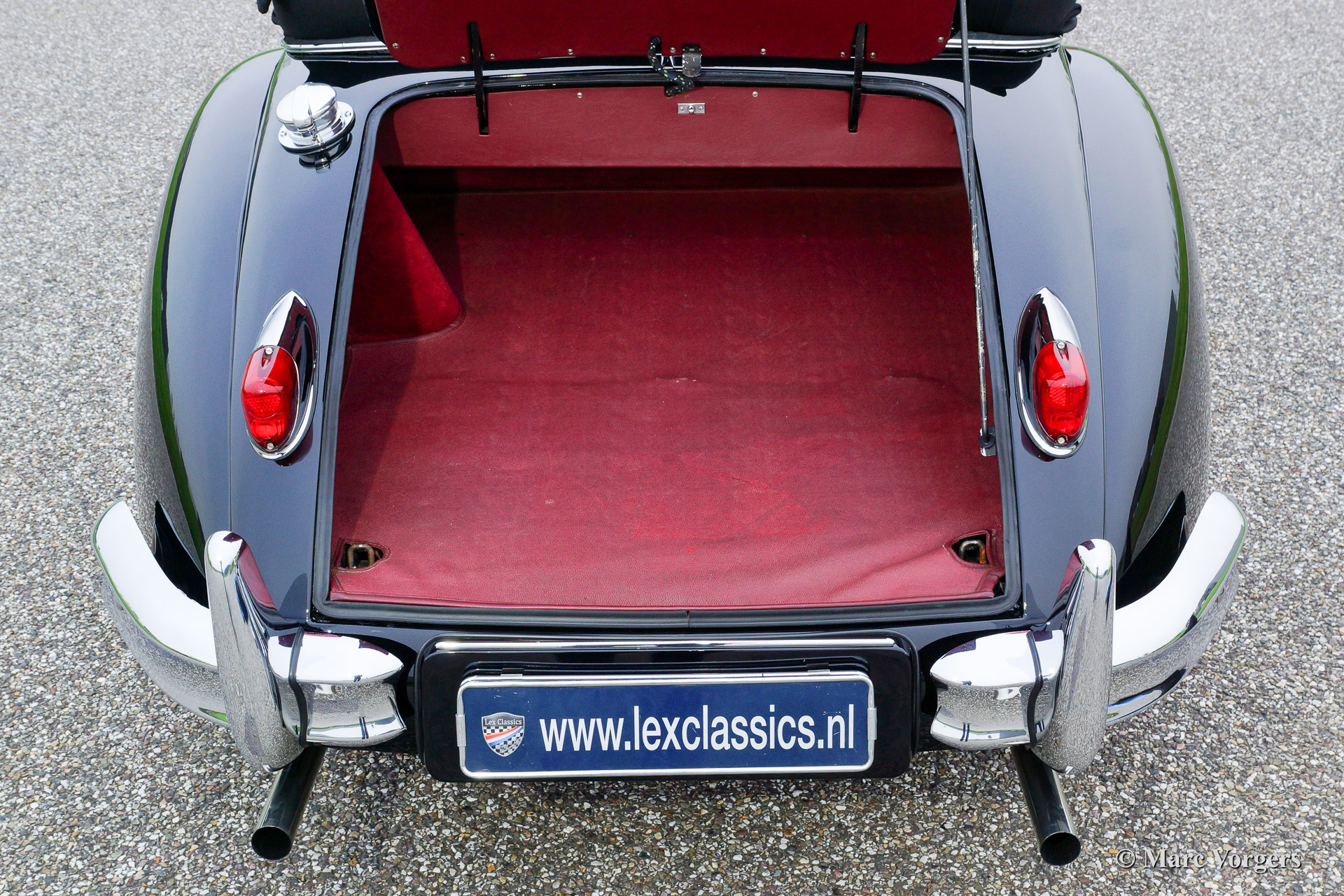 Jaguar XK 140 SE Drophead Coupe (DHC), year 1955. Chassis number: S817576, engine number: G 4073-8S, matching engine number. Body colour black, red leather interior with red carpet. Black mohair hood and hood cover. This fabulous Jaguar XK 140 DHC is a powerful SE model fitted with the C-type cylinder head and 2 inch S.U. carburettors! This fine Jaguar has been extensively restored in the past, has been meticulously serviced and maintained, and the car is in excellent condition. A photo reportage of the restoration is present. The car comes comprehensively documented with a Heritage certificate and restoration/service invoices. This XK 140 has known four owners from new.