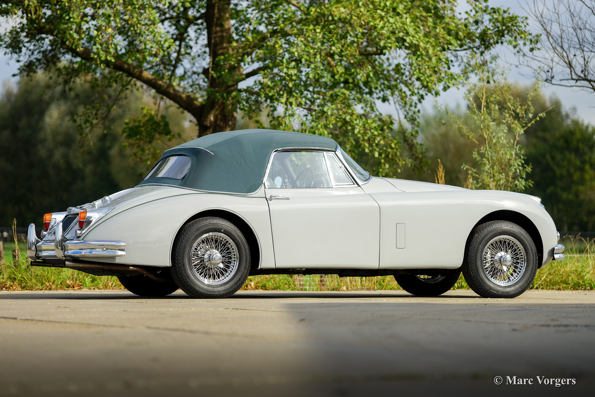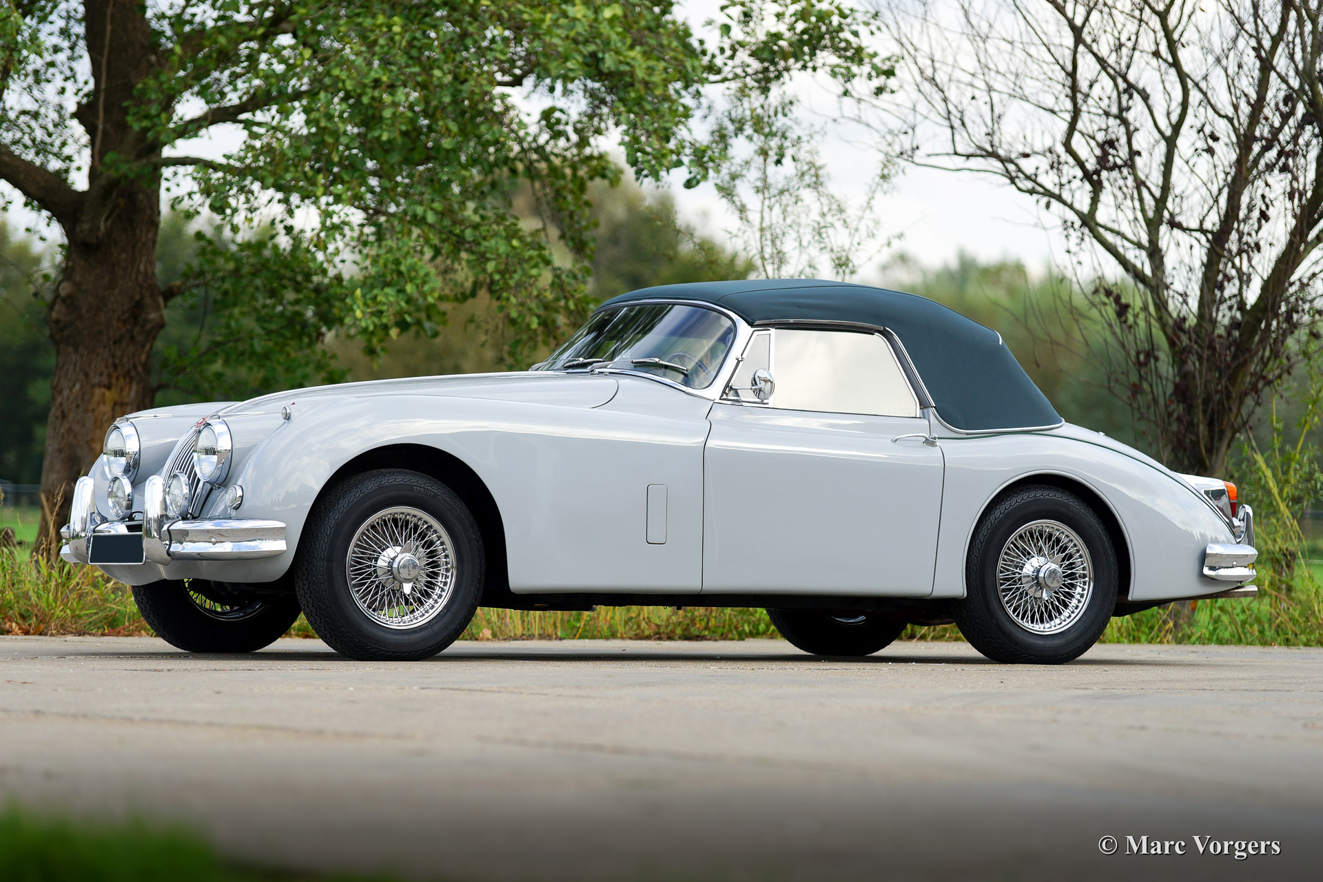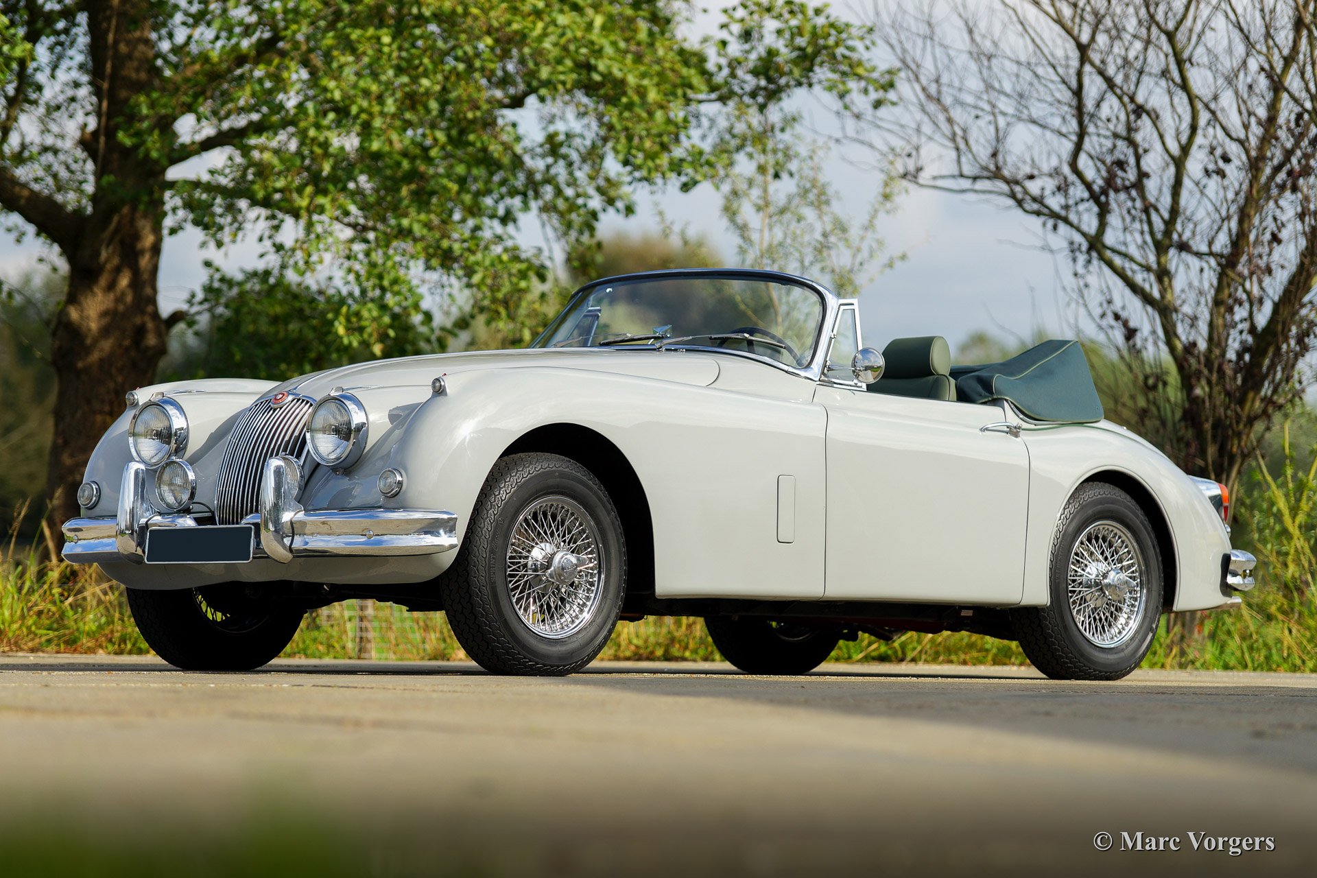 Jaguar XK 150 3.4 Litre Drop Head Coupe (DHC), jaar van eerste registratie 1960 (bouwjaar november 1958). Chassisnummer: S837842, motornummer: V5890-8C, matching numbers. Kleur 'Mist Grey' met een ‘suede green’ lederen interieur. Groene mohair kap en hood cover. Deze fantastische Jaguar XK 150 DHC verkeert in zeer goede staat en de auto rijdt perfect! De auto is voorzien van een handgeschakelde versnellingsbak met 4 versnellingen, comfortabele Jaguar XJ-S sportstoelen en verbeterde remmen rondom. Er werden slechts 2009 links gestuurde XK 150’s van dit type gebouwd.